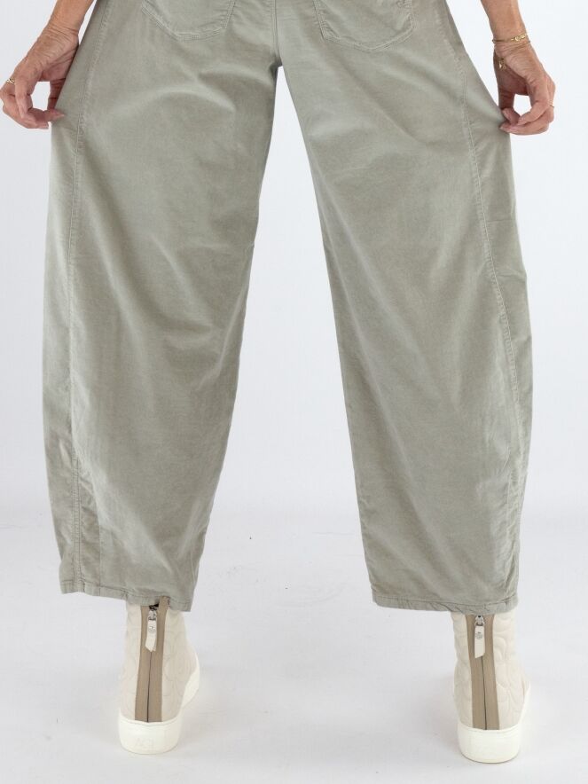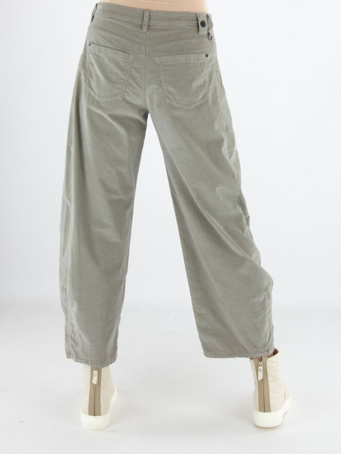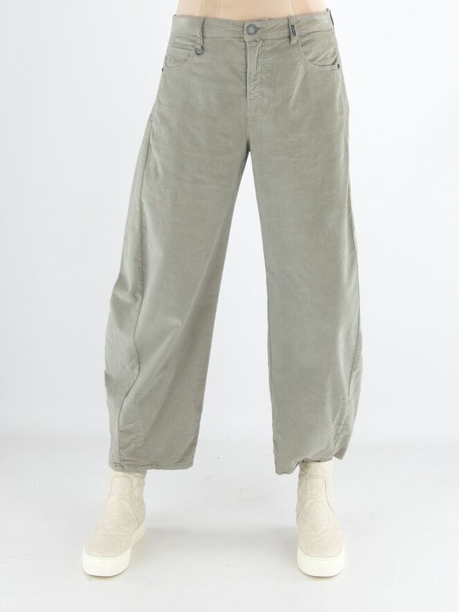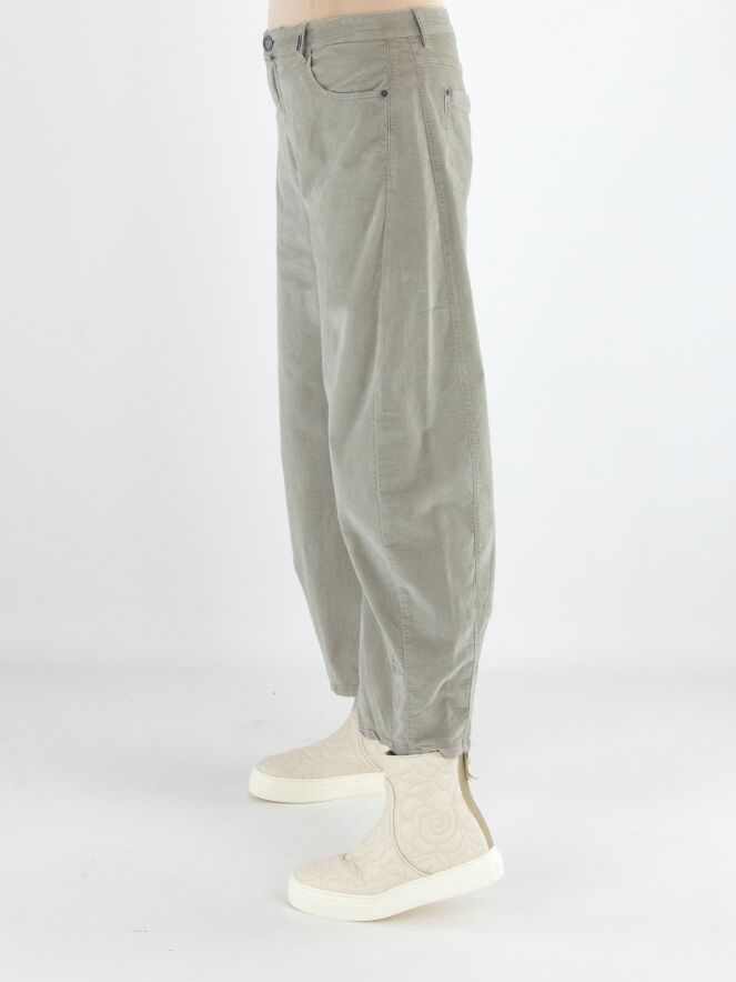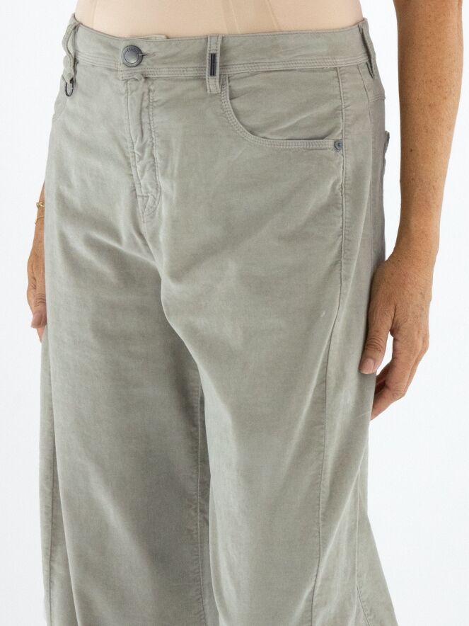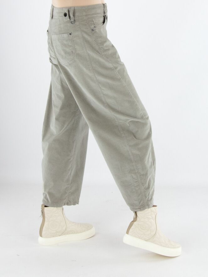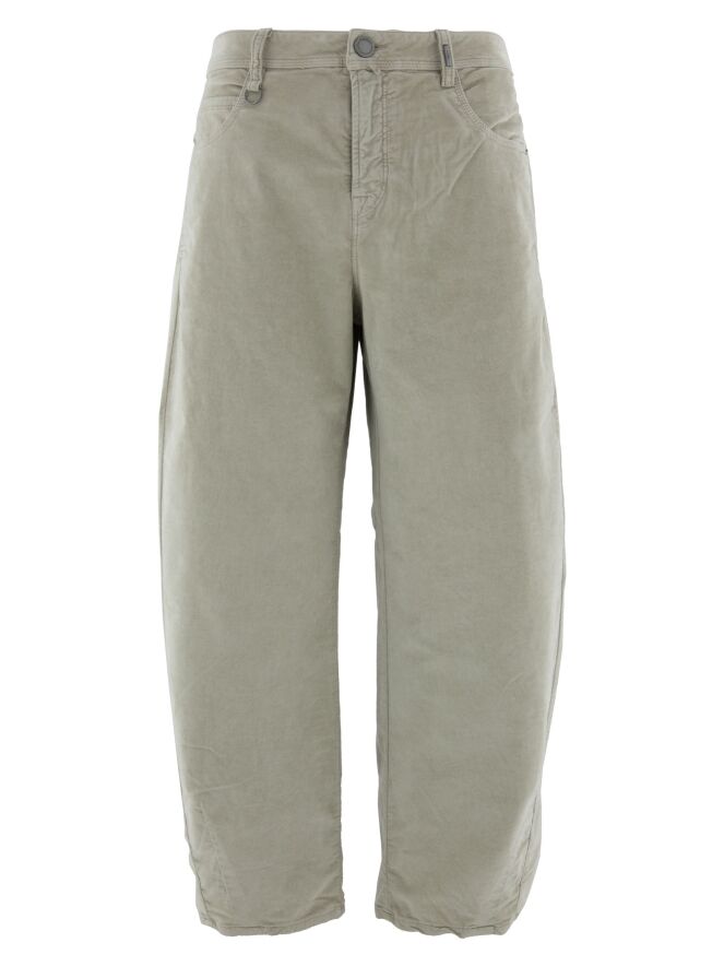 A soft velour pair of trousers from High in a beige/grey shade. The trousers have a 5-pocket design and the legs taper slightly at the bottom. These trousers can be washed at 30 degrees.