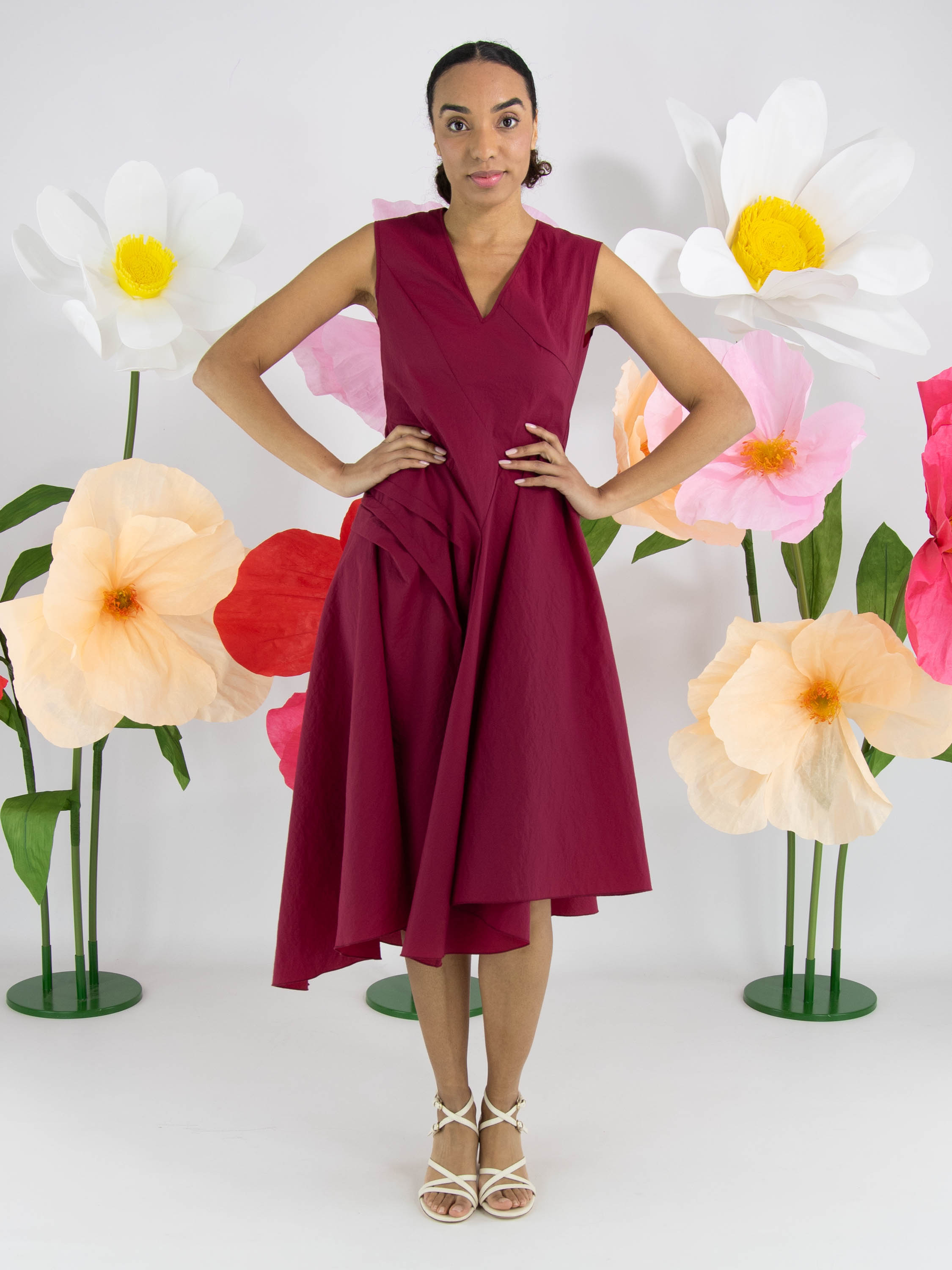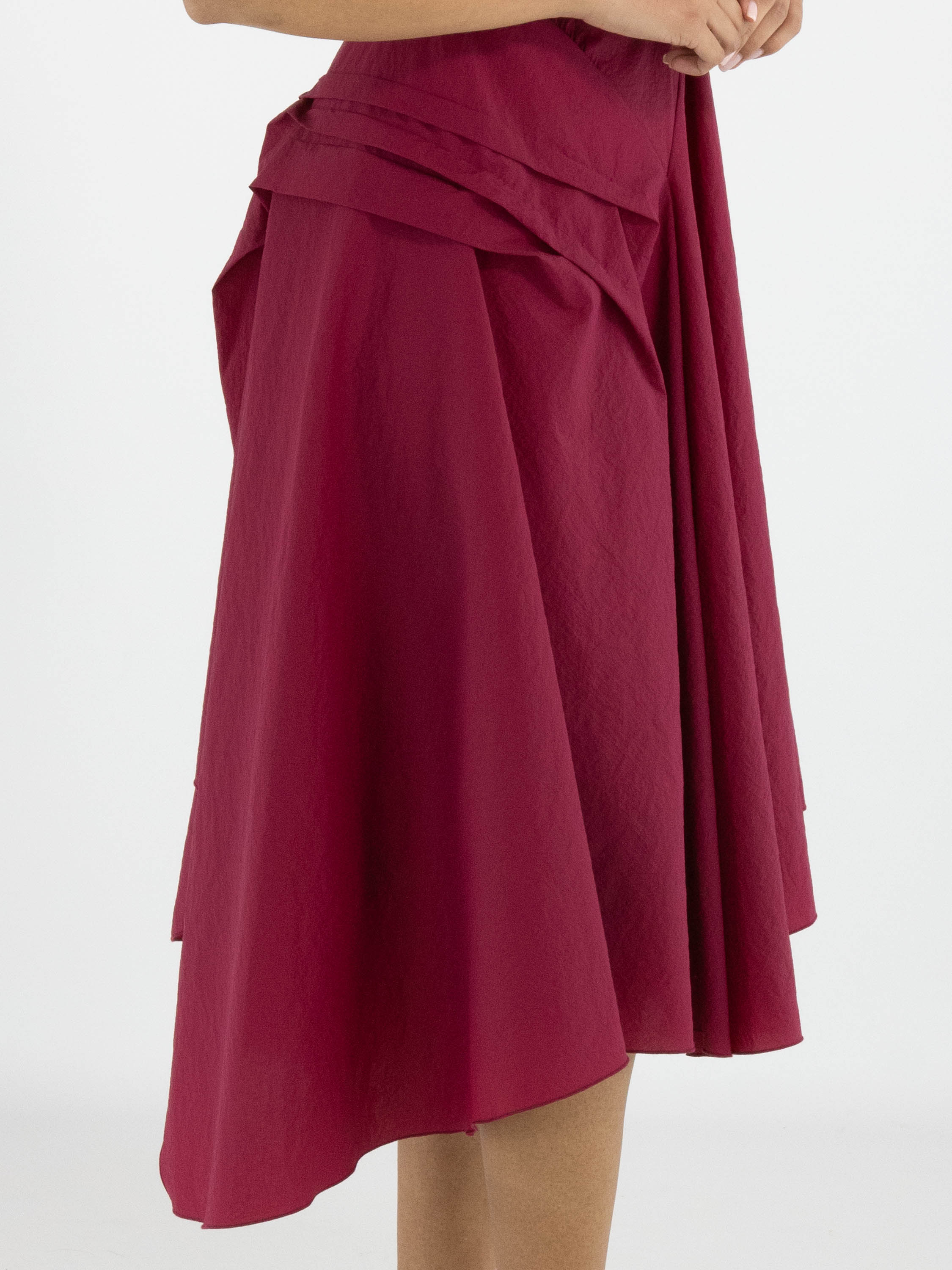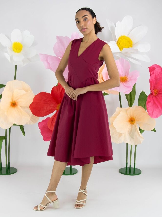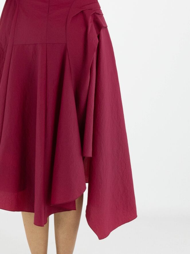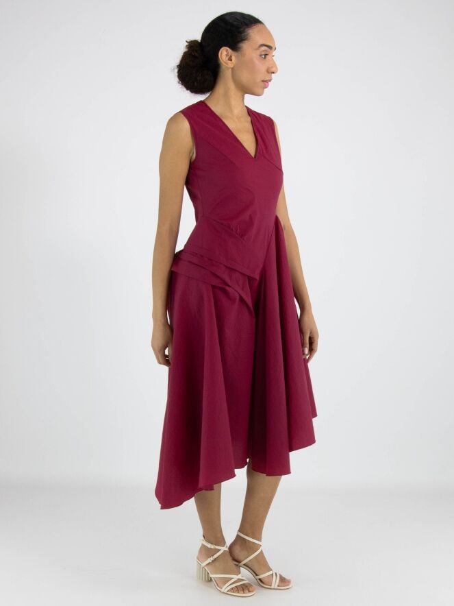 A dress from High Lab made from an opaque parachute fabric in raspberry red. The dress features a V-neckline, with a diagonal pleated seam running from the left shoulder to the right side of the waist. At the left side of the waist, three pleated folds are added. From the waist down, the dress flares out. This dress can be washed at 30 degrees.