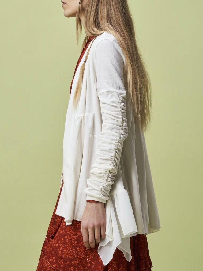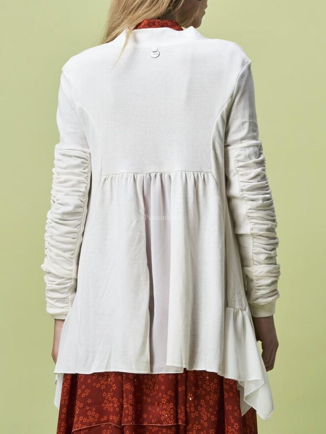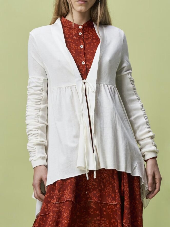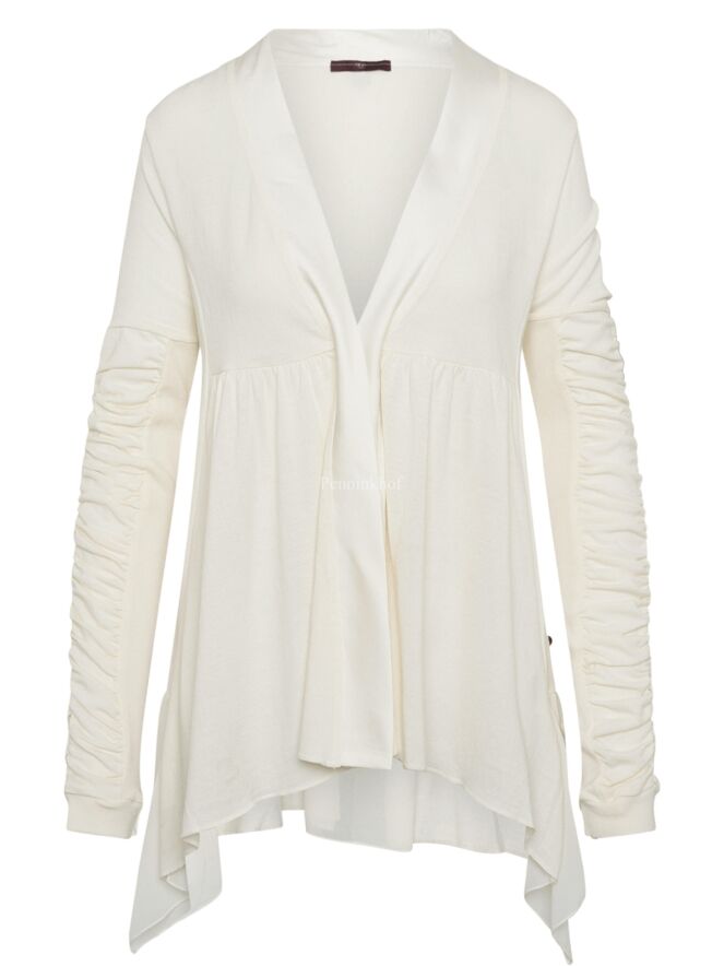 A cardigan by High in a creamy white colour. At waist level is a stitched seam from which the fabric is delicately pleated. The closure is with a drawstring. The top of the long sleeves is pleated. This cardigan may be washed by hand.