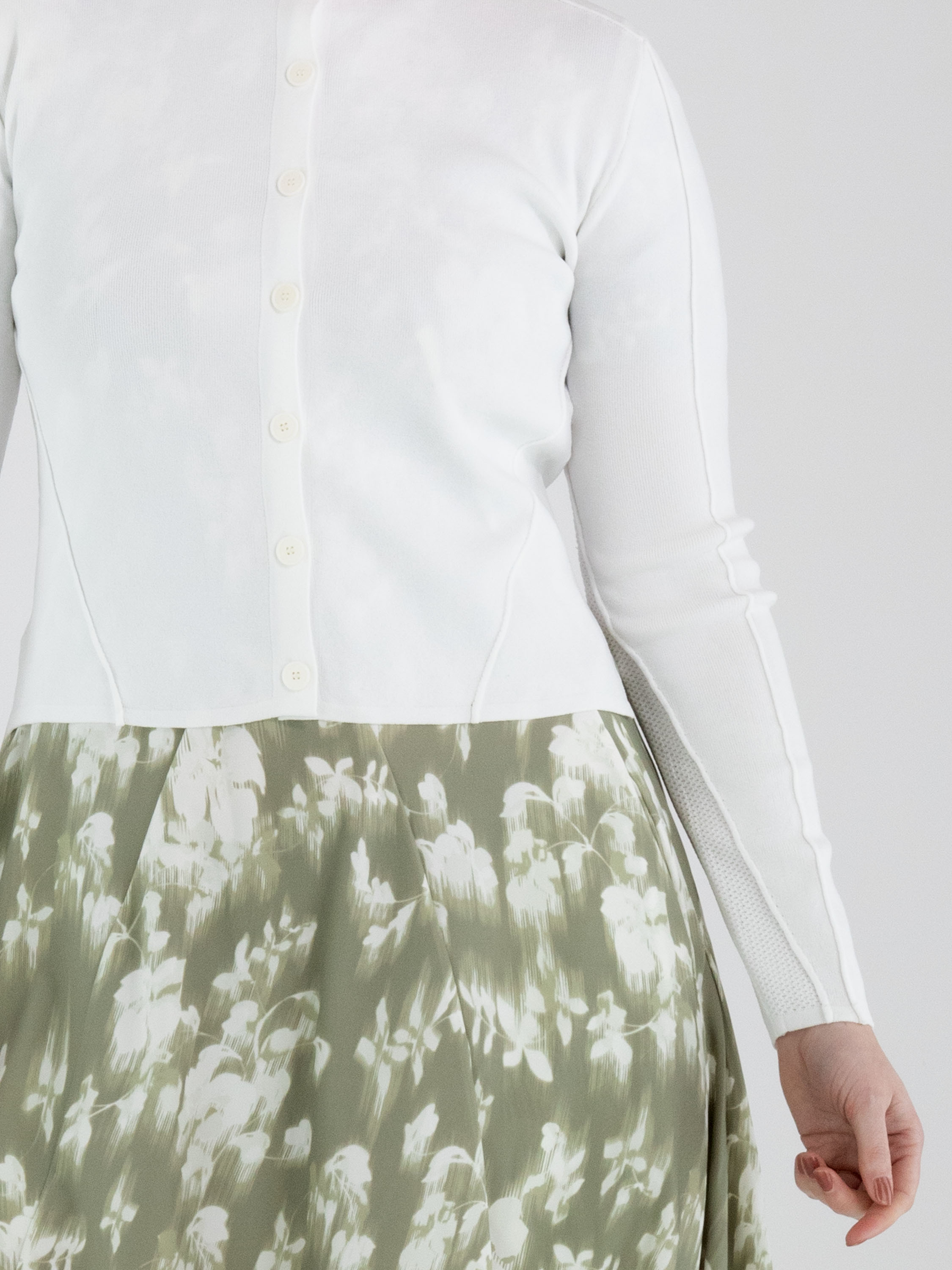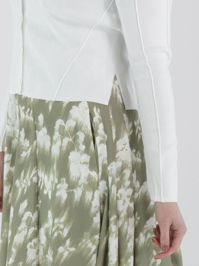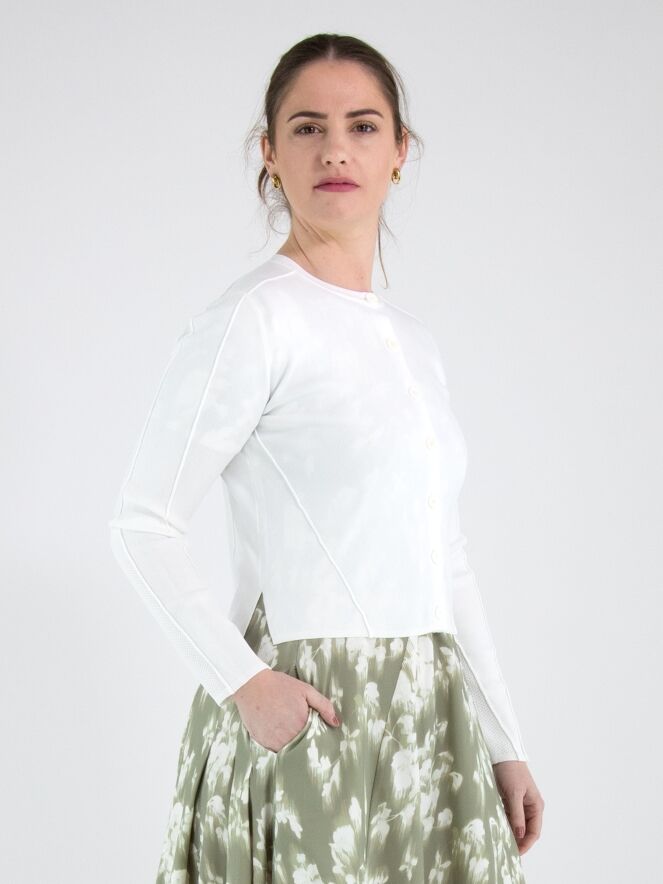 A short cardigan from High in an off-white colour. The fabric features a finely ribbed structure. The cardigan has a button fastening with seven off-white buttons. The lower part of the long sleeves is made from a perforated fabric. This structure continues in a wide band towards the back. This cardigan can be hand-washed.