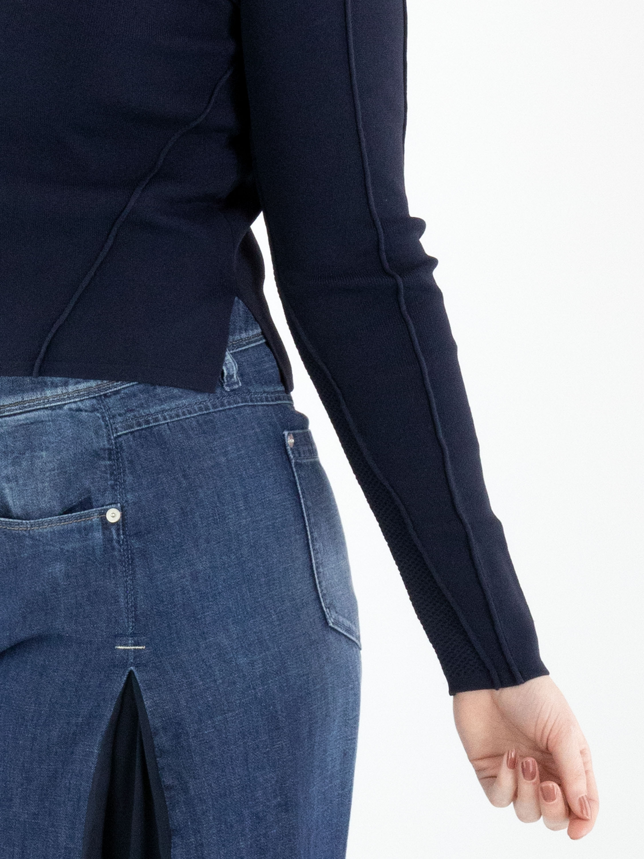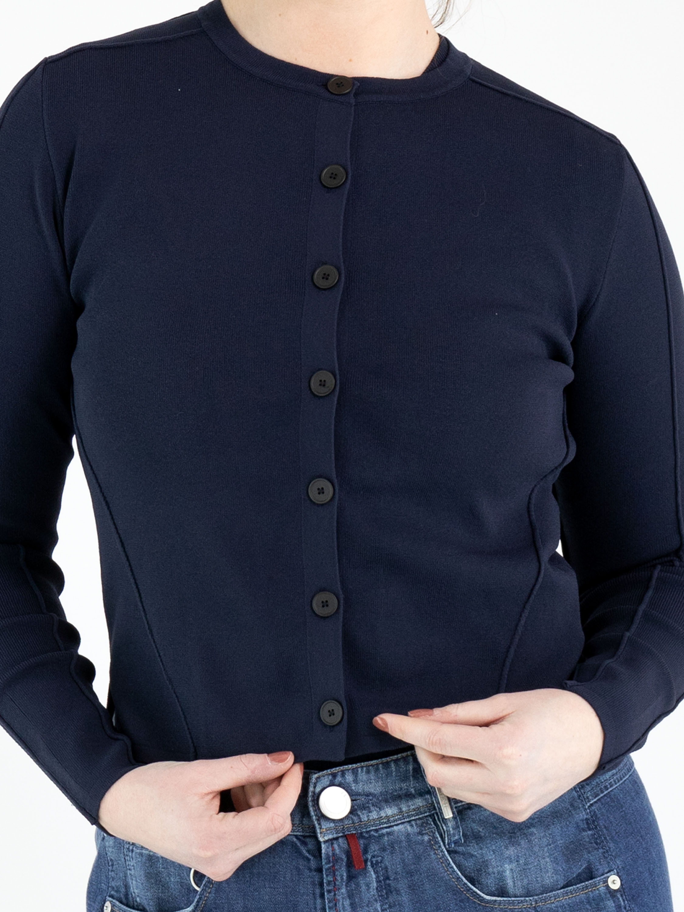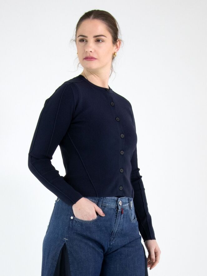 A short cardigan from High in a navy blue colour. The fabric has a finely ribbed structure. The cardigan features a button fastening with seven navy blue buttons. The lower part of the long sleeves is made from a perforated fabric. This structure continues in a wide band across the back. This cardigan can be hand-washed.
