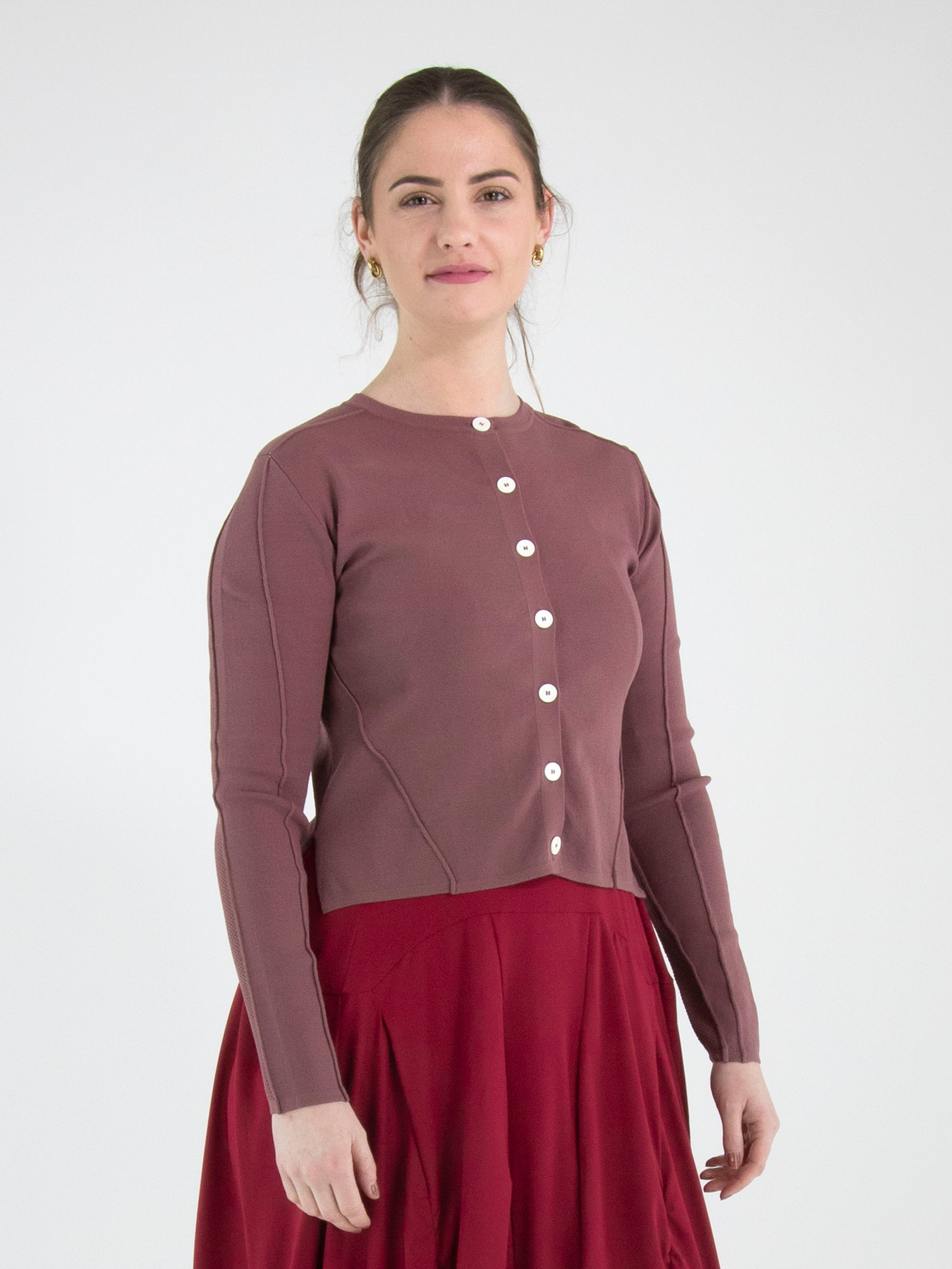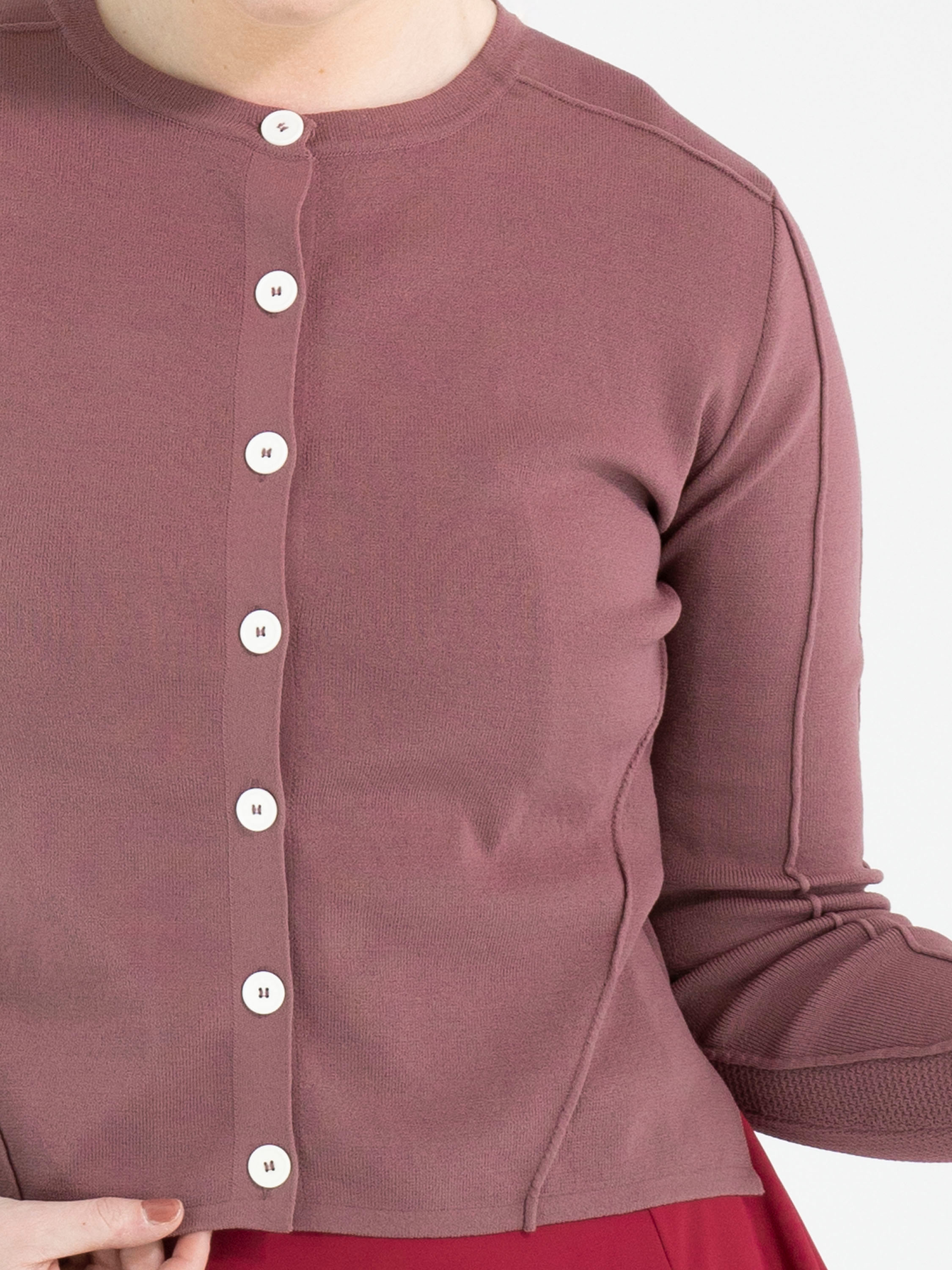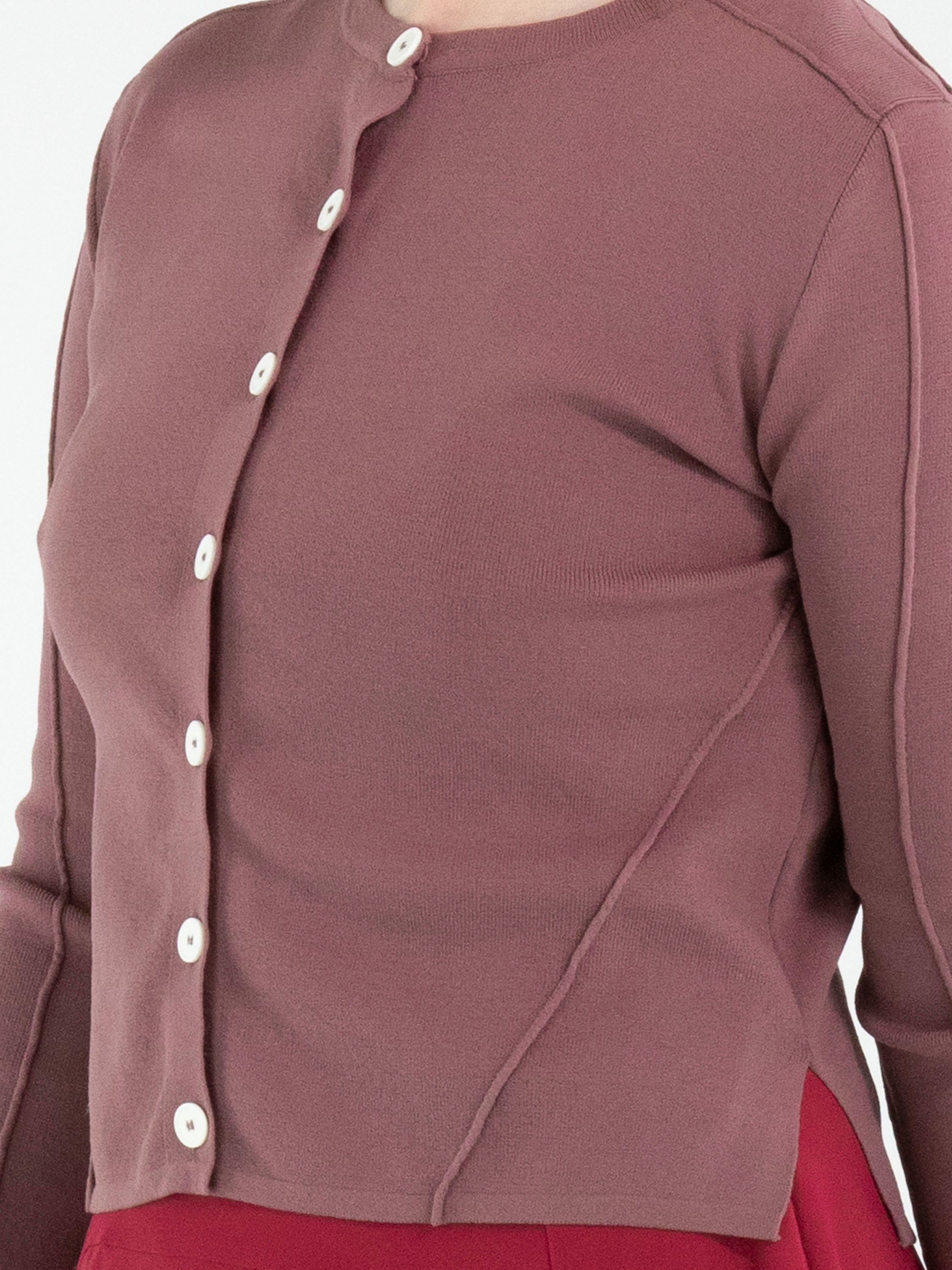 A short cardigan from High in a raspberry red colour. The fabric has a finely ribbed structure. The cardigan features a button fastening with seven off-white buttons. The lower part of the long sleeves is made from a perforated fabric. This structure continues in a wide band across the back. This cardigan can be hand-washed.