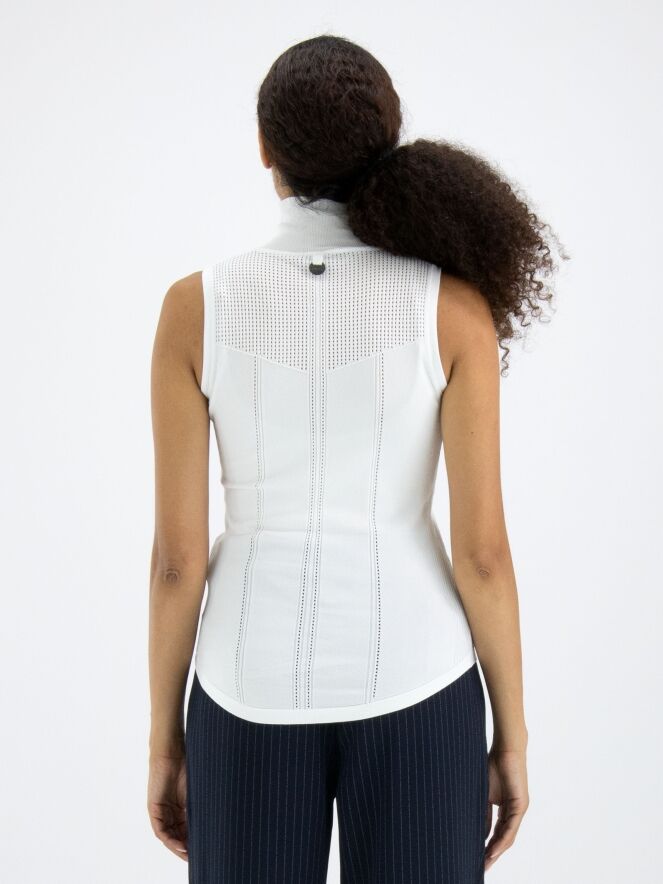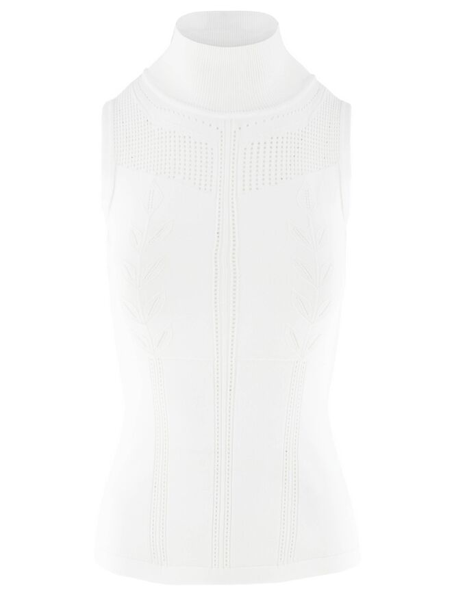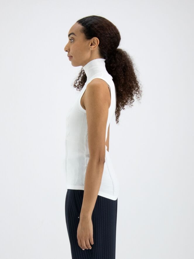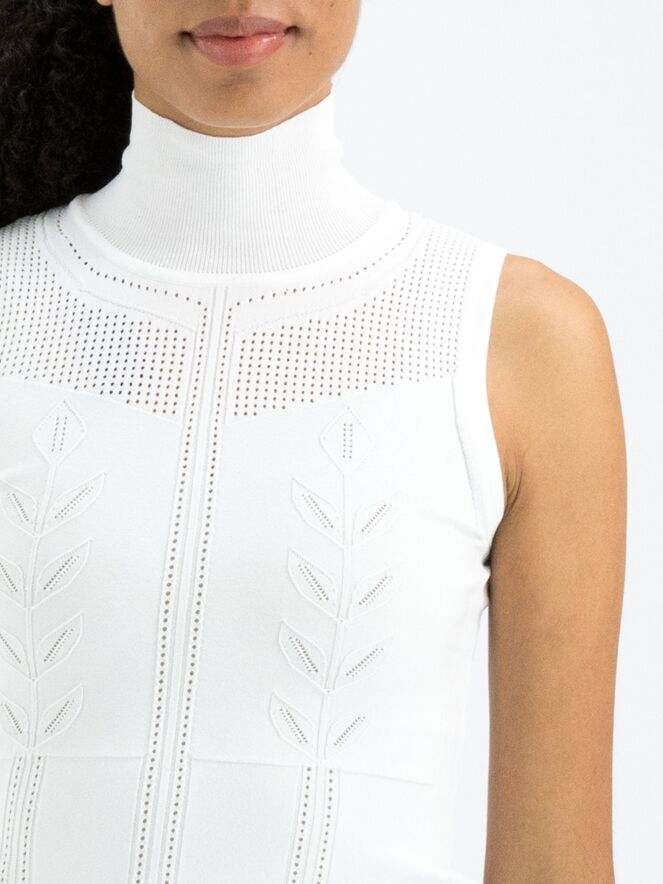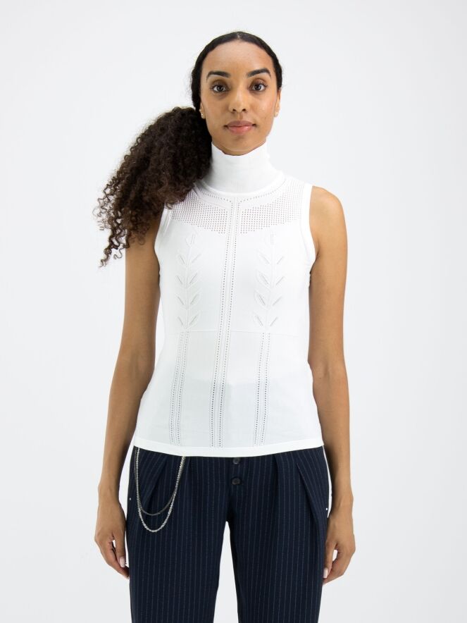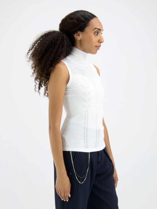 A top from High in cream white. The top features a turtleneck with a finely ribbed knit cuff. From the neck to the bust, the fabric is perforated. From the bust to the waist, the fabric has a leaf pattern with diagonal openwork lines. From the waist, there are some vertical openwork lines in the fabric. At the back, the vertical openwork lines start directly from the perforated fabric. This top can be hand washed.
