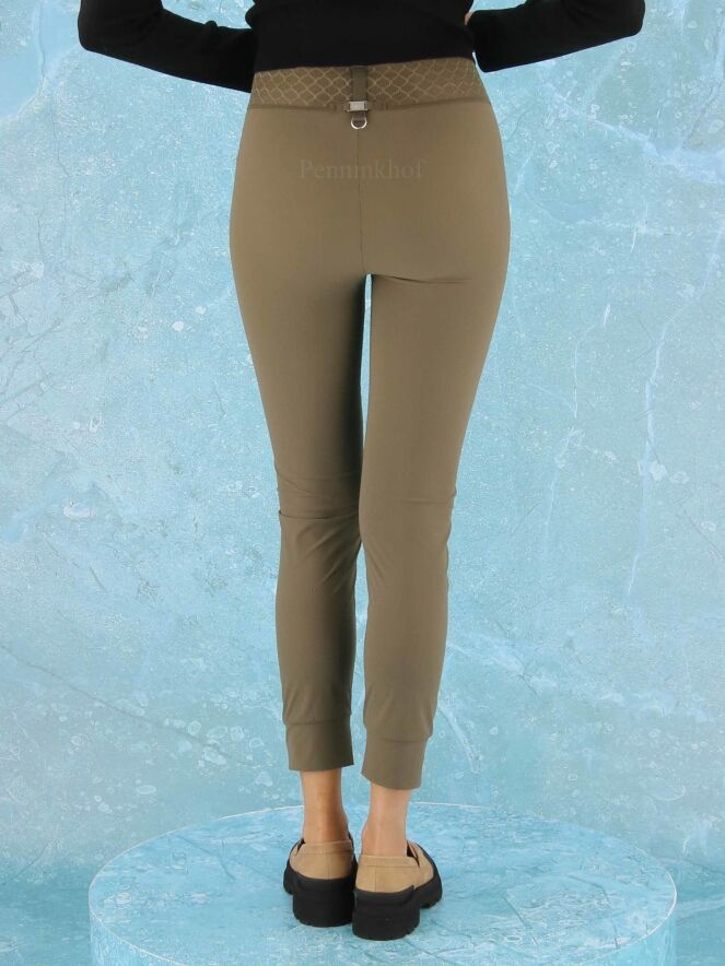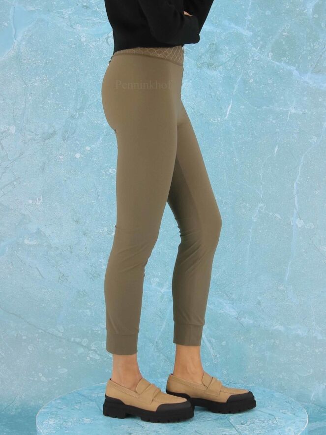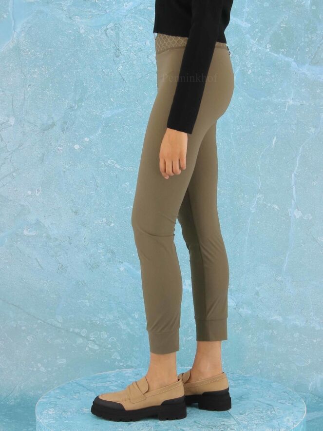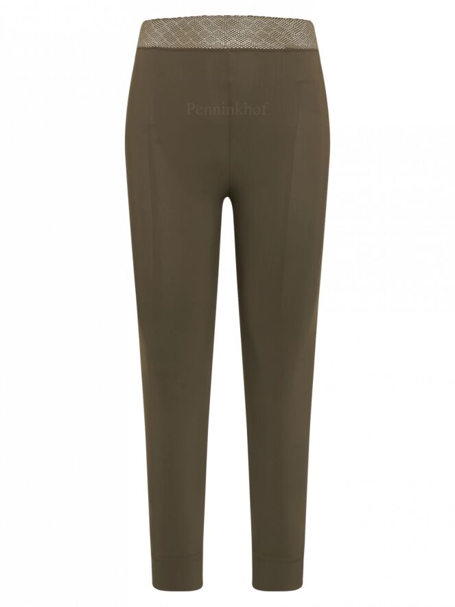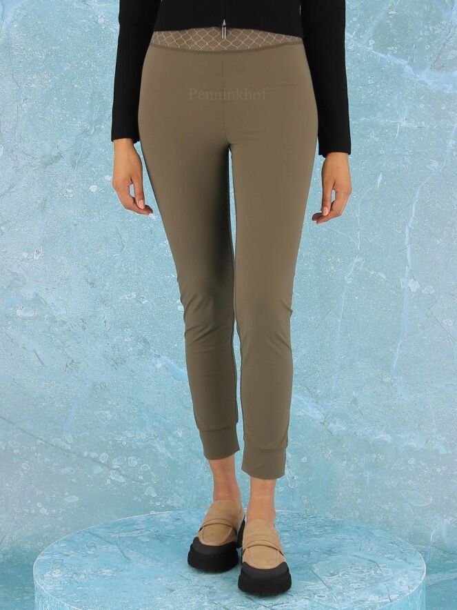 A legging from High in the color olive green. At the waist is a wide elastic band in a net structure. These leggings can be washed at 30 degrees.