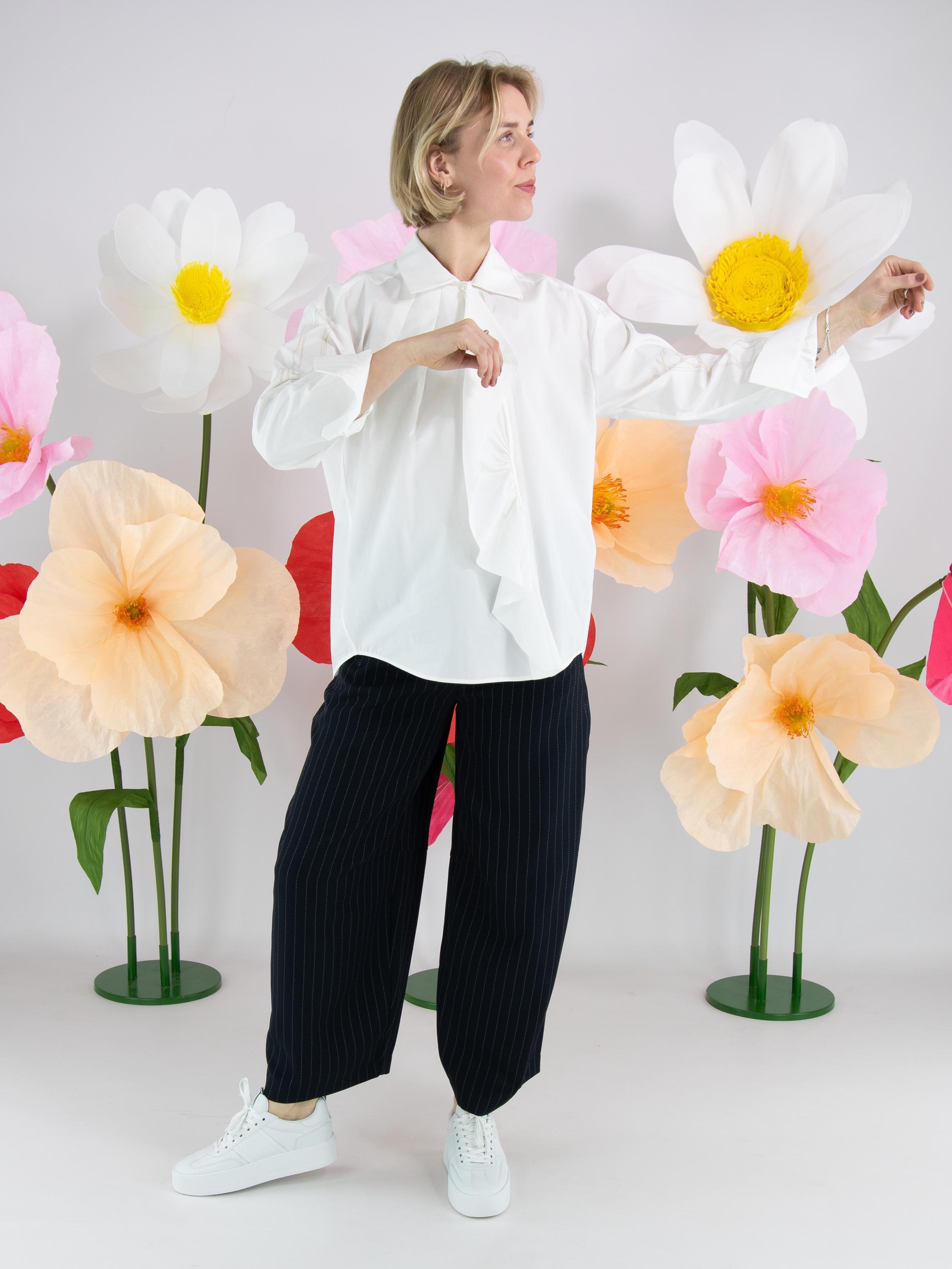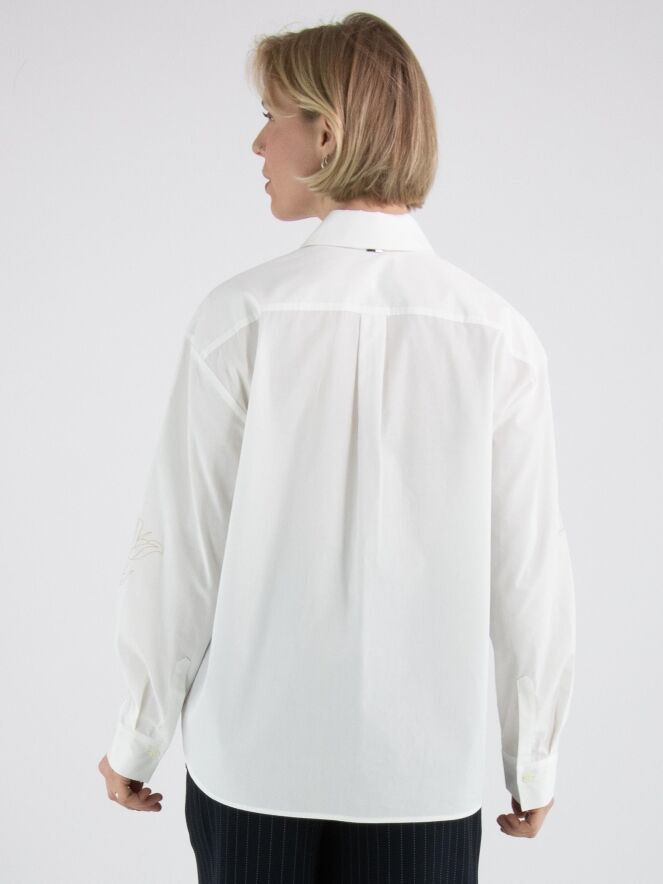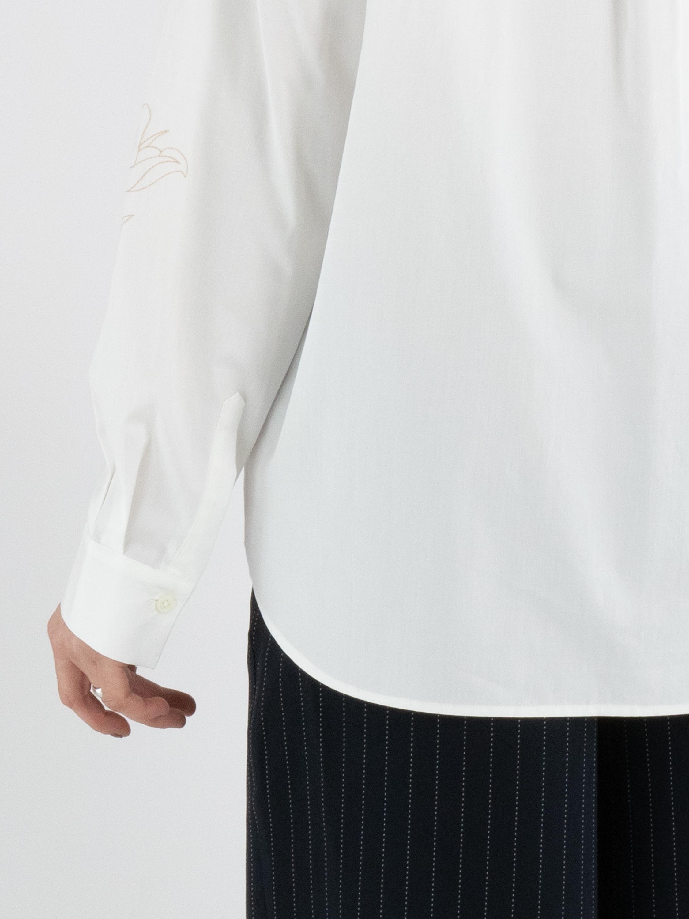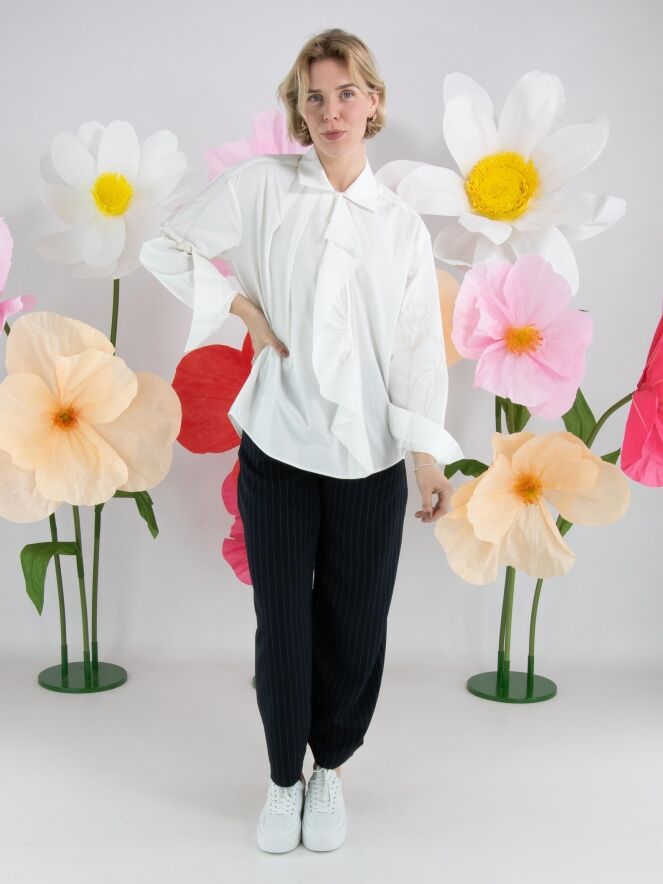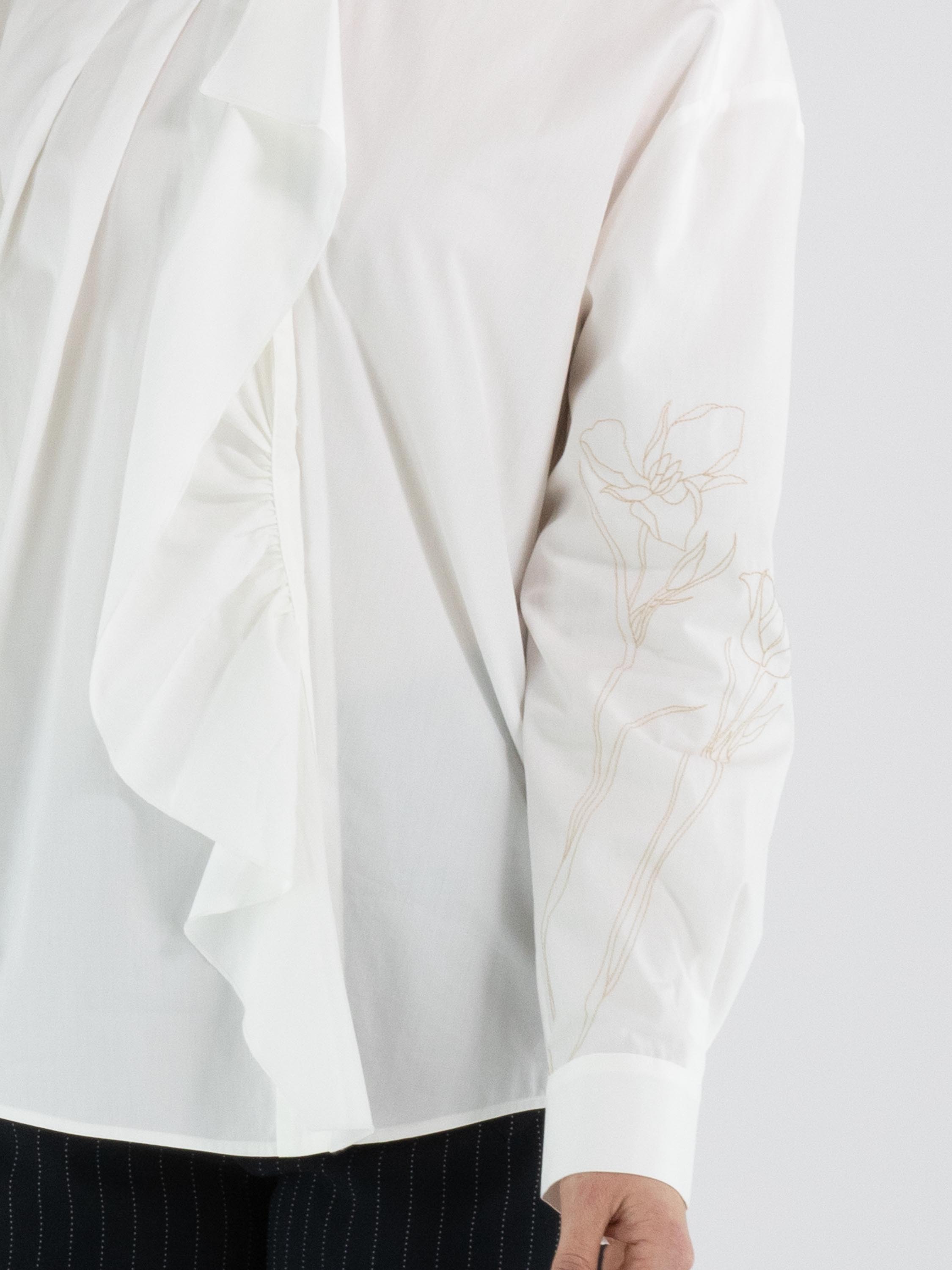 A blouse from High in white. From the back of the neckline, two pleated folds run diagonally downward and form a flounce along the button fastening. Decorative flowers are embroidered on the long sleeves with sand-coloured stitching. This blouse can be hand-washed.