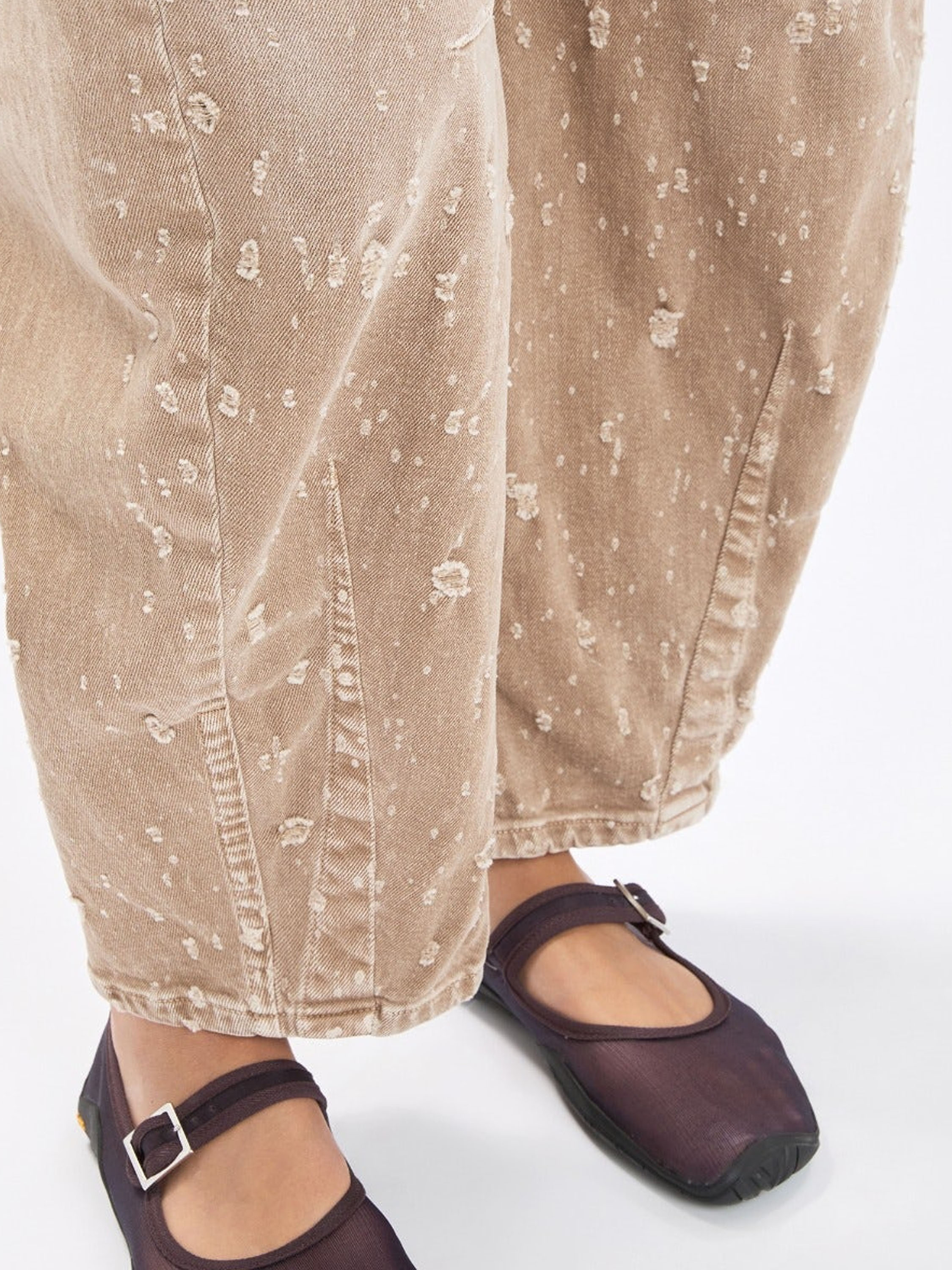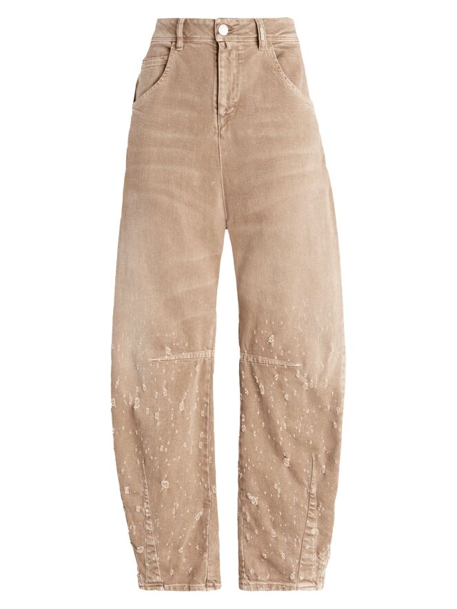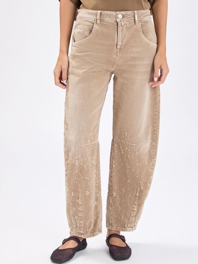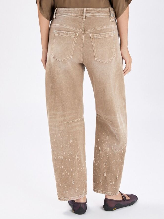 Jeans by High in a soft brown shade. Designed in a classic 5-pocket style, the fabric is manually gathered from knee level downwards, creating a subtle distressed and contemporary effect. These jeans can be washed at 30 degrees.