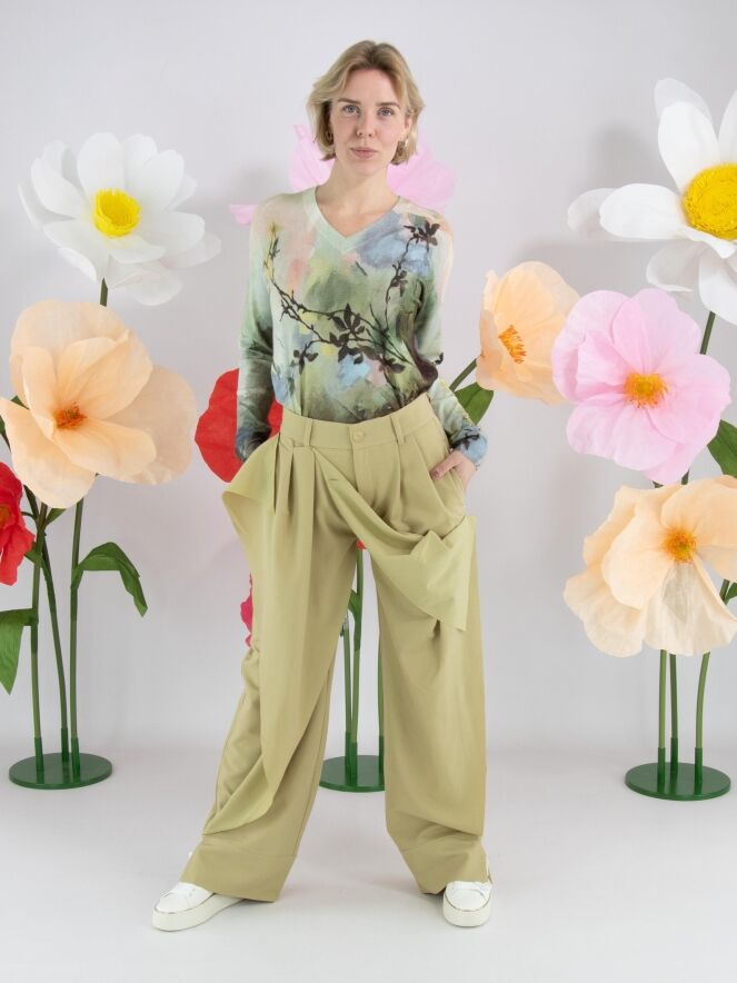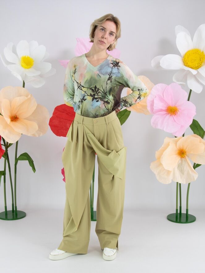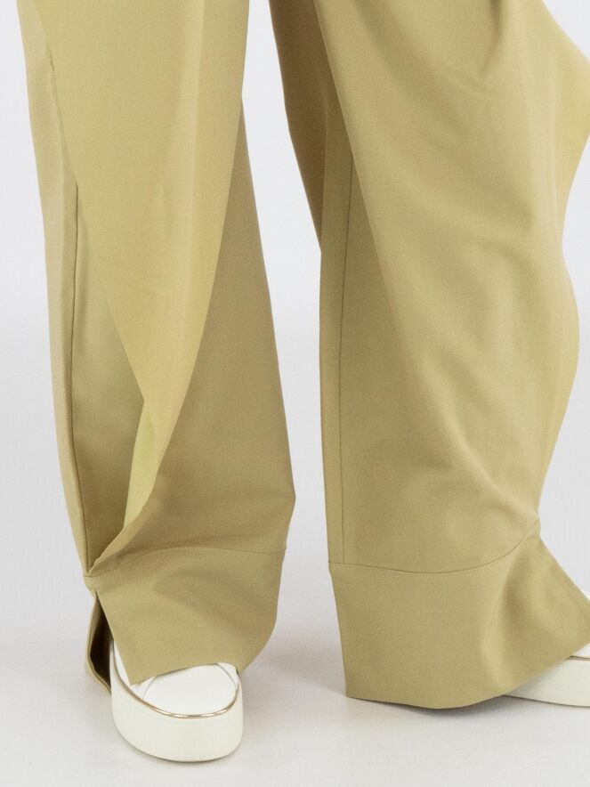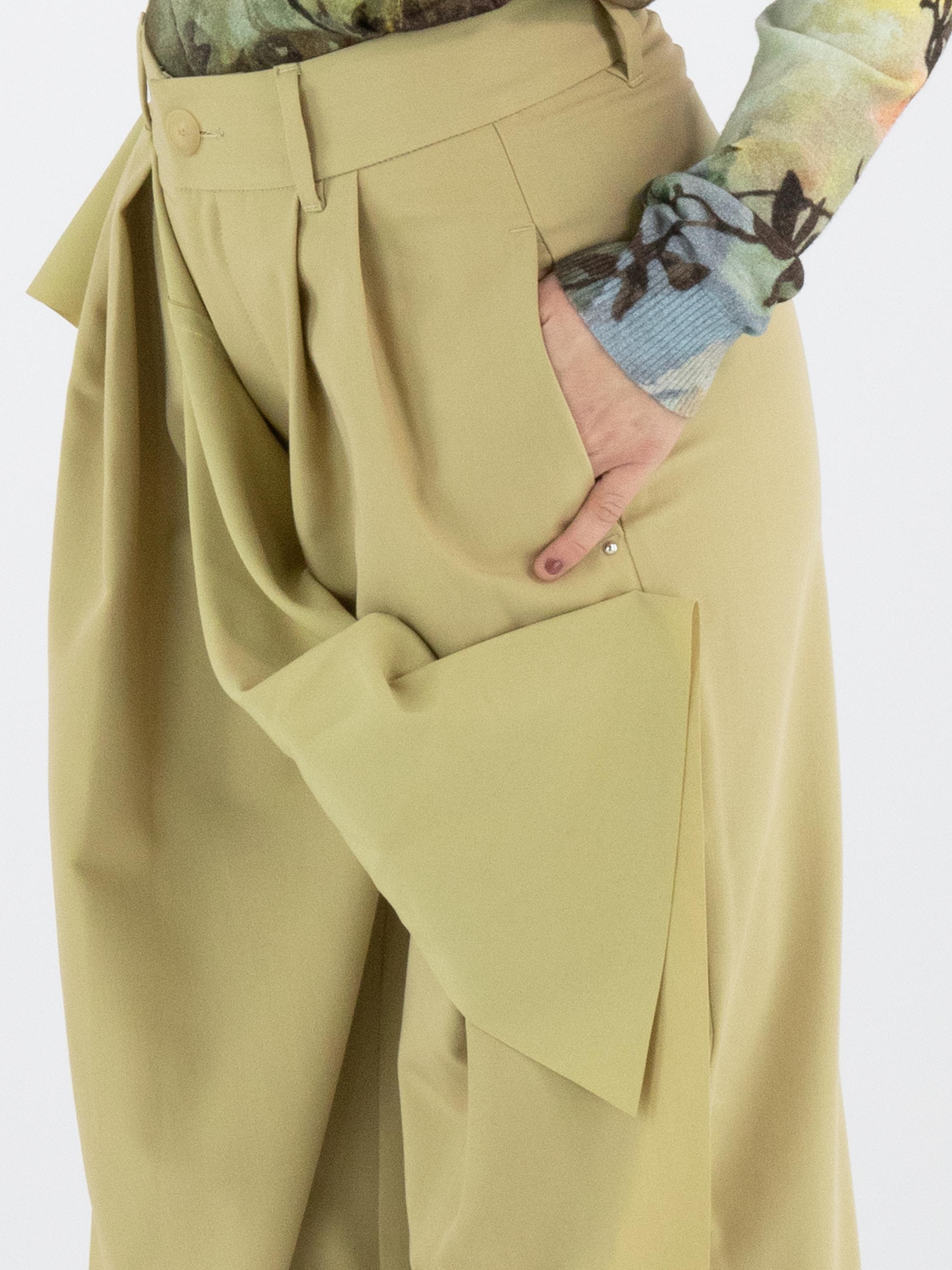 A design pair of trousers from High in mustard. At the front, a double layer of fabric runs upward from the bottom of the legs, fixed on the left side up to just below the slit pockets and on the right side at two points just below the waistband. This creates an overlap effect at hip level on the front. The double fabric is not fixed along the sides of the legs, further emphasising the layered effect. These trousers must not be washed.