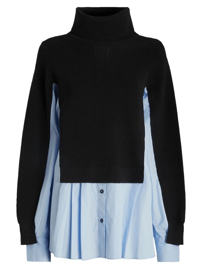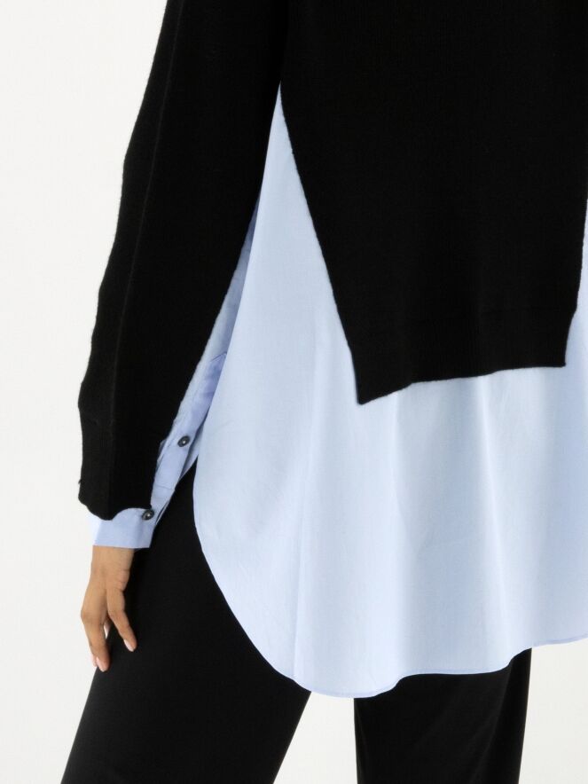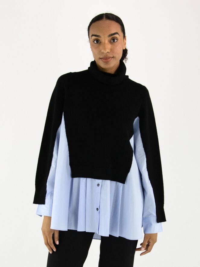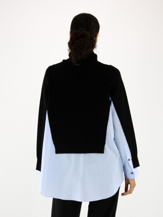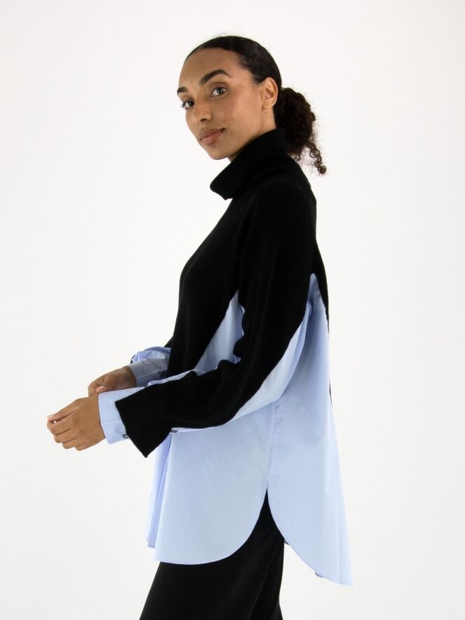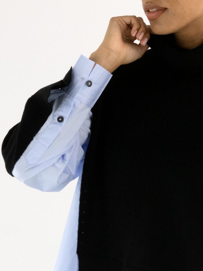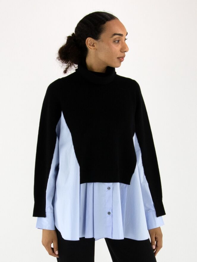 A navy blue pullover by High with a blouse-style detail extending from the waist to the sides and the lower sleeves. The blouse part is made from a light blue 100% cotton fabric. The pullover features a turtleneck and should be hand-washed.