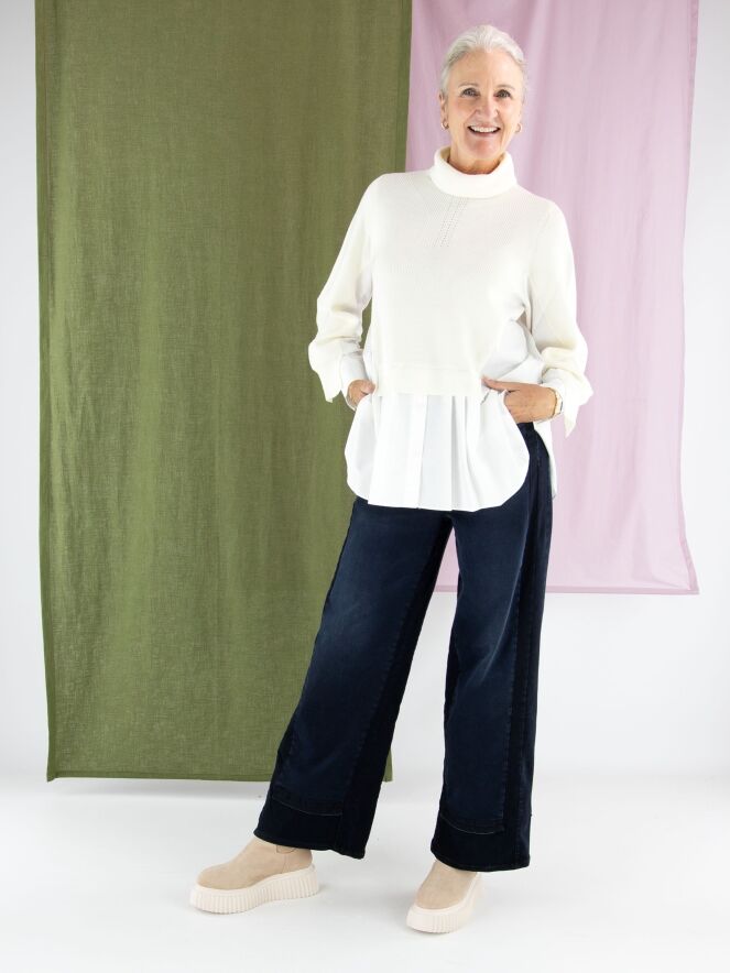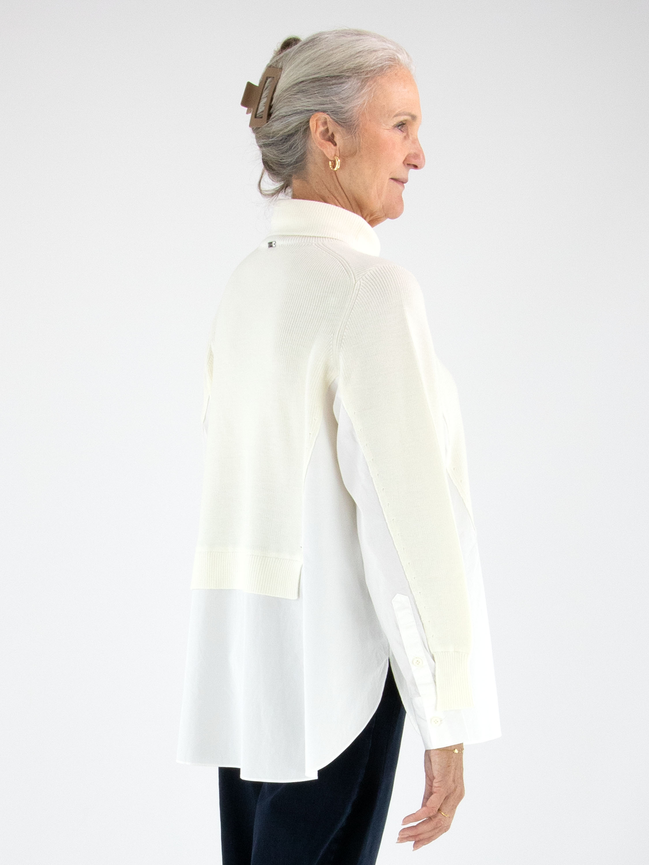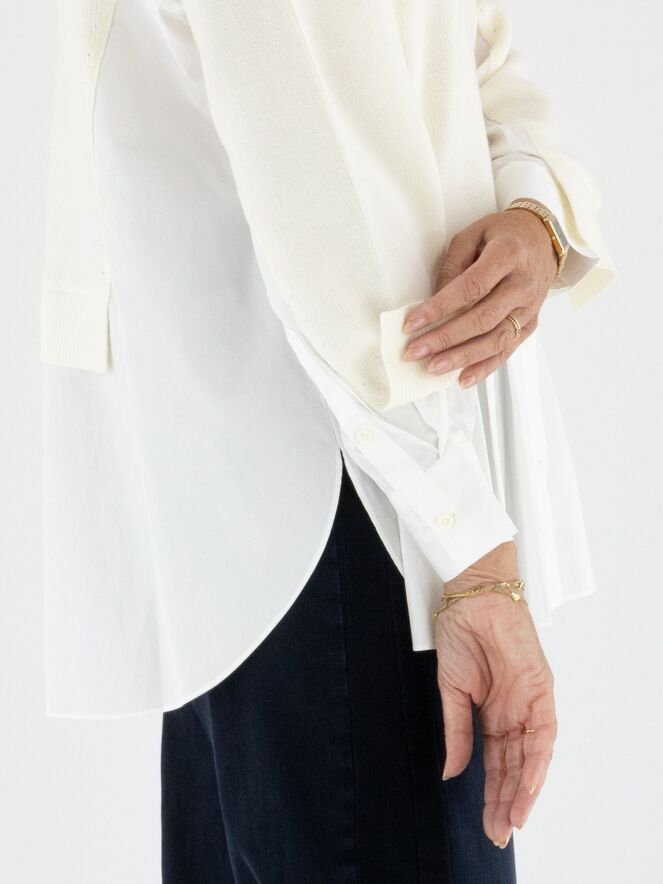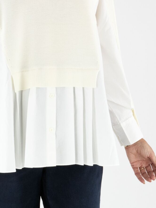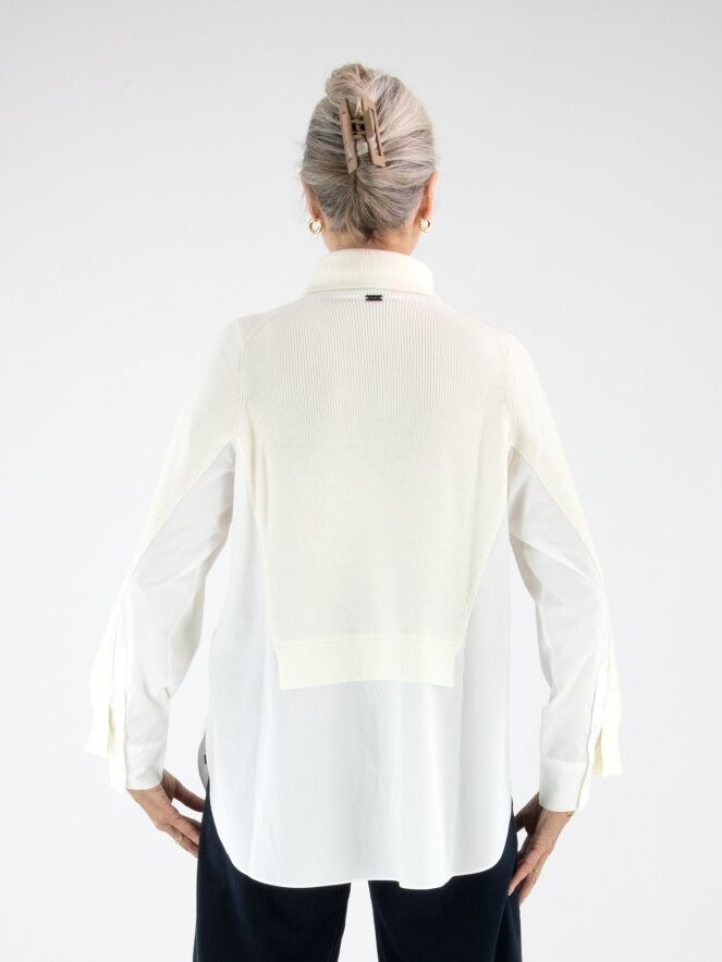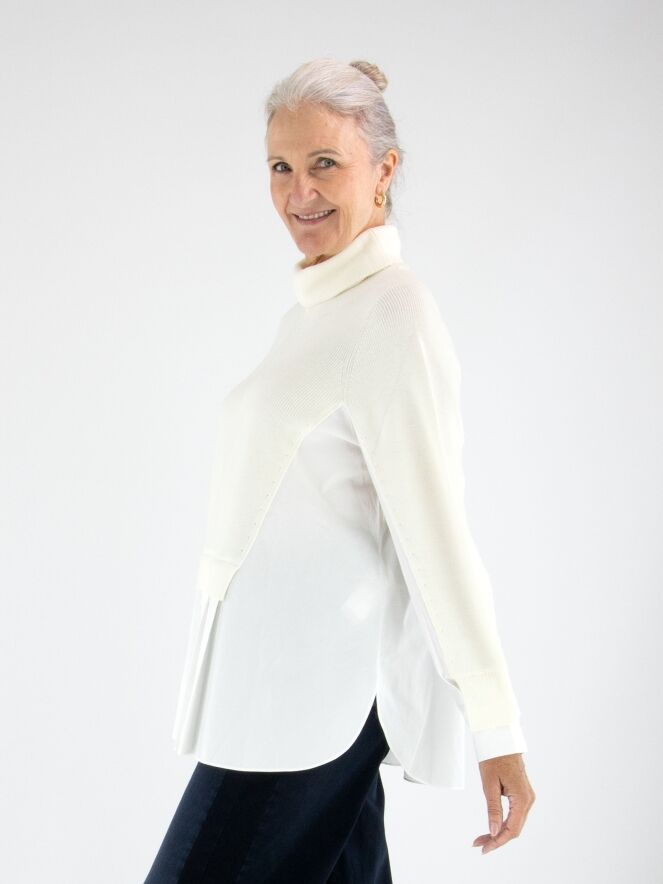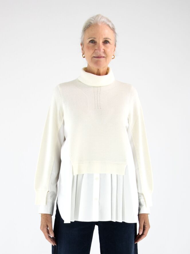 A pullover by High in cream white with a blouse effect from the waist to the sides and at the sleeve ends. The blouse section is made of 100% cotton in off-white. The pullover features a collar and can be hand-washed.