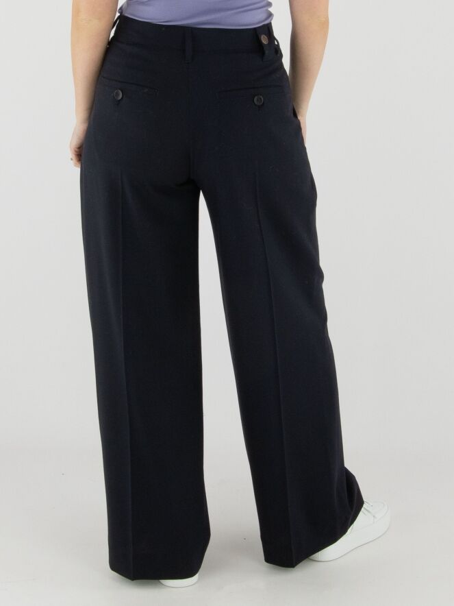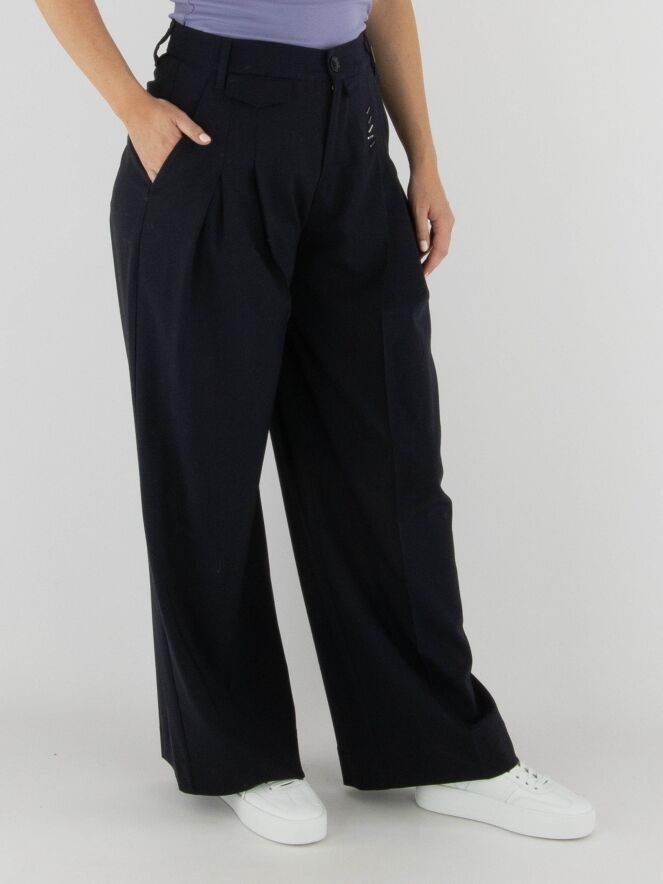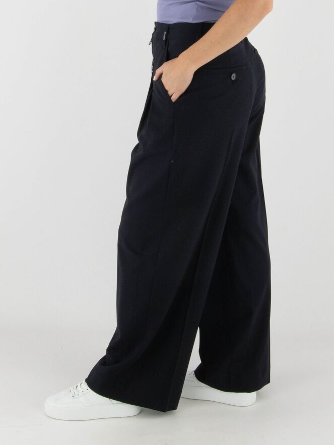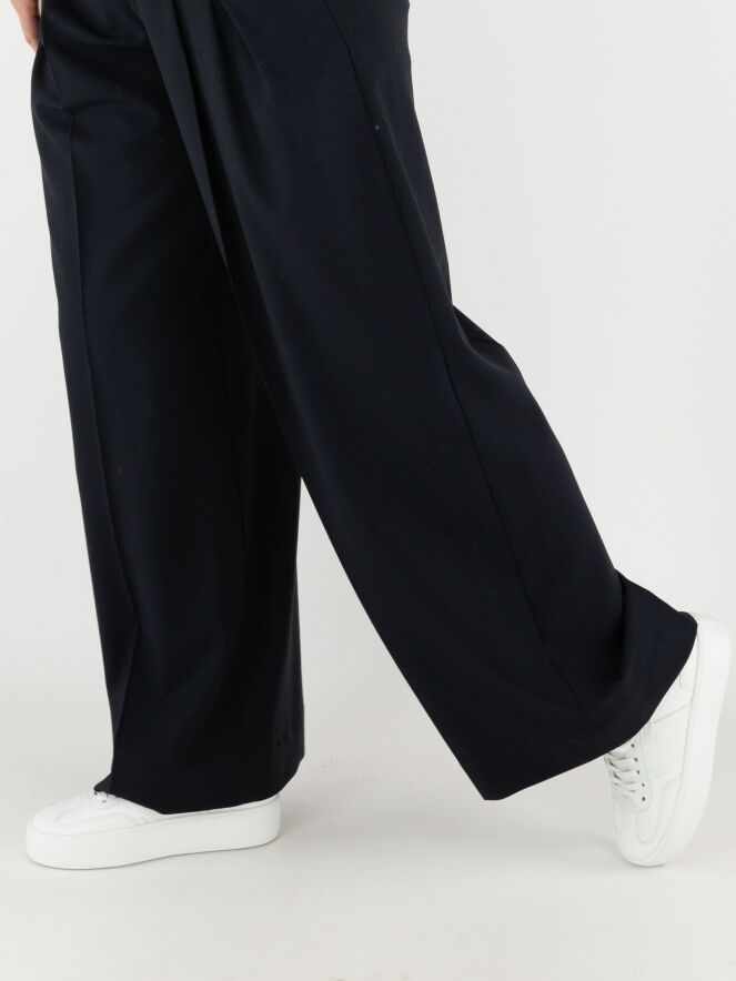 Trousers by High in navy blue. Several pleats extend from the waistband, one of which continues into a pressed crease. The trousers have side pockets and must not be washed.