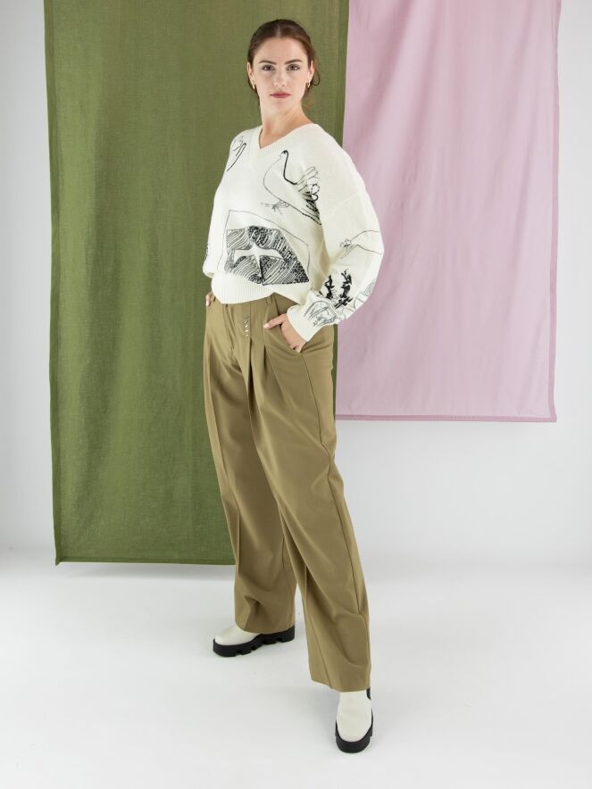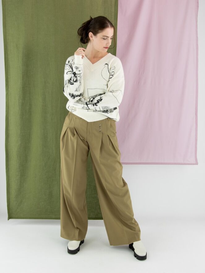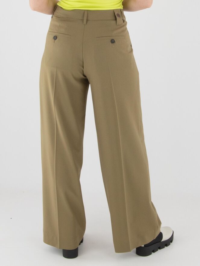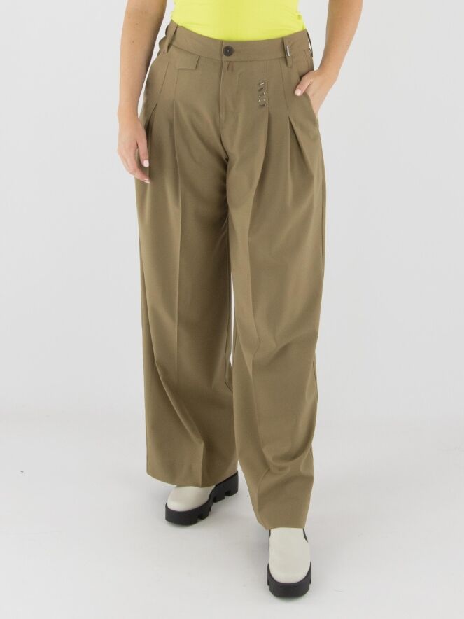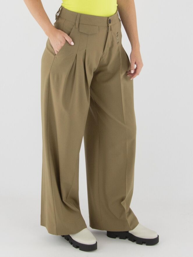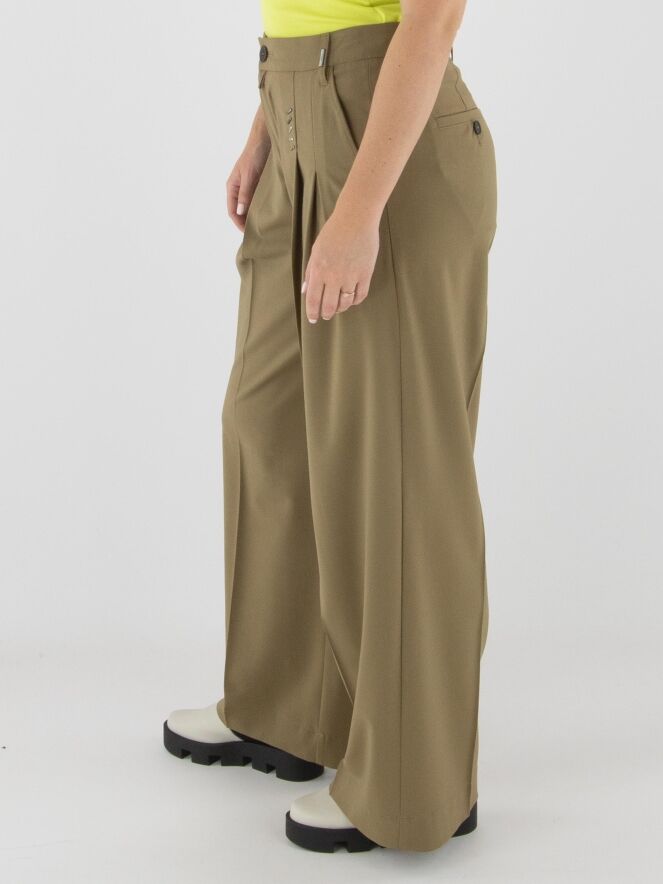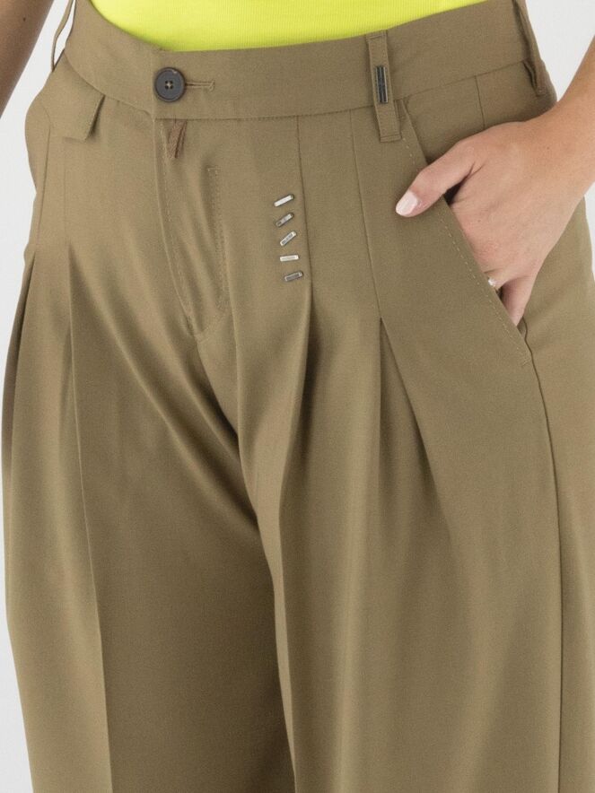 Trousers by High in olive green. From the waistband, a few pleats extend downward, one of which continues into a pressed crease. The trousers have side pockets and must not be washed.