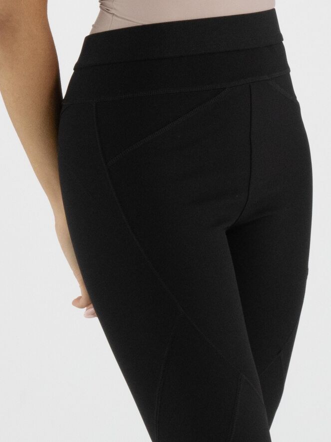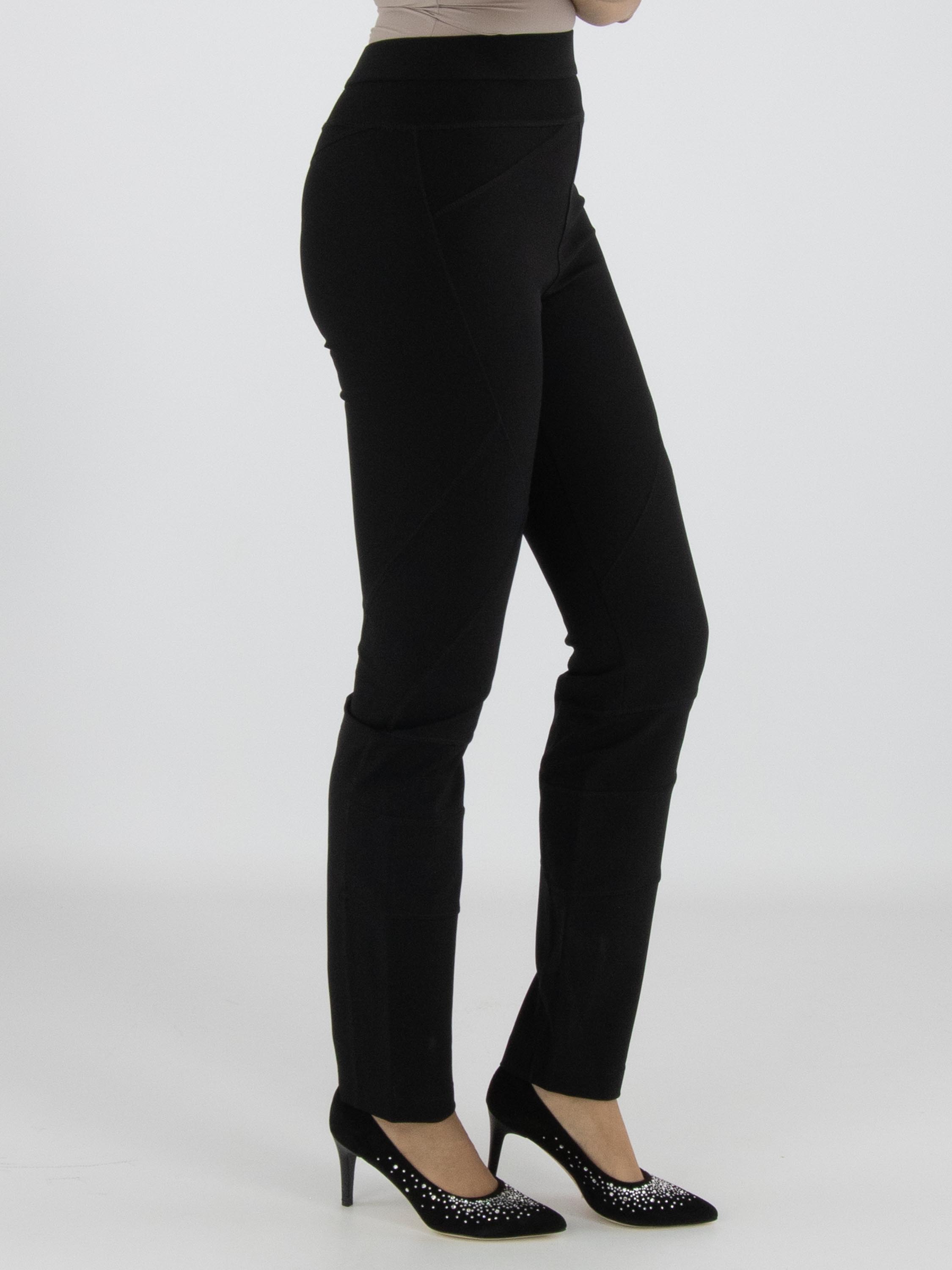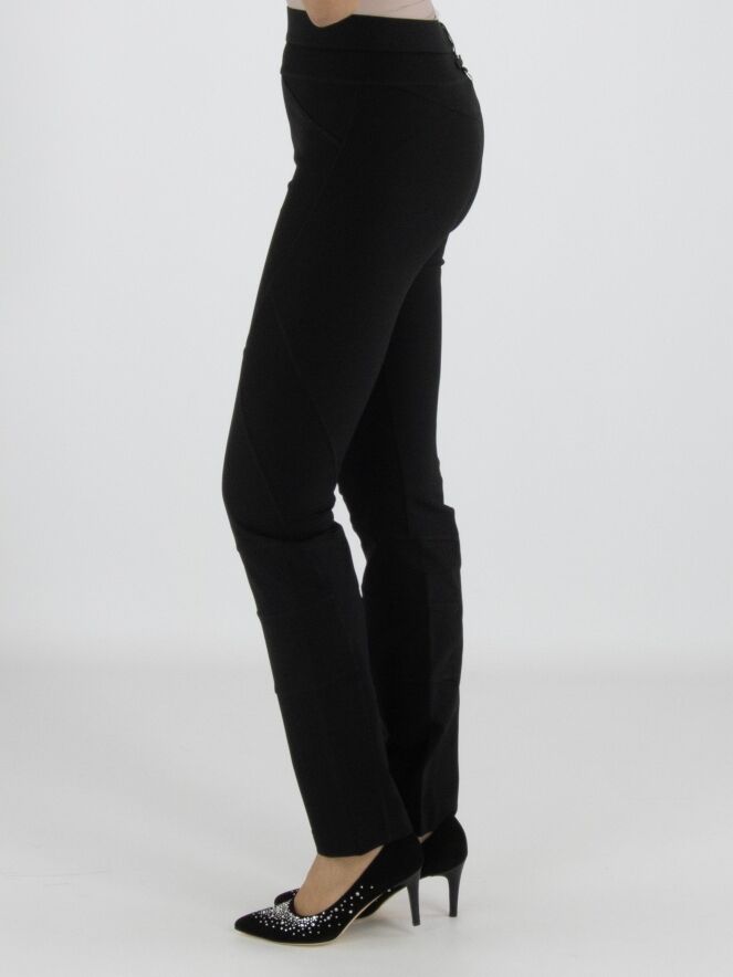 Trousers from High in black. The waistband features an elastic band. The trousers have several decorative diagonal and horizontal seams. These trousers can be hand-washed.
