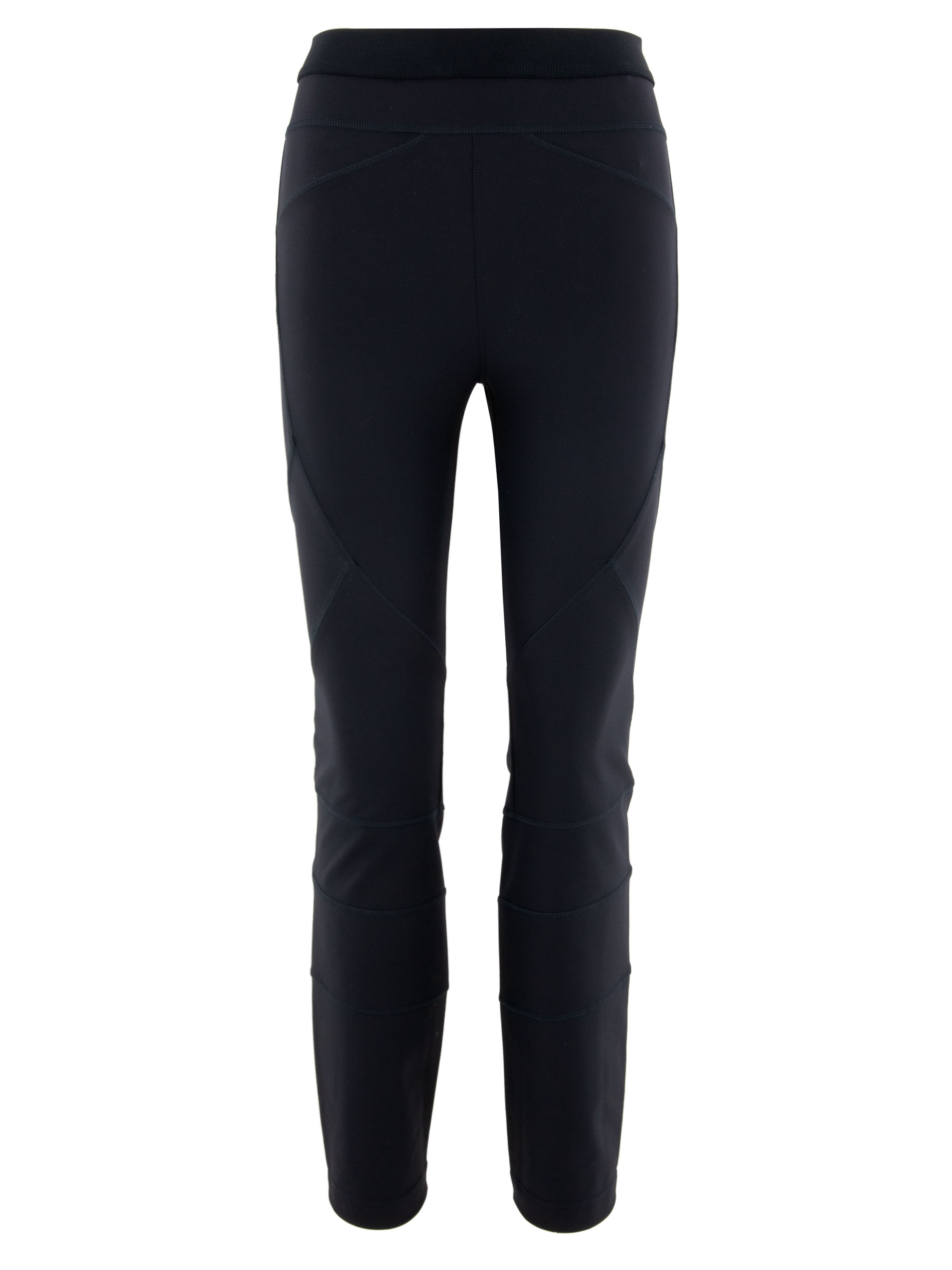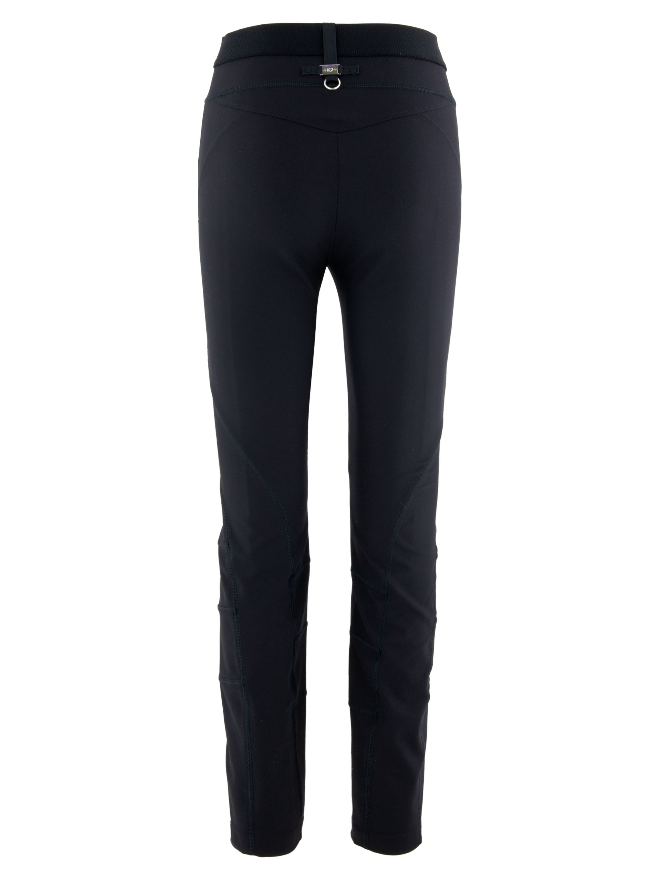 Trousers from High in navy blue. The waistband features an elastic band. The trousers have several decorative diagonal and horizontal seams. These trousers can be hand-washed.