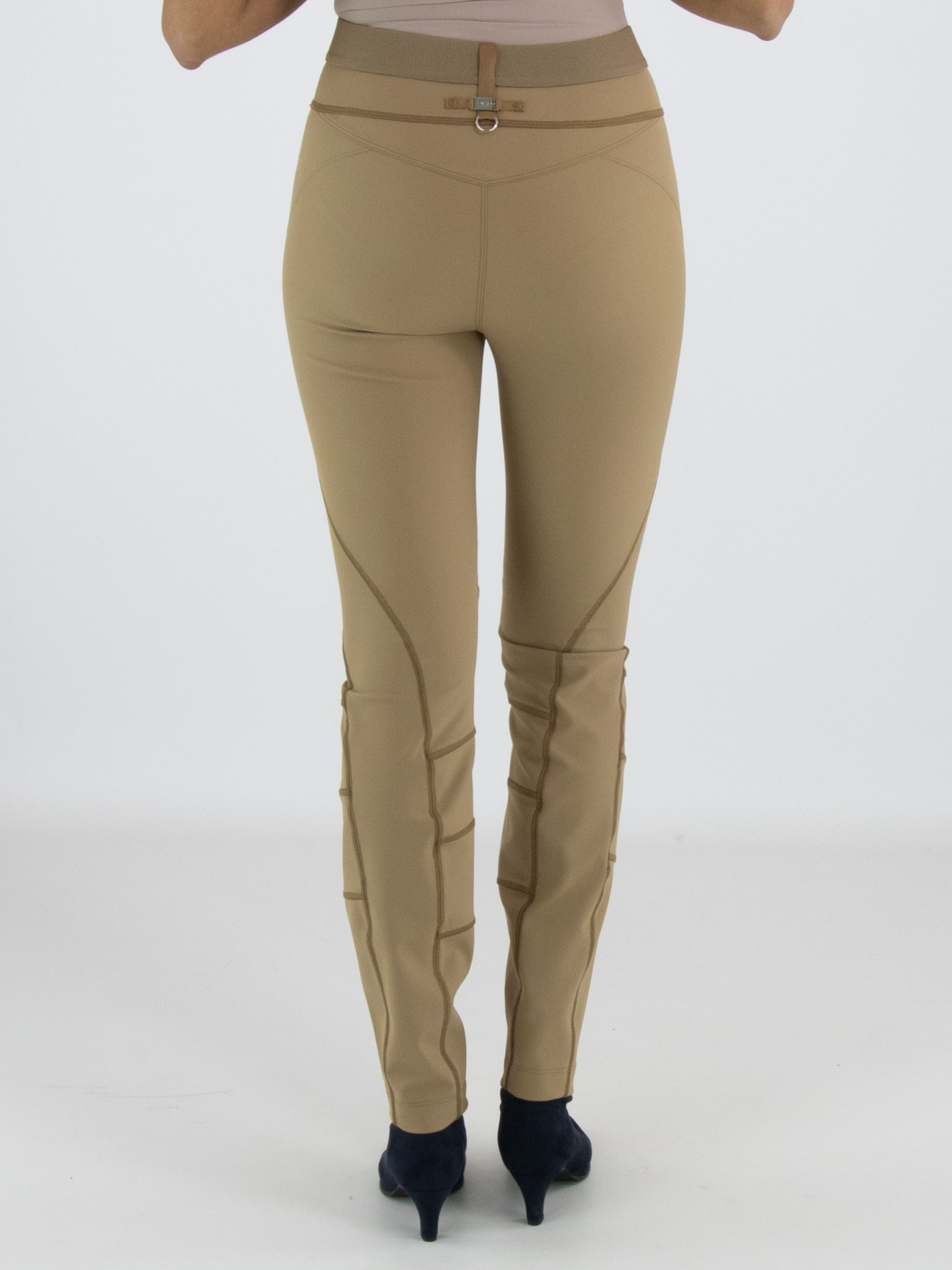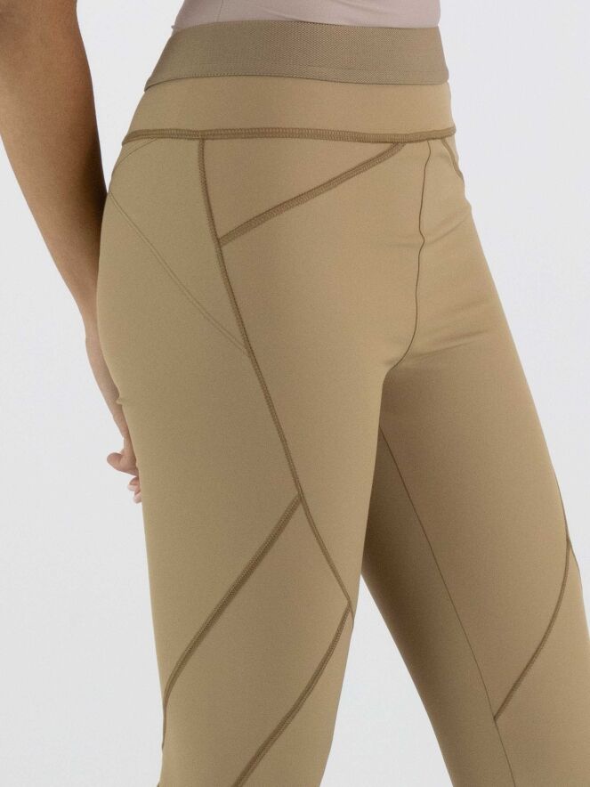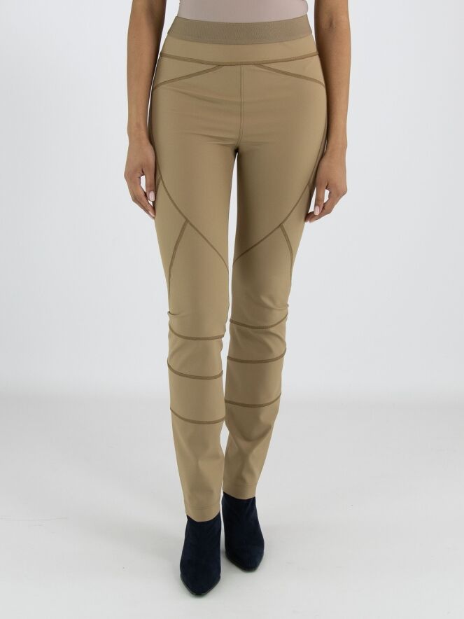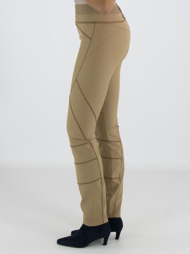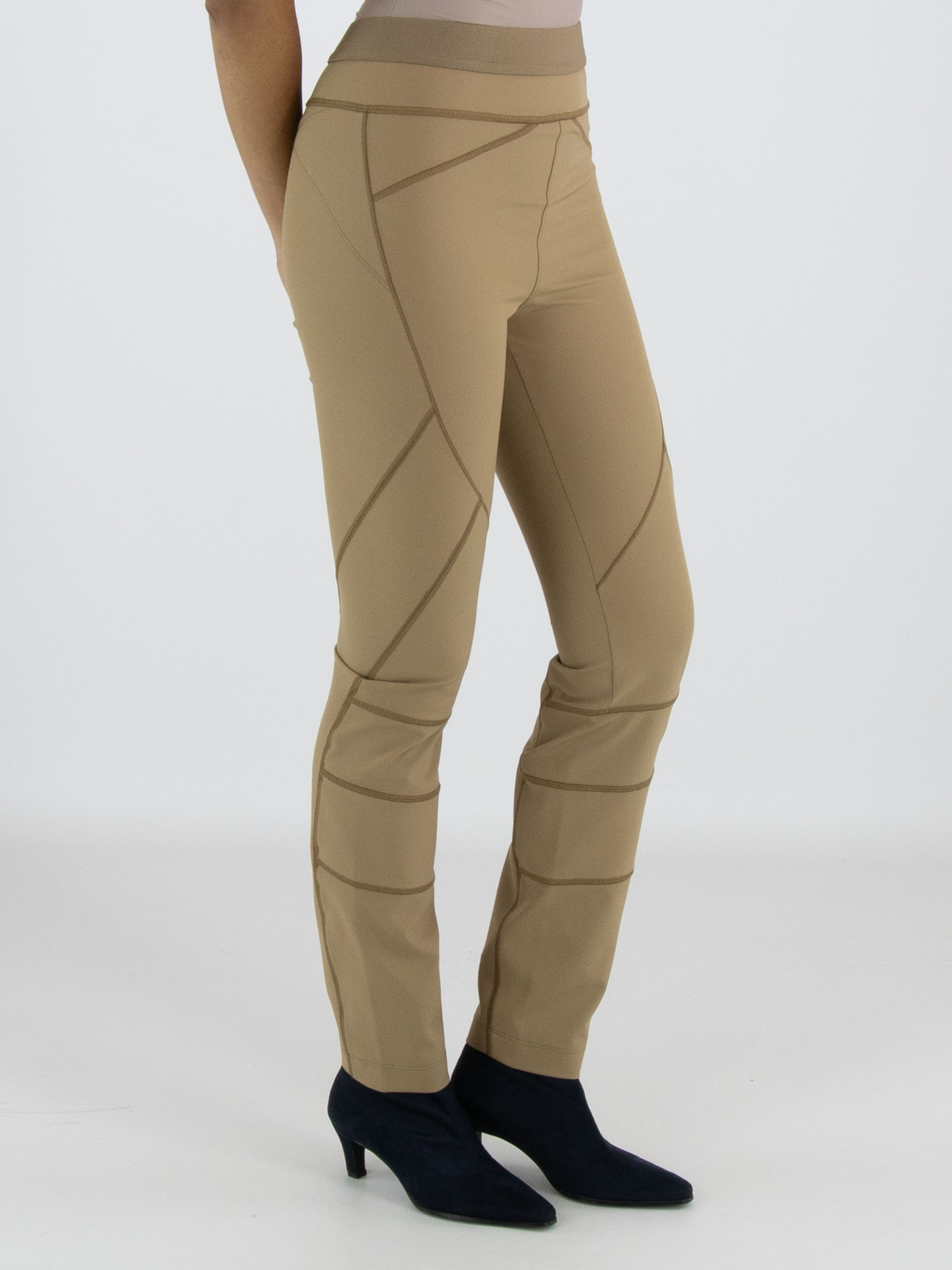 Trousers from High in camel or mustard. The waistband features an elastic band. The trousers have several decorative diagonal and horizontal seams. These trousers can be hand-washed.