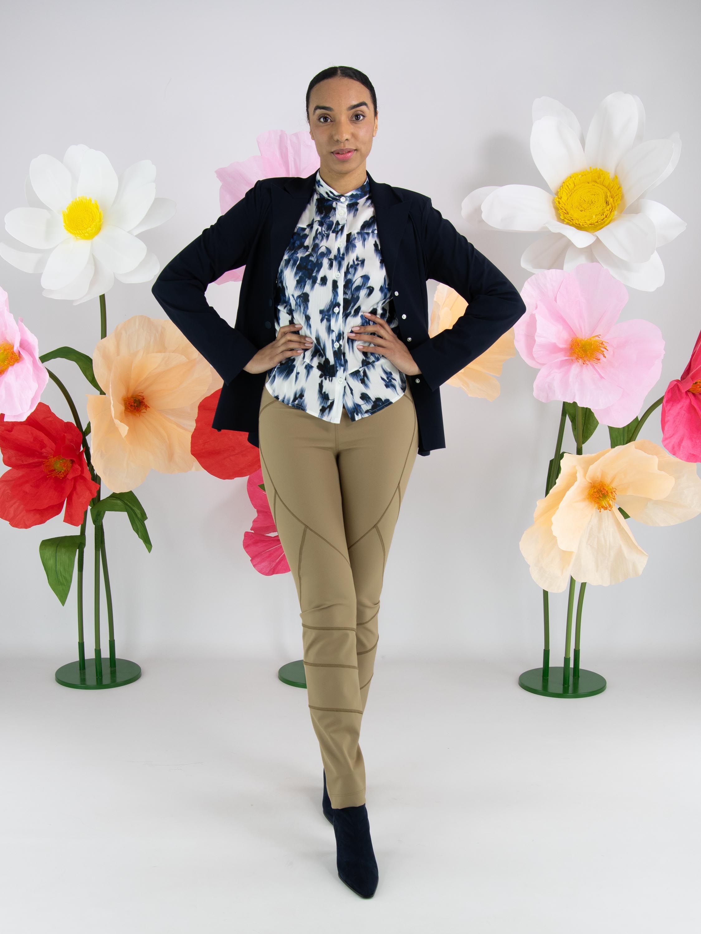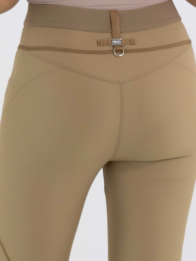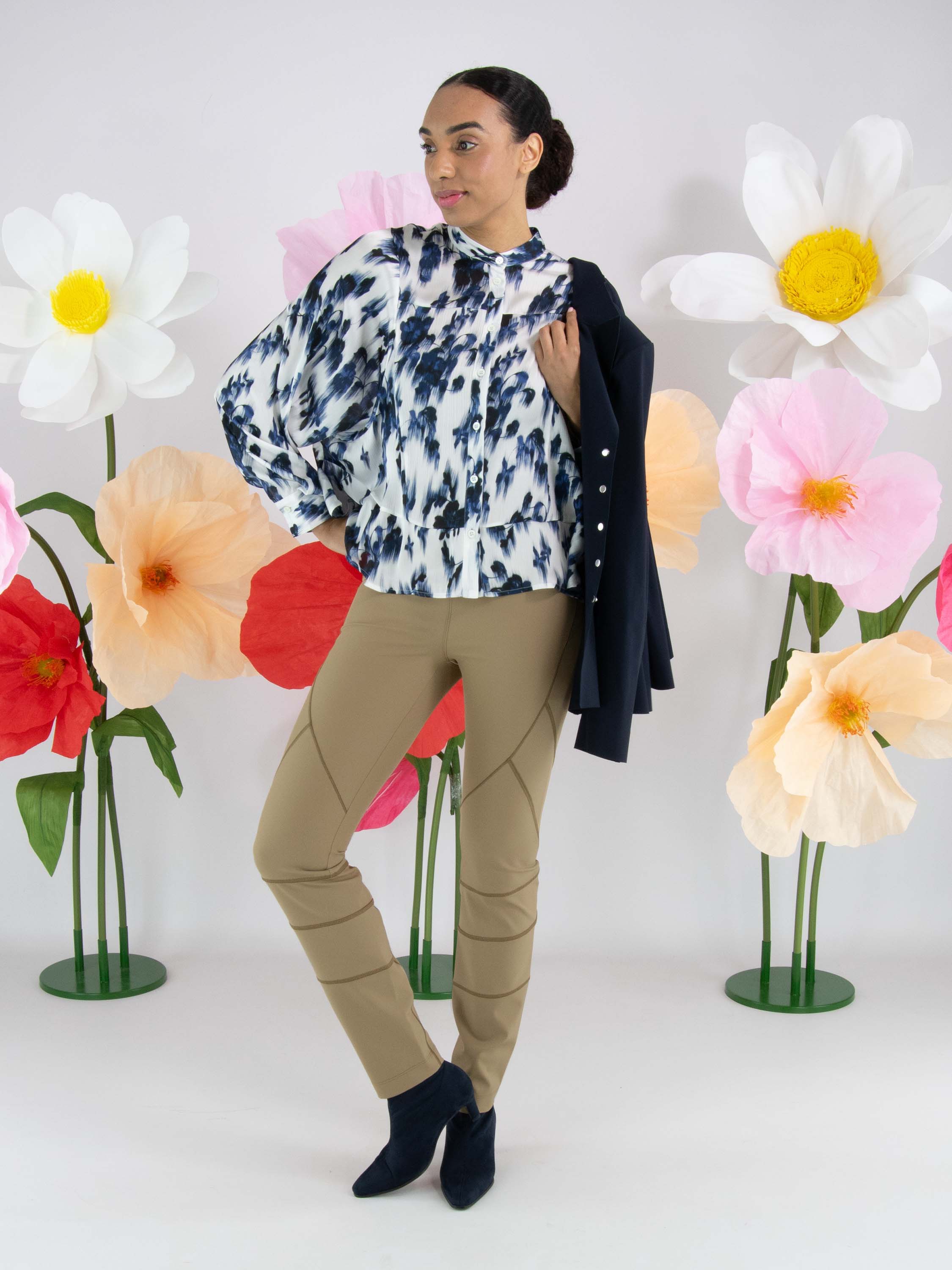 Trousers from High in camel or mustard. The waistband features an elastic band. The trousers have several decorative diagonal and horizontal seams. These trousers can be hand-washed.