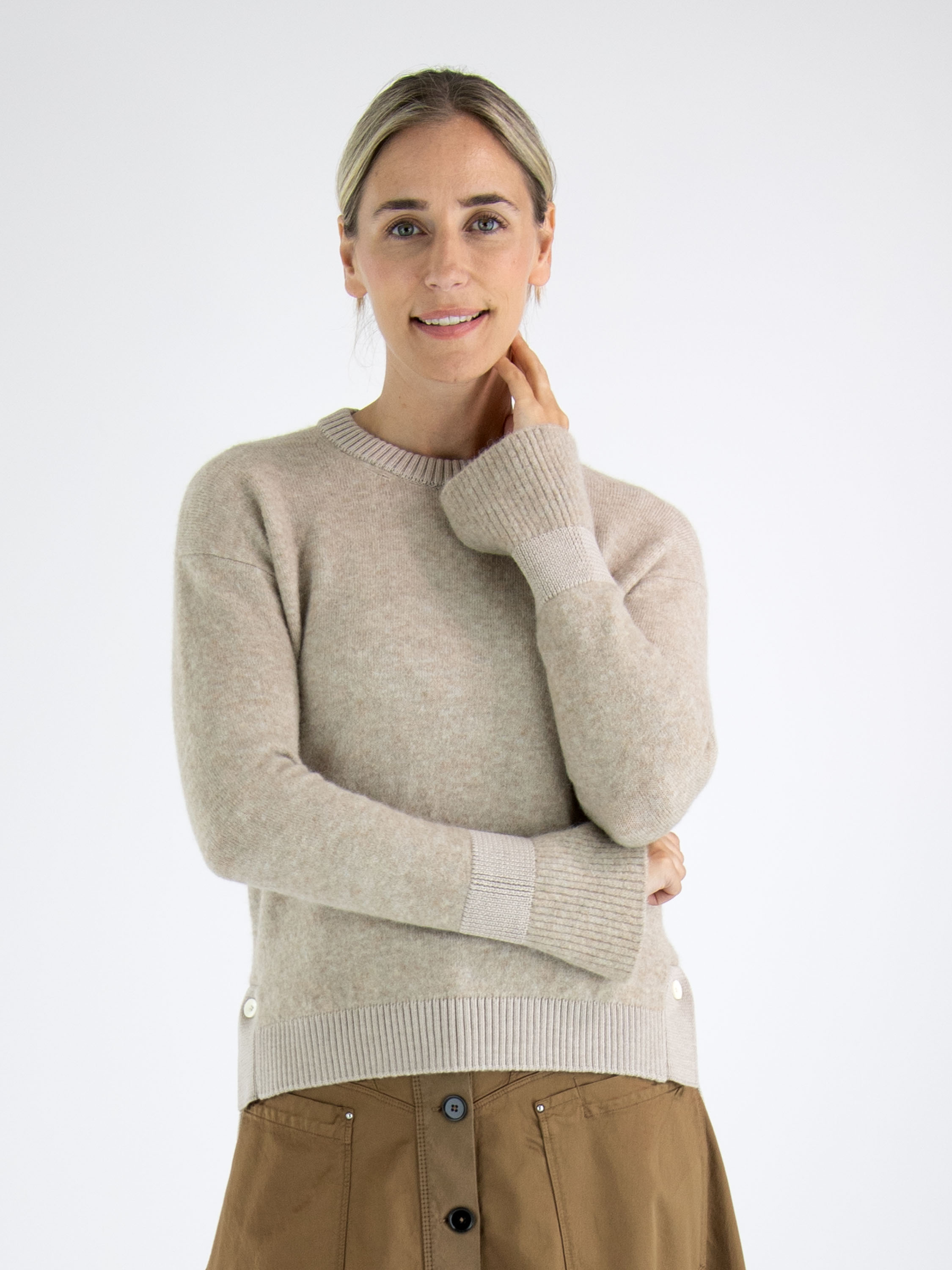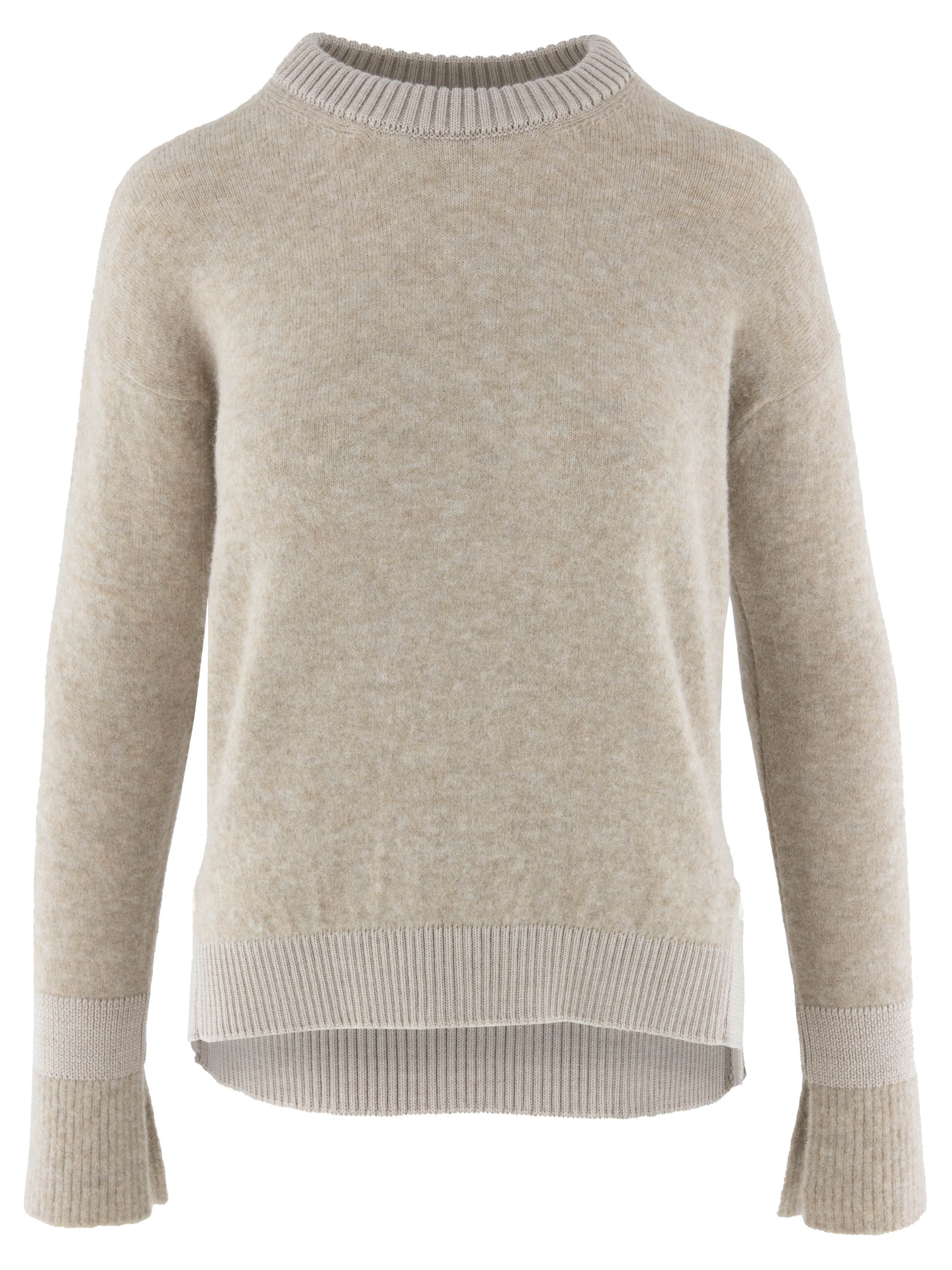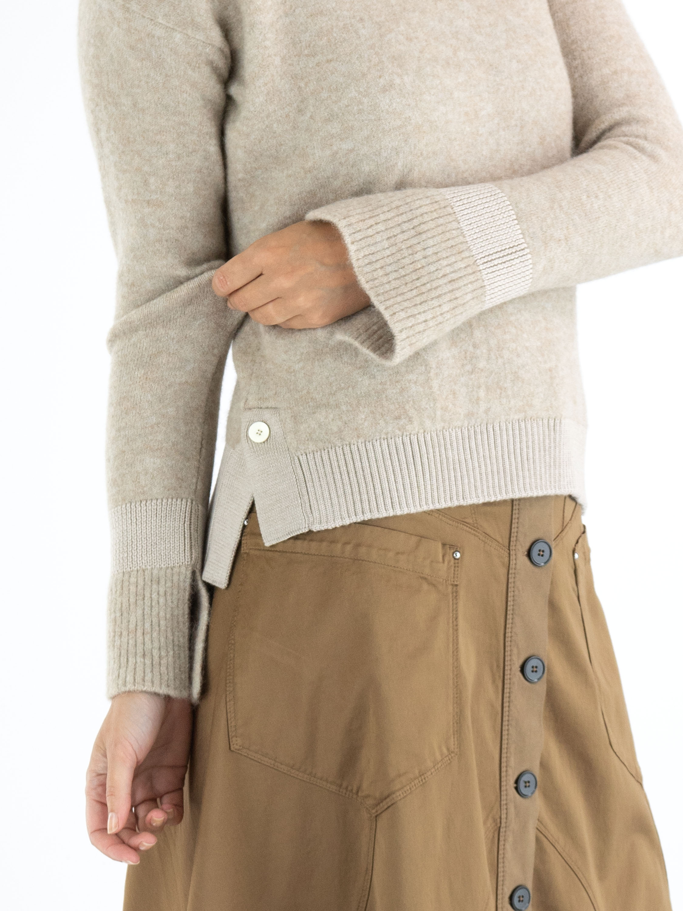 A pullover from High in beige. The pullover has a high round neckline and long sleeves. At the bottom, there is a ribbed knit cuff with a split at the sides featuring a button closure. This pullover can be hand washed.