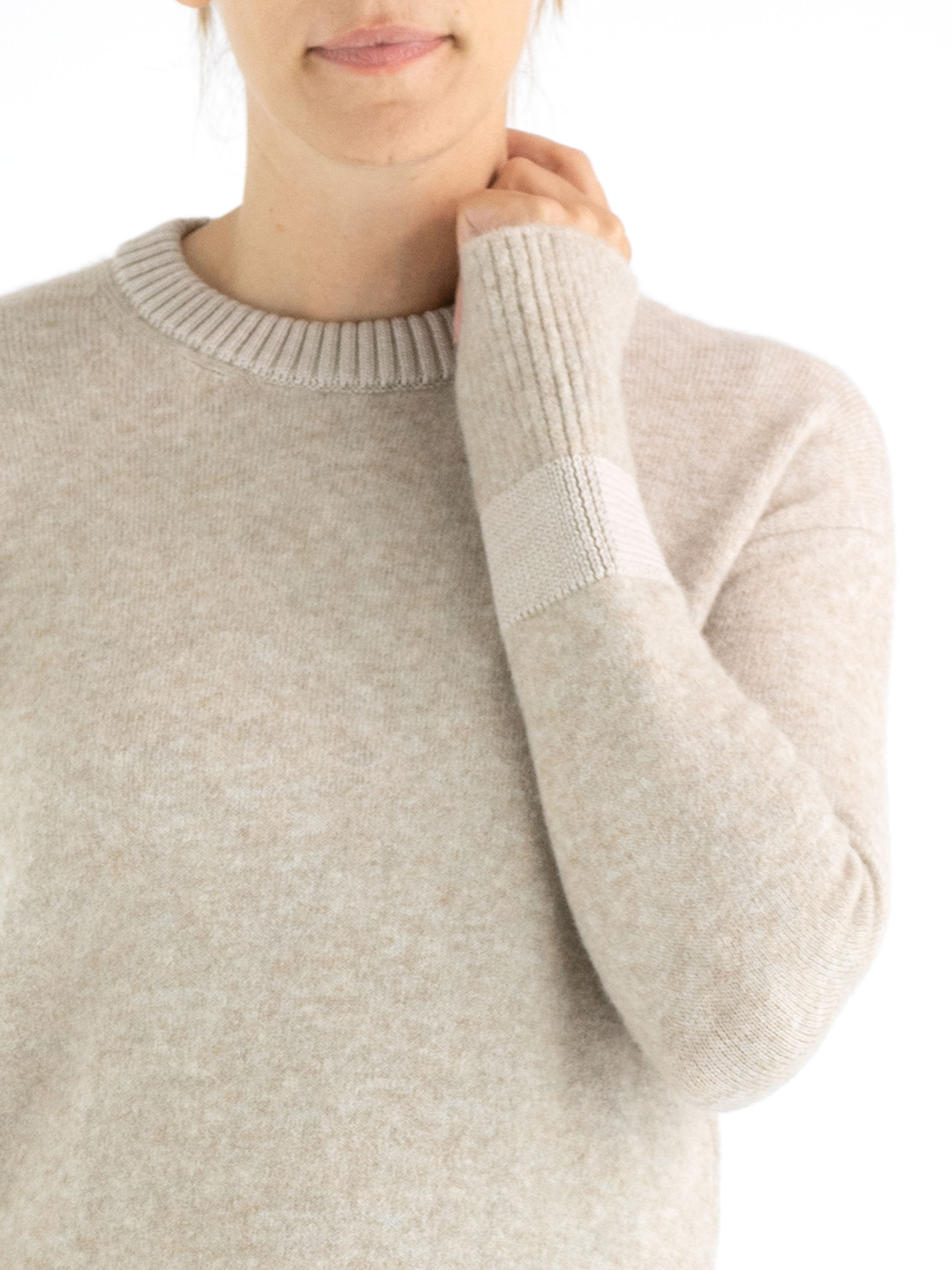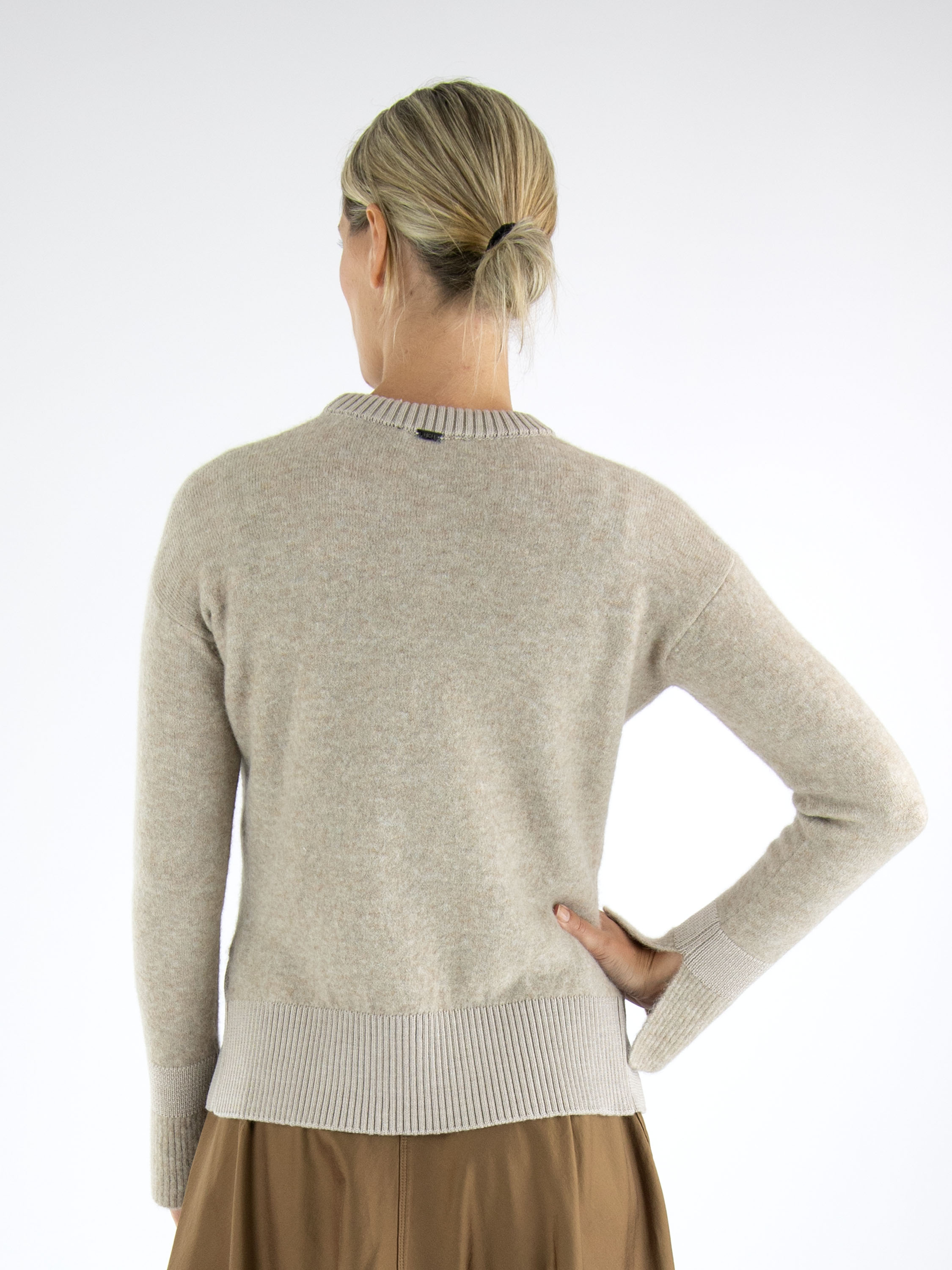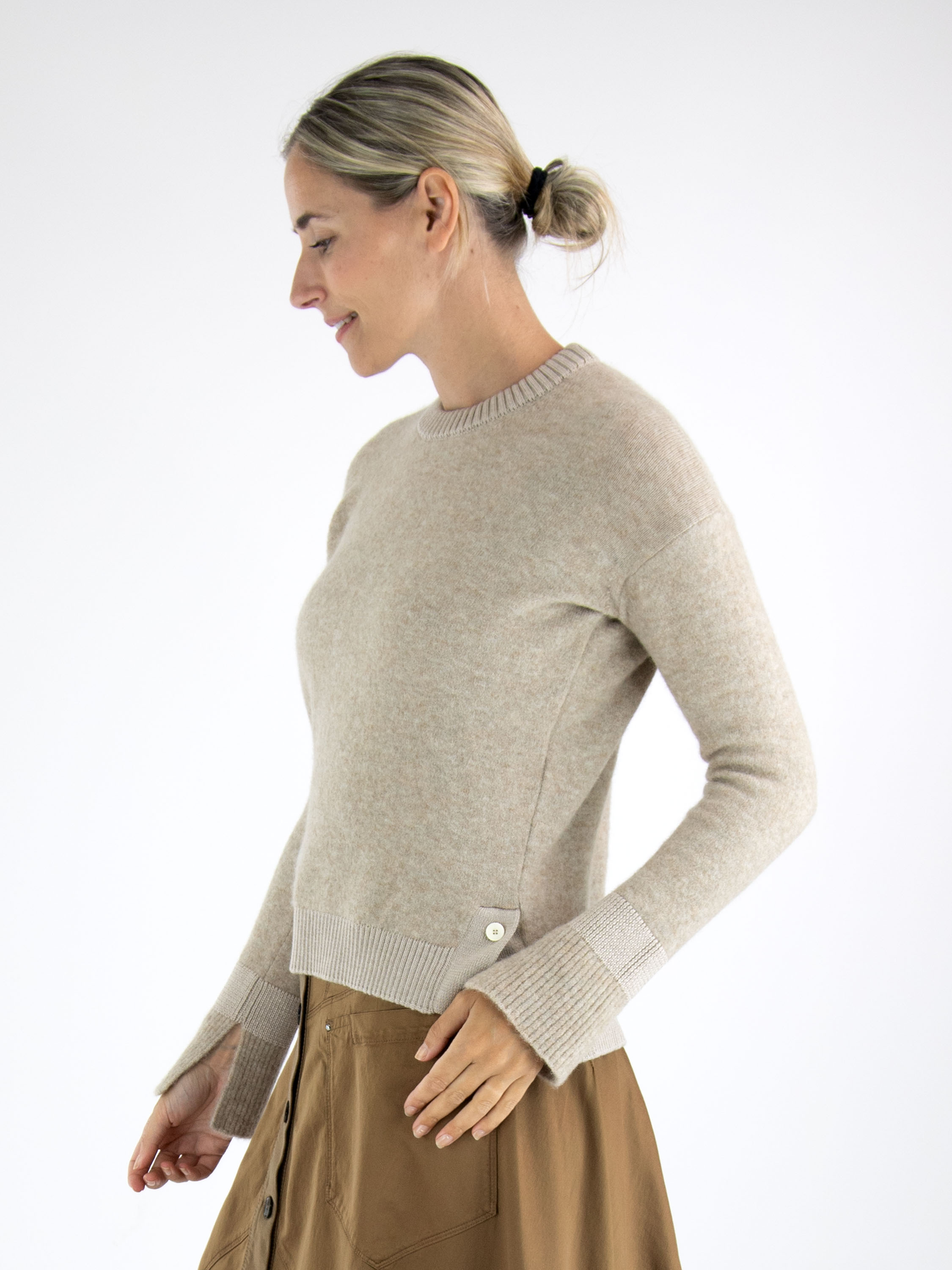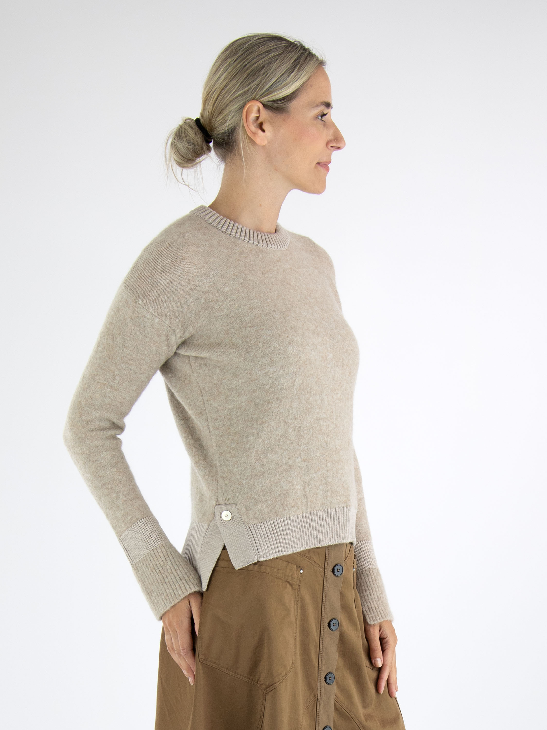 A pullover from High in beige. The pullover has a high round neckline and long sleeves. At the bottom, there is a ribbed knit cuff with a split at the sides featuring a button closure. This pullover can be hand washed.
