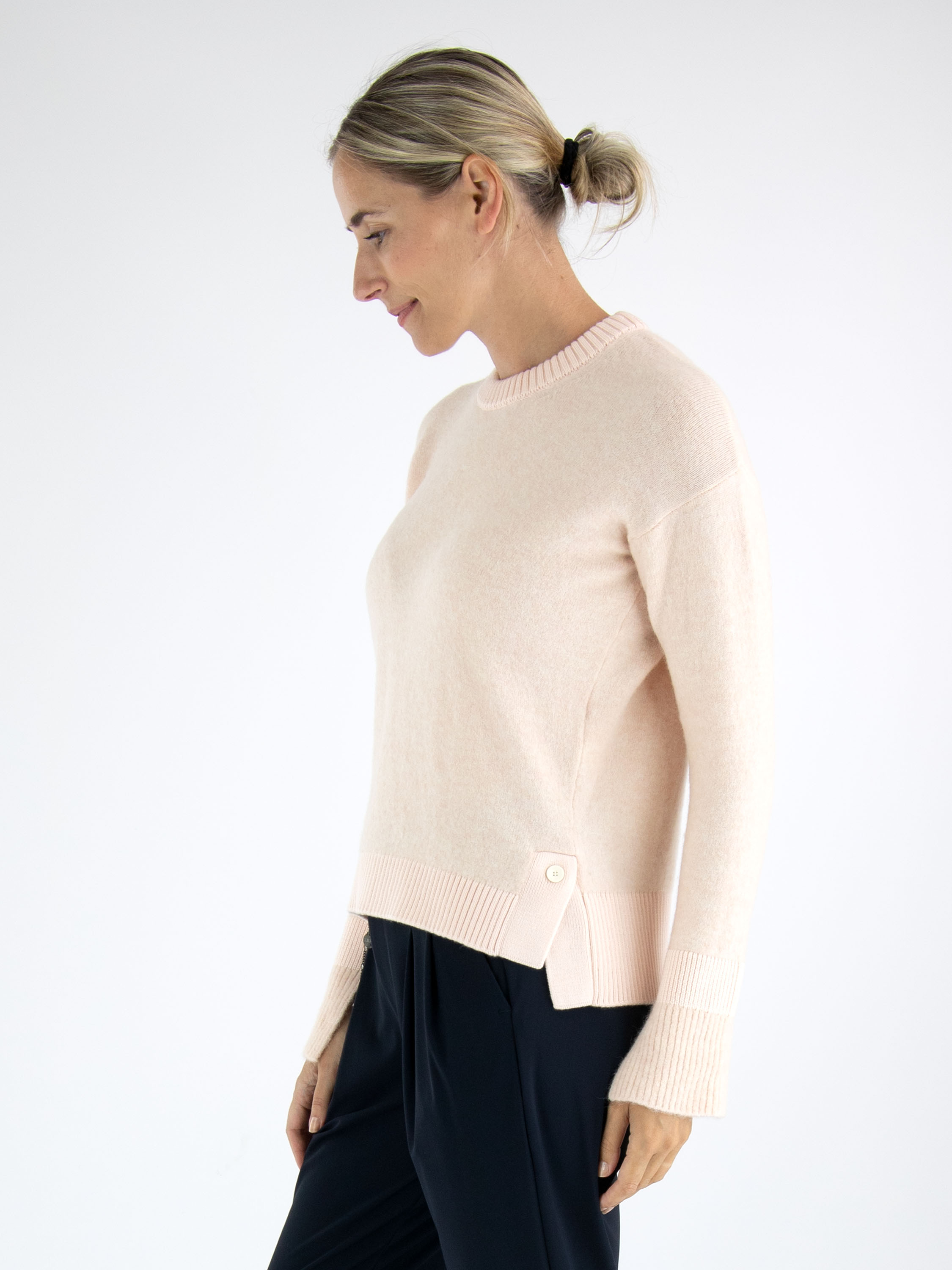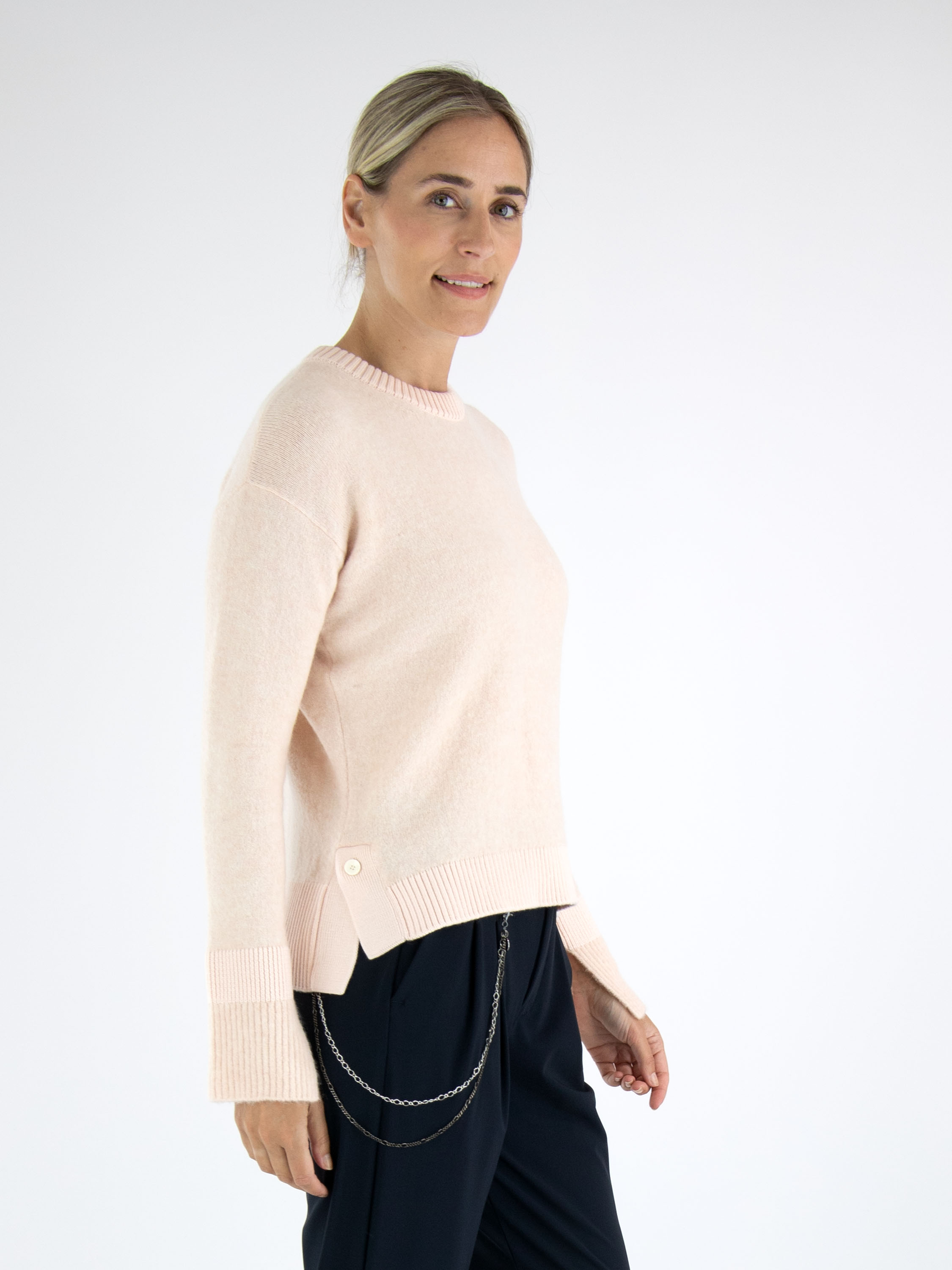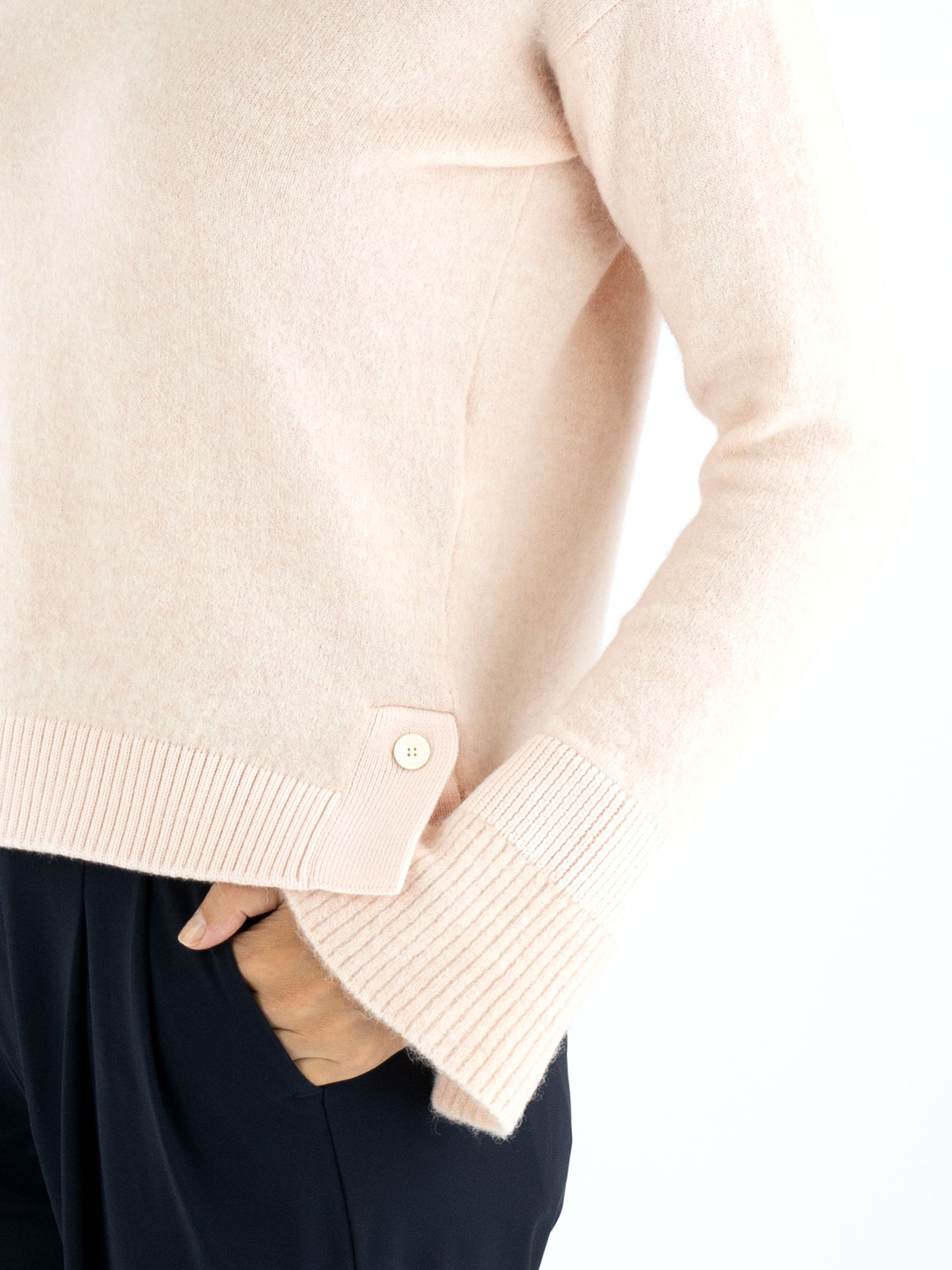 A pullover from High in pastel pink. The pullover has a high round neckline and long sleeves. At the bottom, there is a ribbed knit cuff with a split at the sides featuring a button closure. This pullover can be hand washed.
