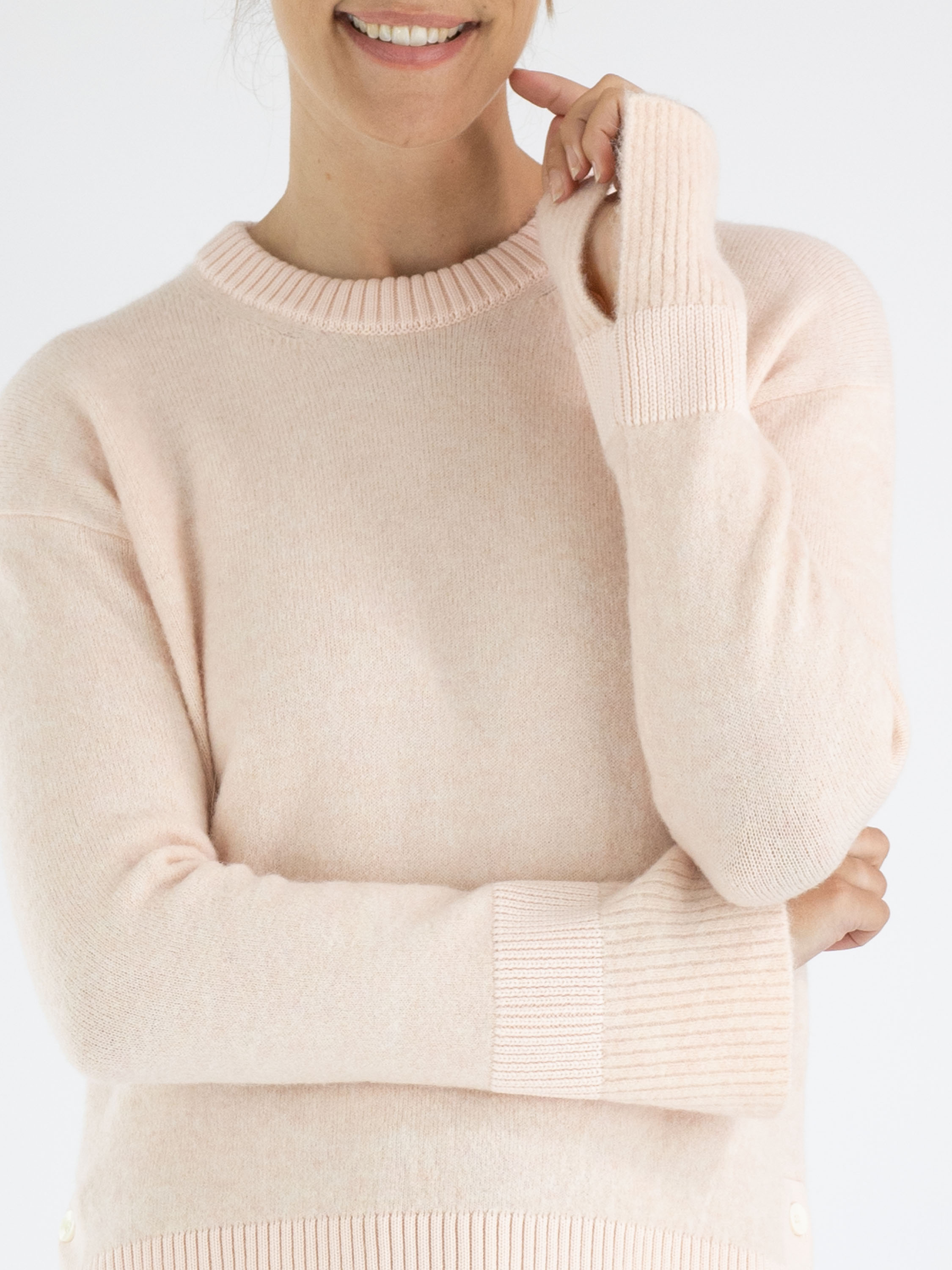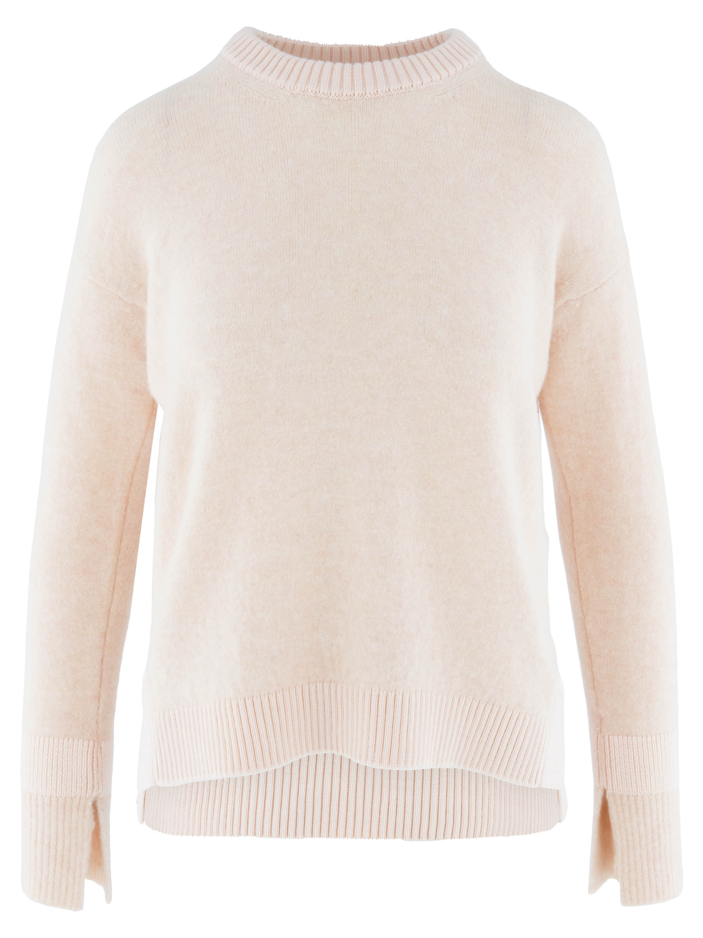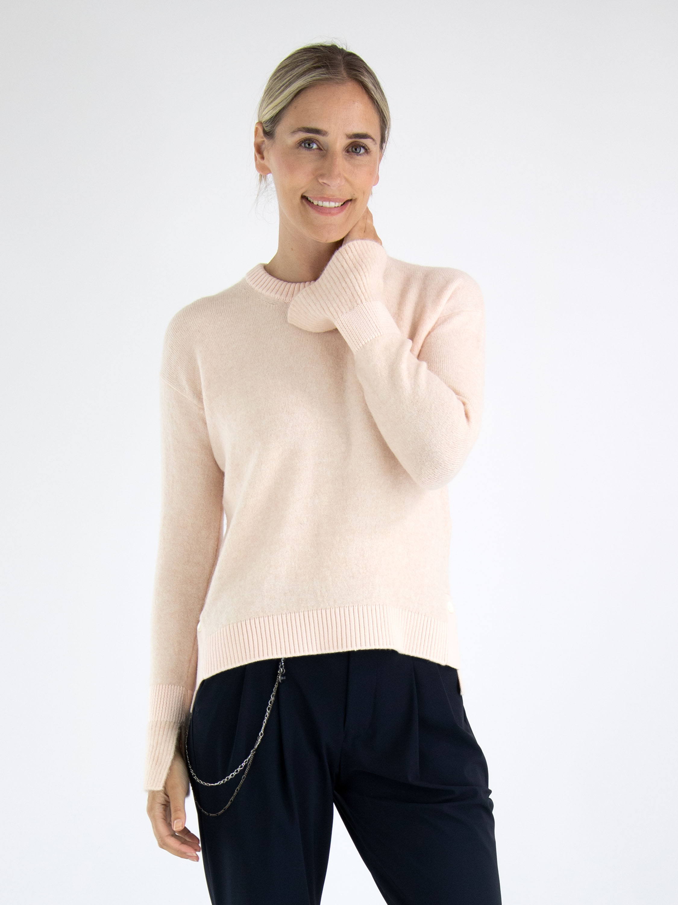 A pullover from High in pastel pink. The pullover has a high round neckline and long sleeves. At the bottom, there is a ribbed knit cuff with a split at the sides featuring a button closure. This pullover can be hand washed.