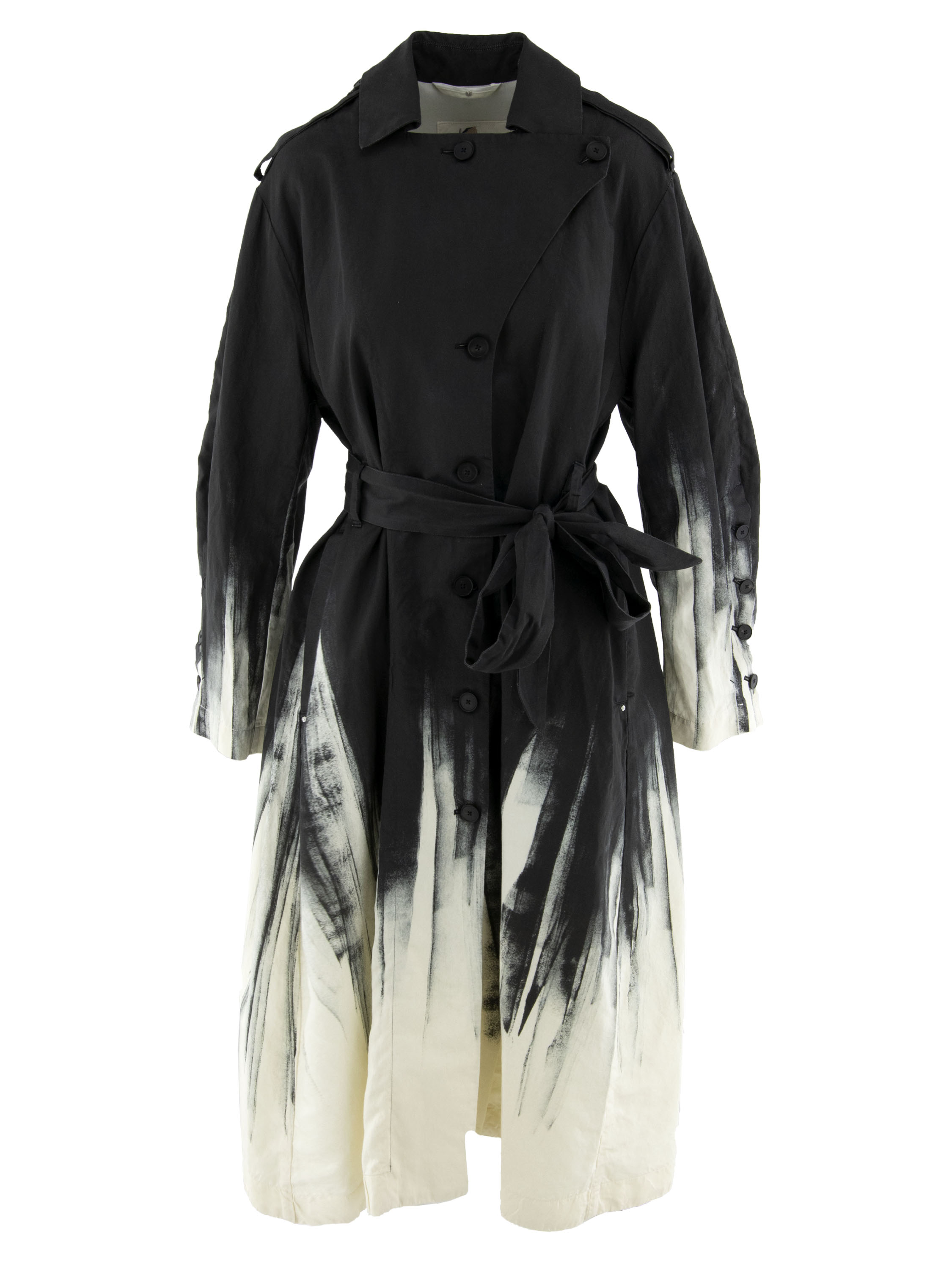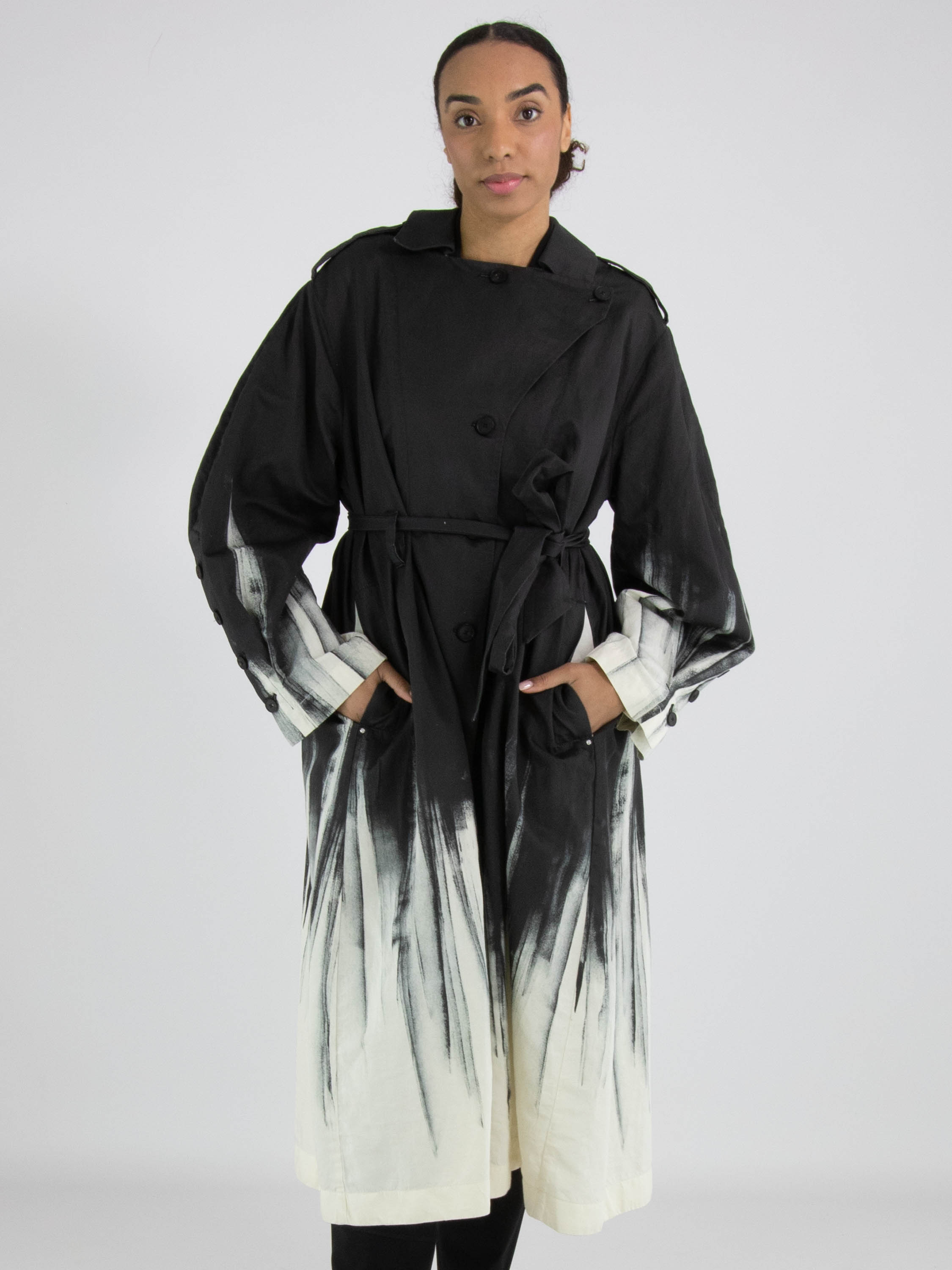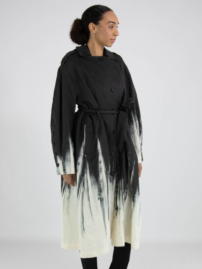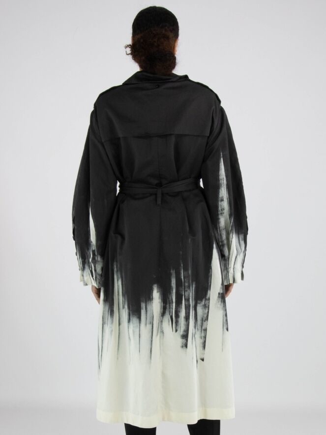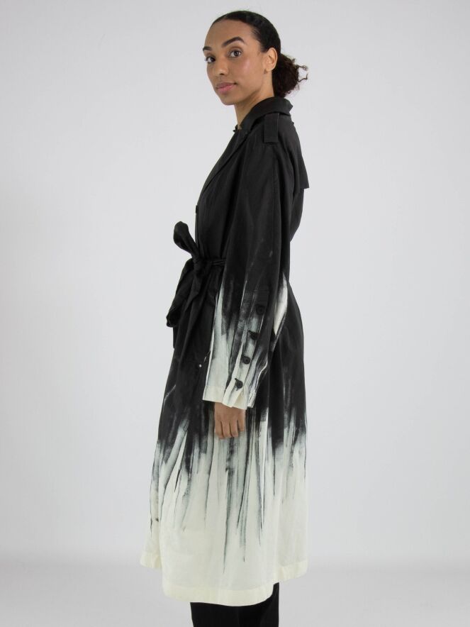 A gabardine coat from High in a paint-look gradient, fading from Italian black at the top to off-white at the hem. The coat is slightly fitted and features a belt in the same fabric at the waist. At the ends of the long sleeves, a stitched pleat with a deep slit is closed with four buttons. The shoulders have epaulettes with button fastening. The gabardine is unlined and must not be washed.