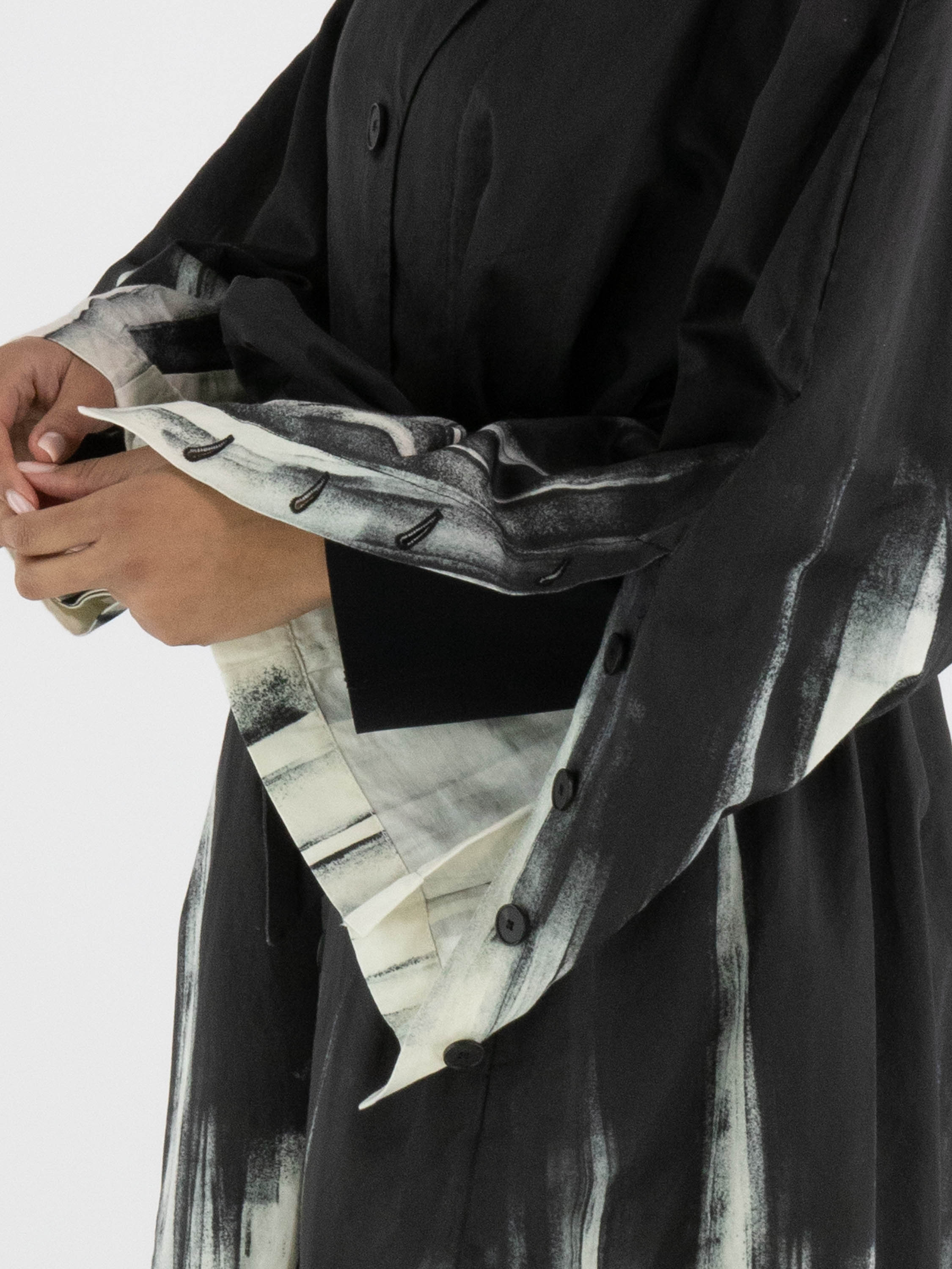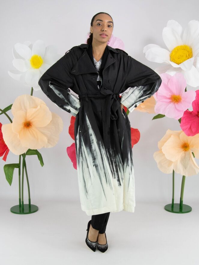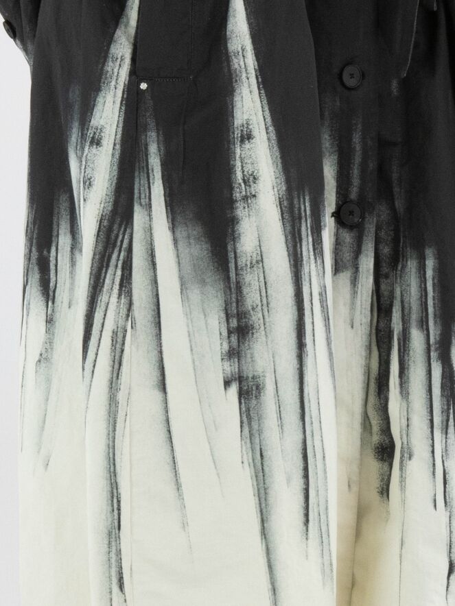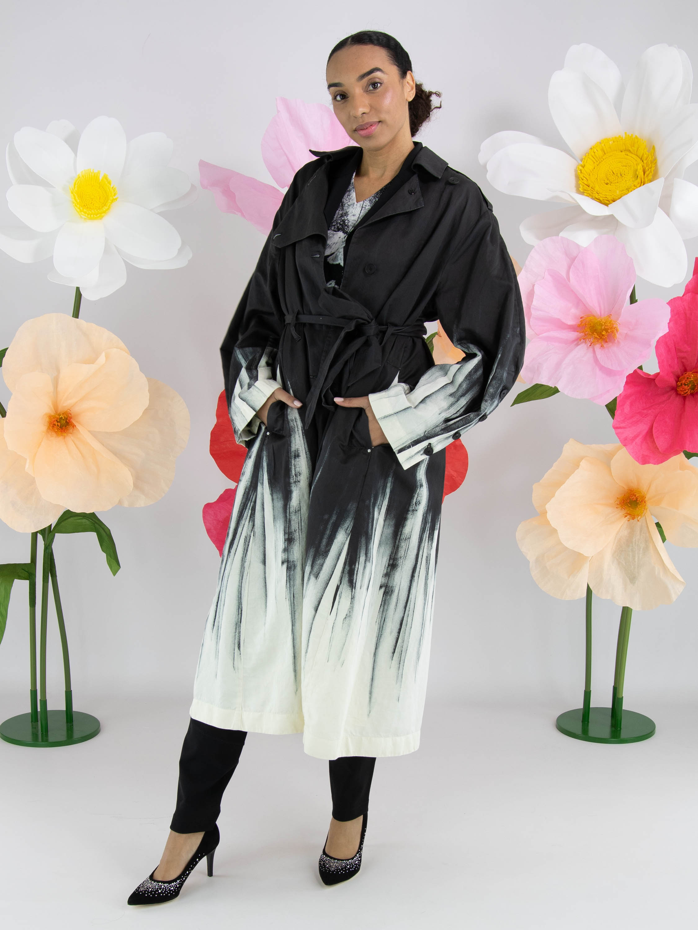 A gabardine coat from High in a paint-look gradient, fading from Italian black at the top to off-white at the hem. The coat is slightly fitted and features a belt in the same fabric at the waist. At the ends of the long sleeves, a stitched pleat with a deep slit is closed with four buttons. The shoulders have epaulettes with button fastening. The gabardine is unlined and must not be washed.