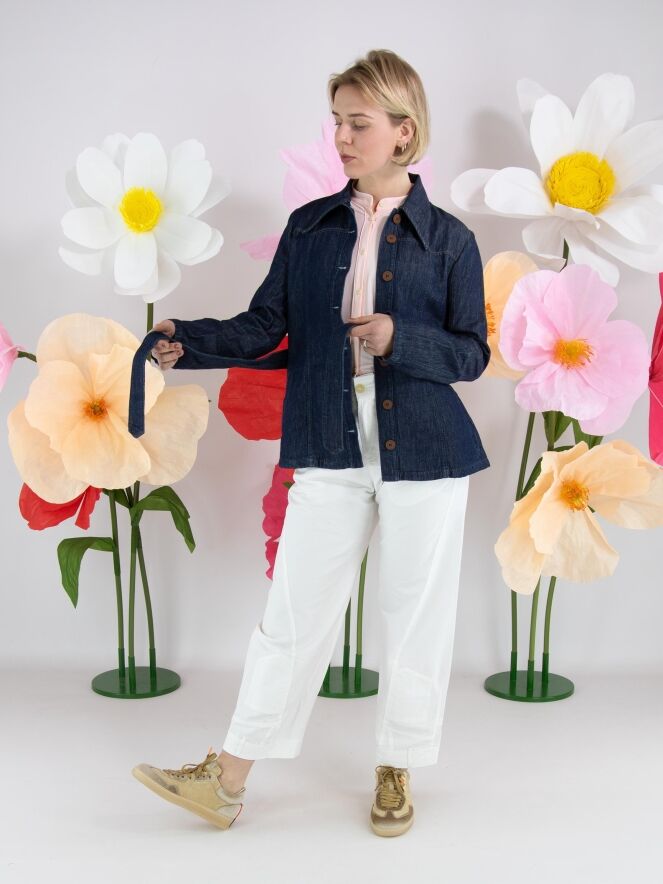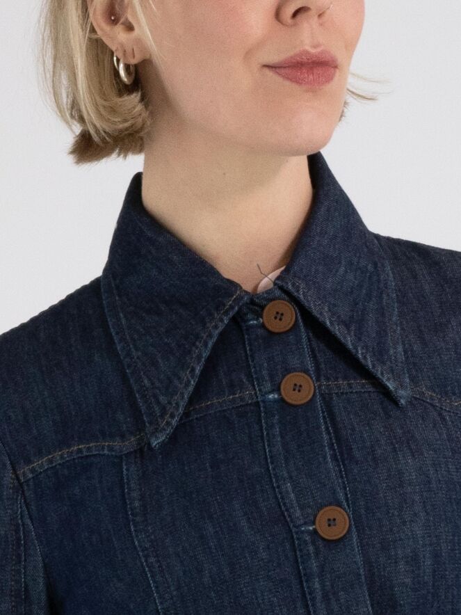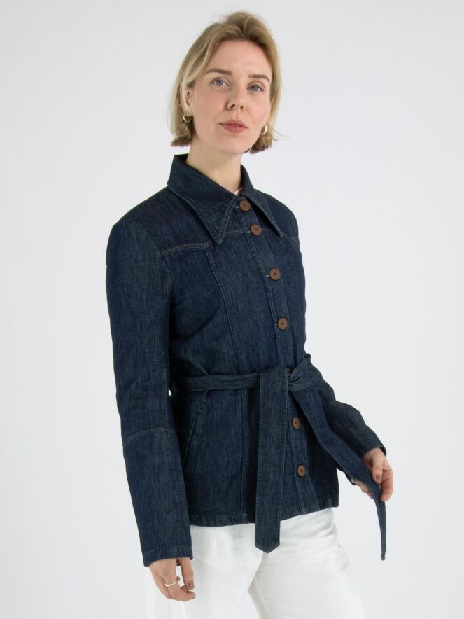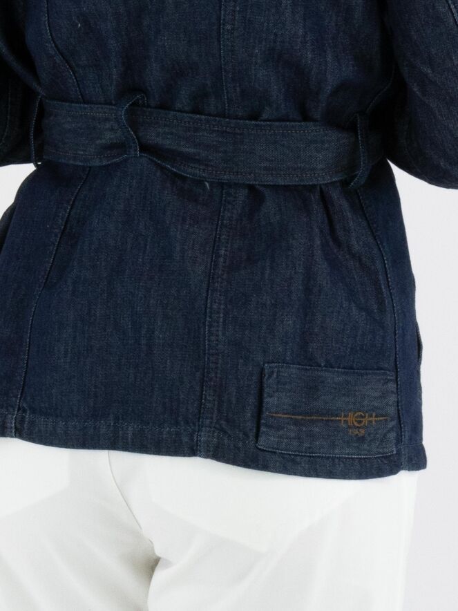A denim blazer from High Lab in a dark denim colour. The stitching and the closure buttons are in a cognac colour. At the waist there is a belt in the same fabric as the blazer. This blazer can be washed at 30 degrees.