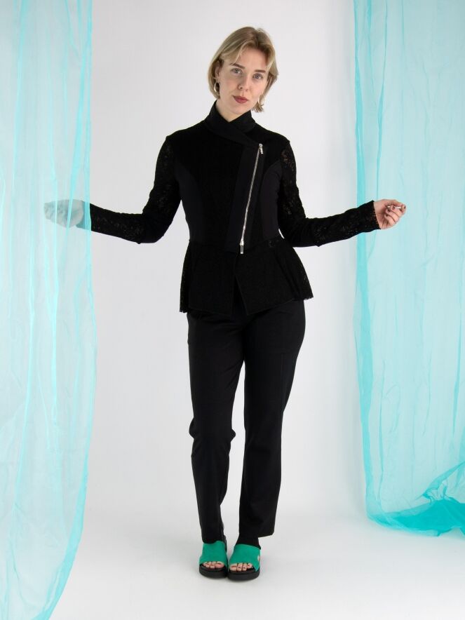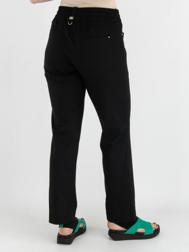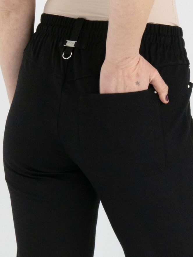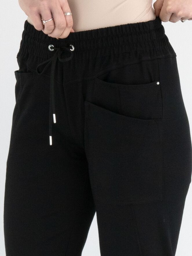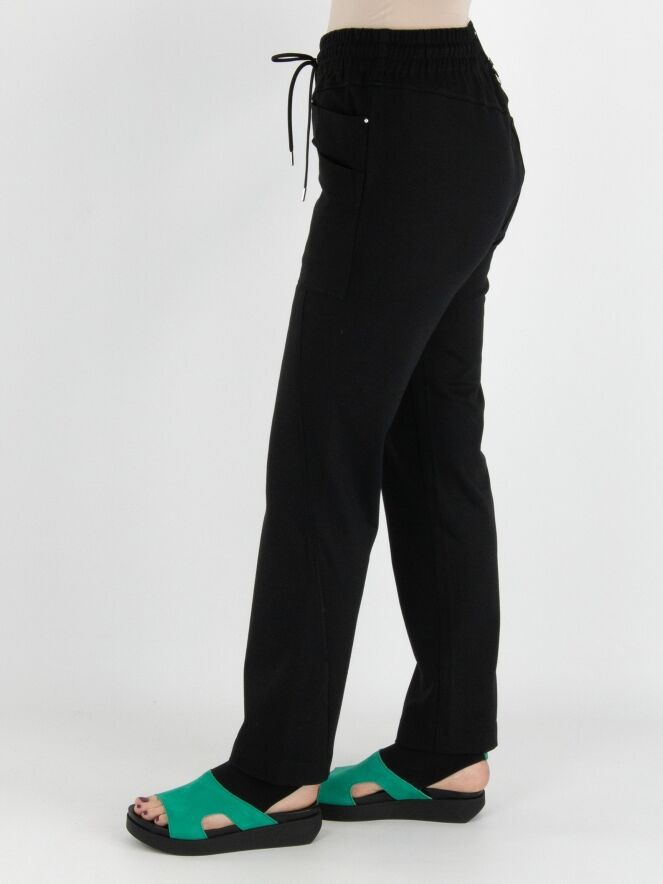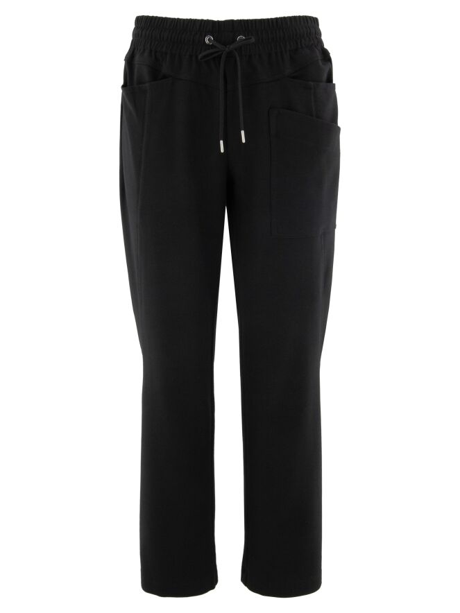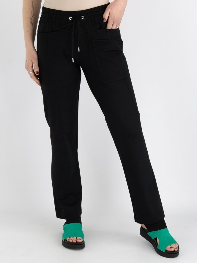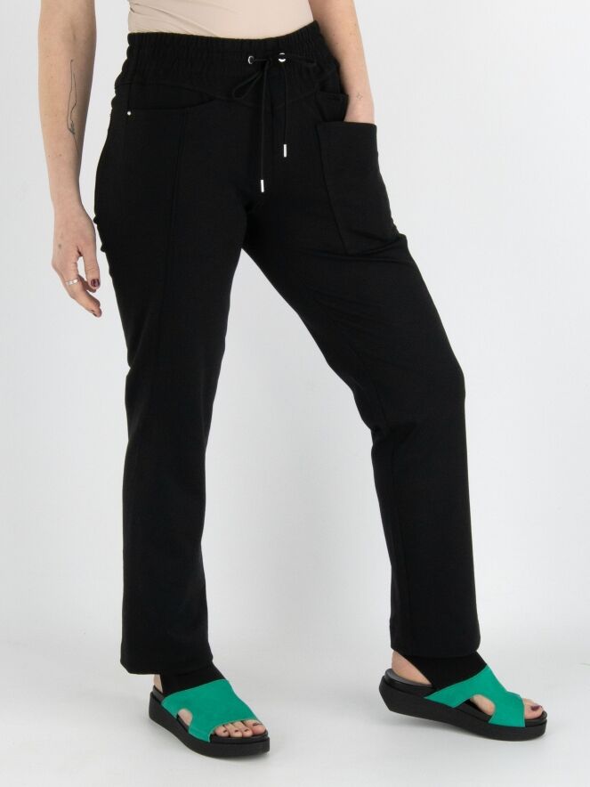 A semi-jogger pants by High in black. There is a wide ribbed and elastic band with a cord in a tunnel processing at the waist. There is a double pocket on the left front. This pants can be washed at 30 degrees.