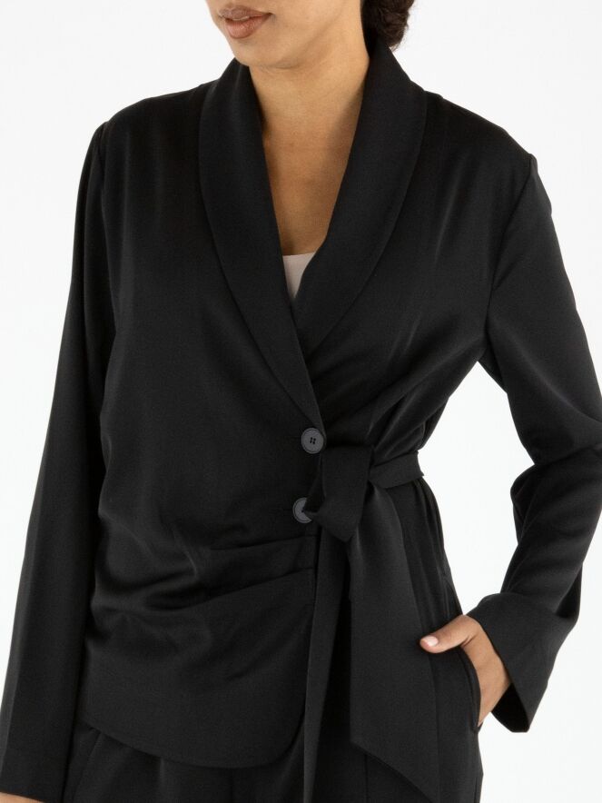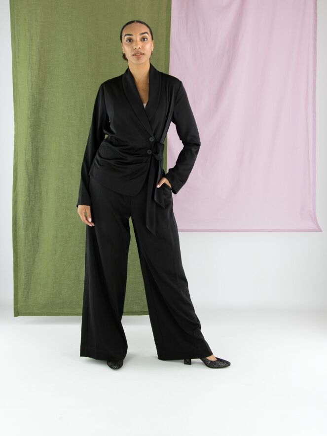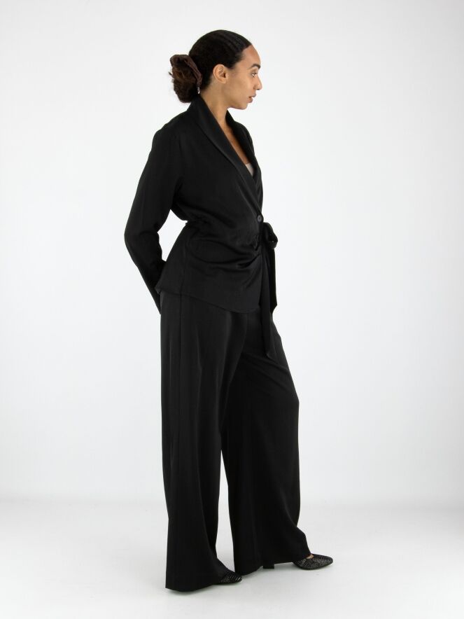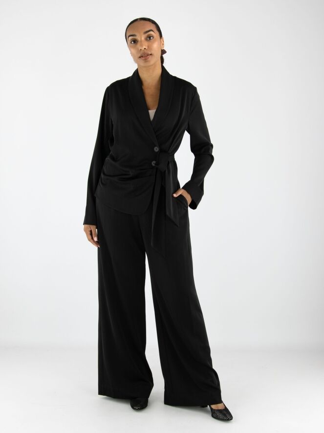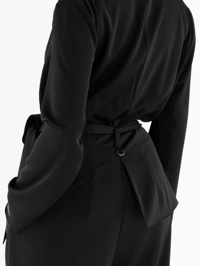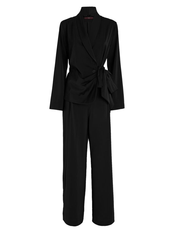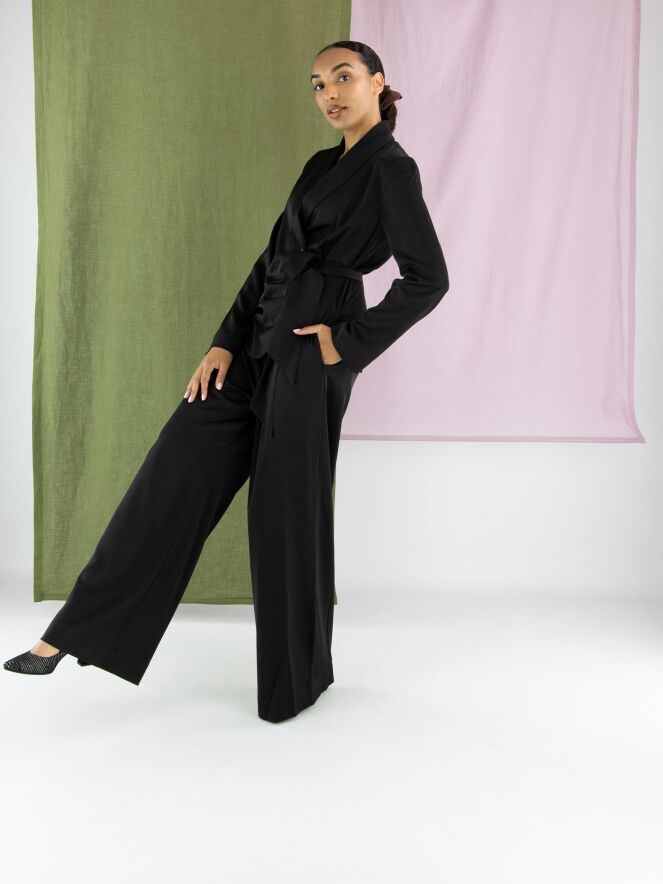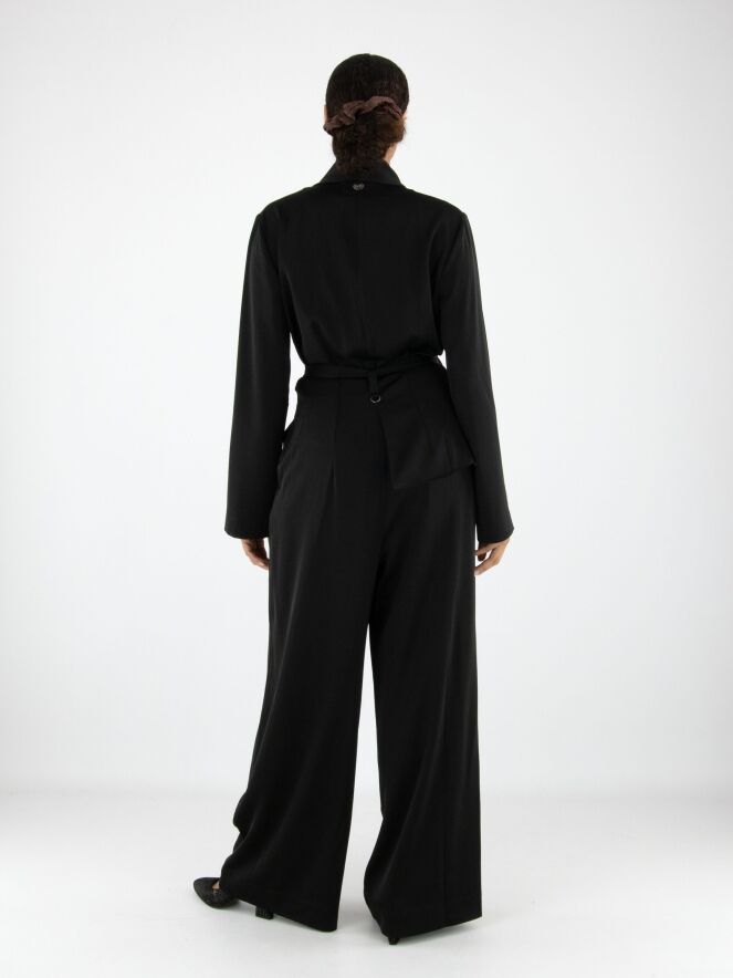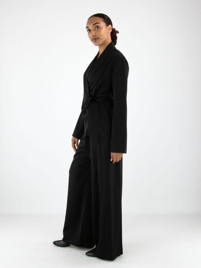 A black jumpsuit by High in a matte satin-look fabric. The top part resembles a blazer, featuring a partially concealed belt at the waist made from the same fabric. From the waist down, the jumpsuit falls straight with wide legs. This jumpsuit should be hand-washed.