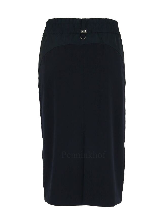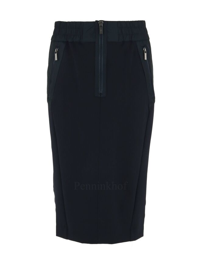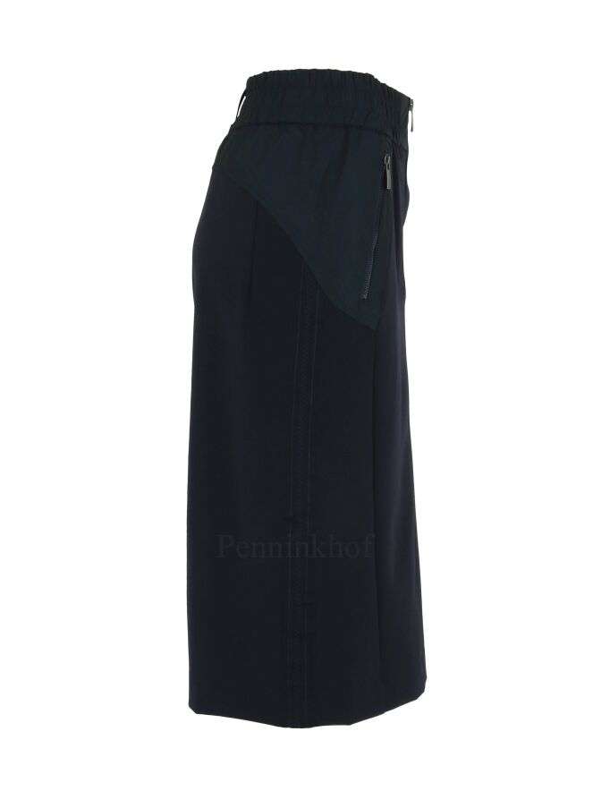 A skirt from High in the color navy blue. At the waist is an elastic band with a matte satin fabric. this fabric also has a trim along the sides and at the pockets with a zipper. This skirt should not be washed.