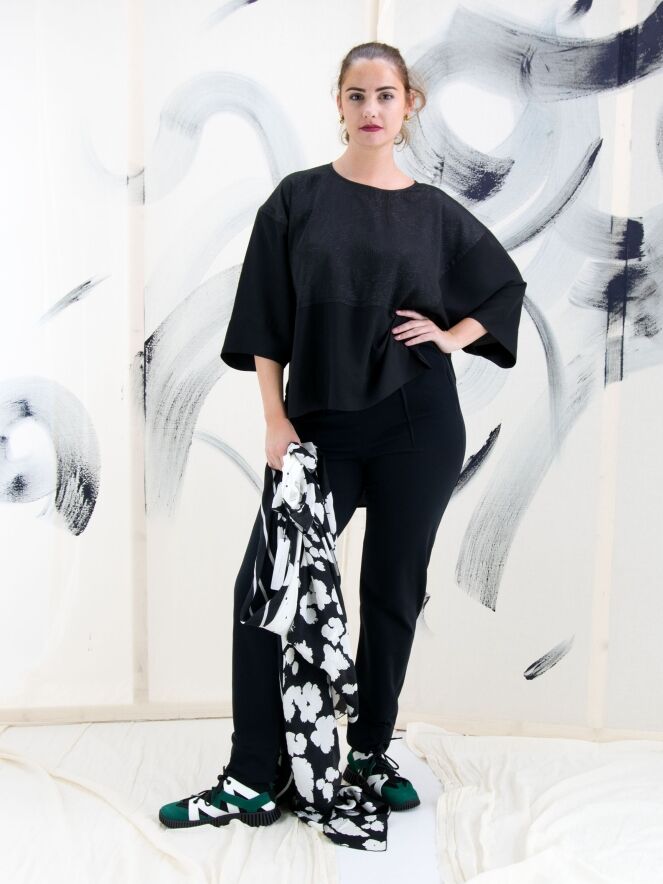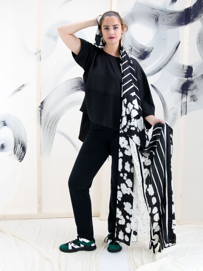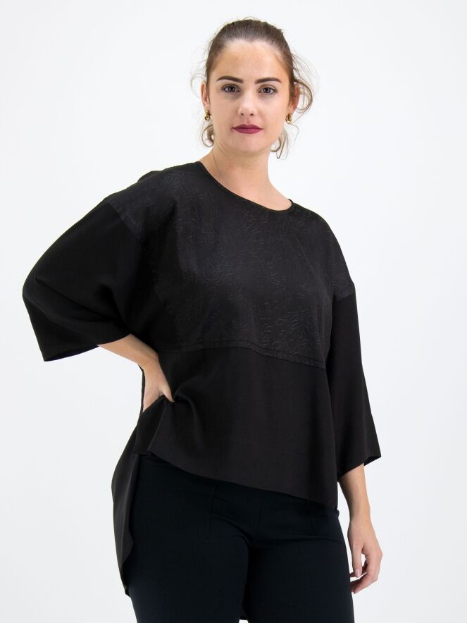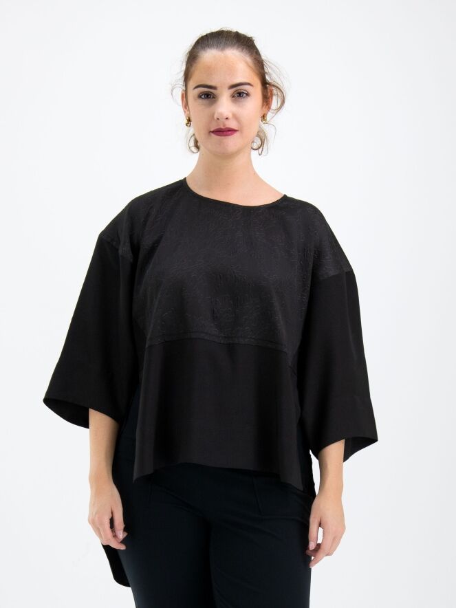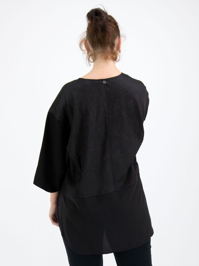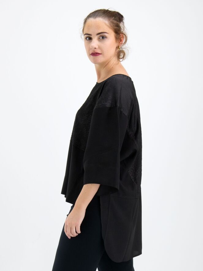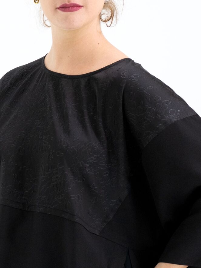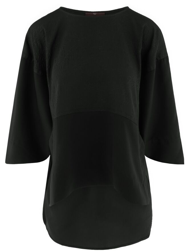 A wide shirt by High in black. Up to the waist, the shirt has a fabric with a graphic relief print, below which the fabric is plain and smooth. From the waist, the sides are open. This shirt can be washed at 30 degrees.