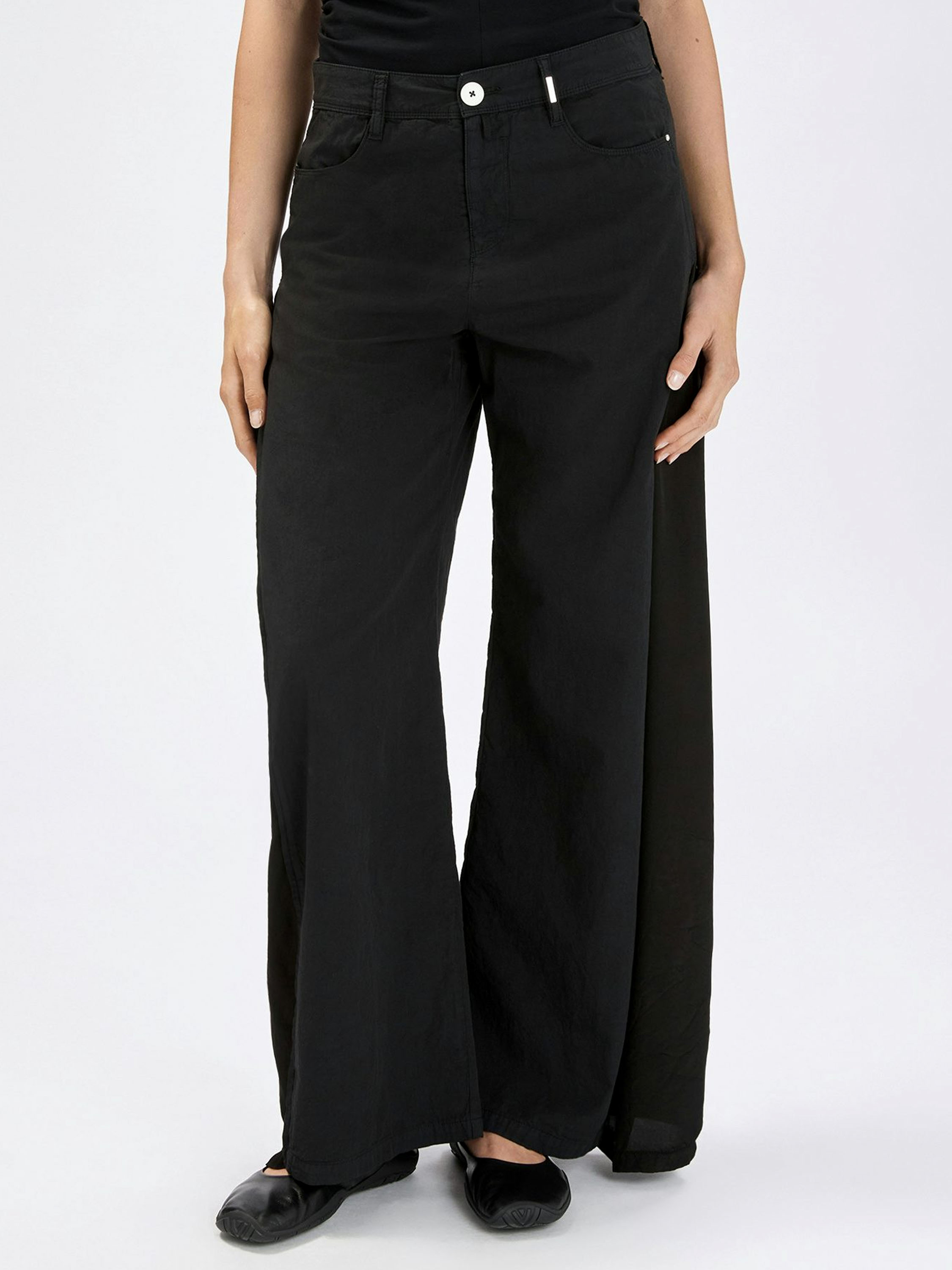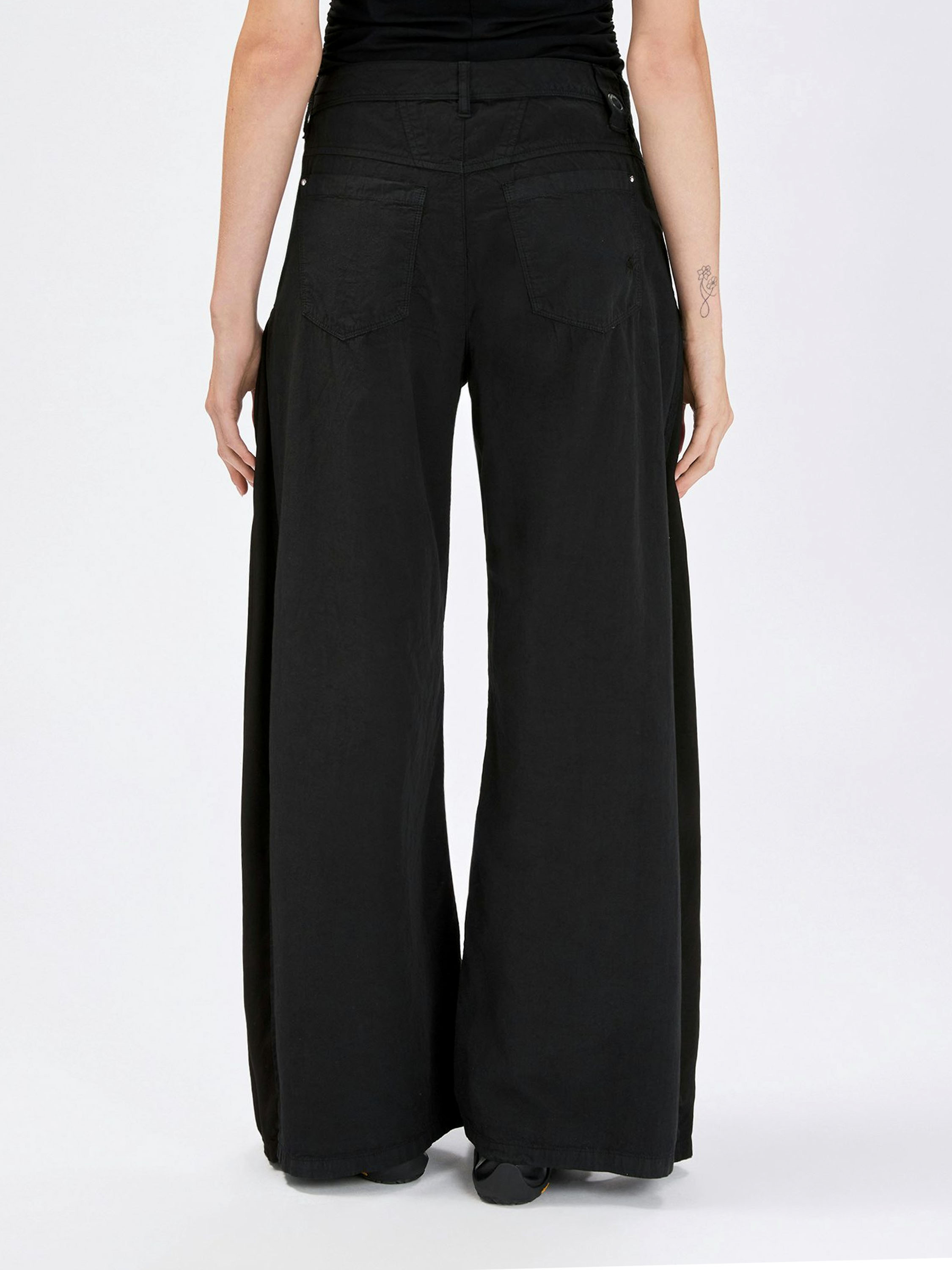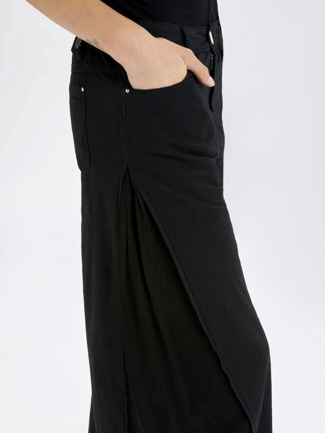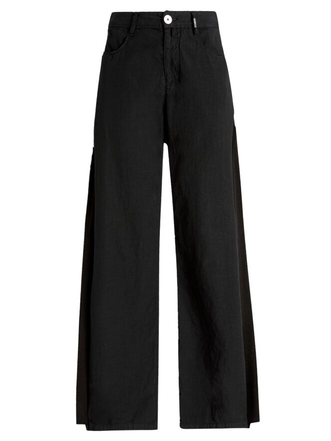 Trousers by High in black. From the hips down to the hem, matte satin panels run along the sides, subtly revealing themselves in motion and creating an elegant contrast. These exclusive designer trousers should be hand-washed.