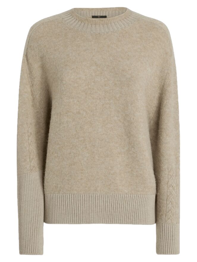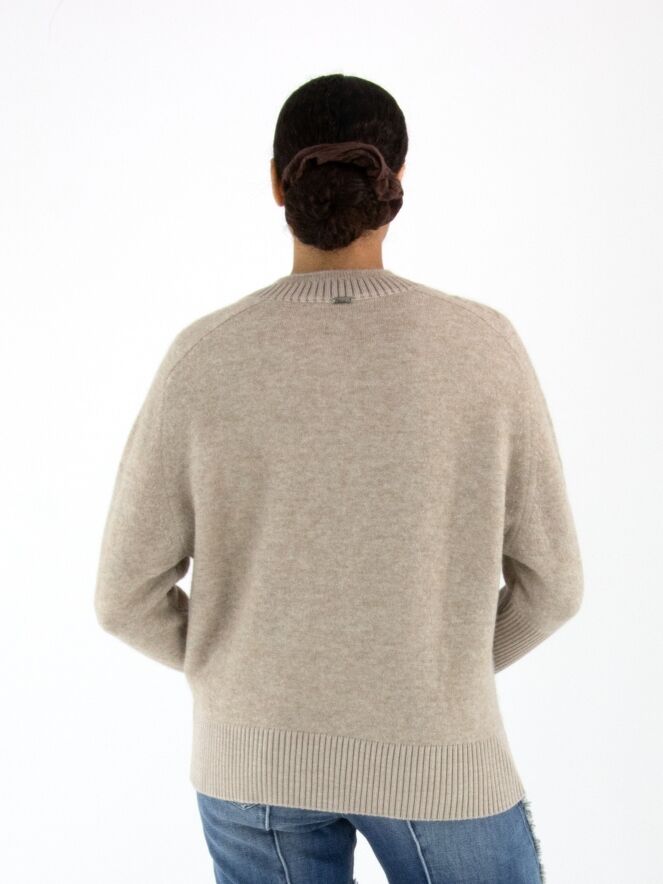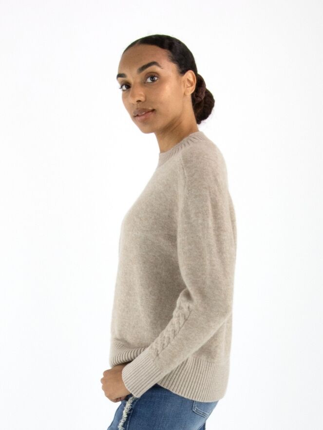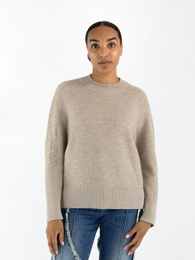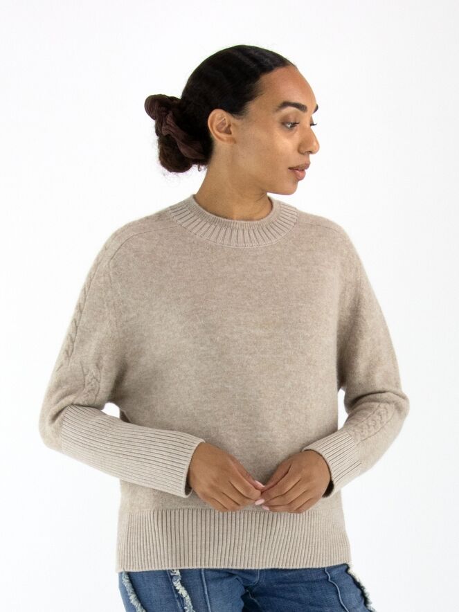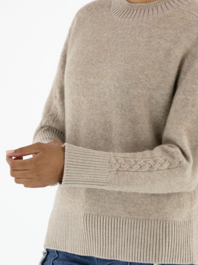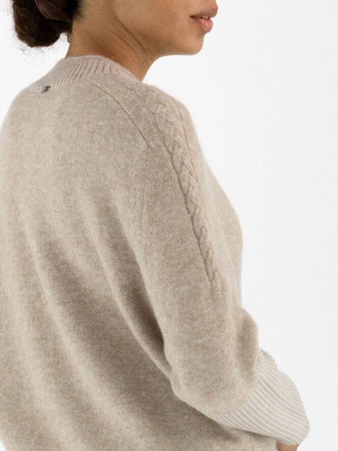 A mottled pullover by High in beige. The round neckline is finished with a ribbed trim. The cuffs and hem feature a fine ribbed structure. From the shoulders, a cable knit detail extends in places down the sleeves. This pullover should be hand washed.