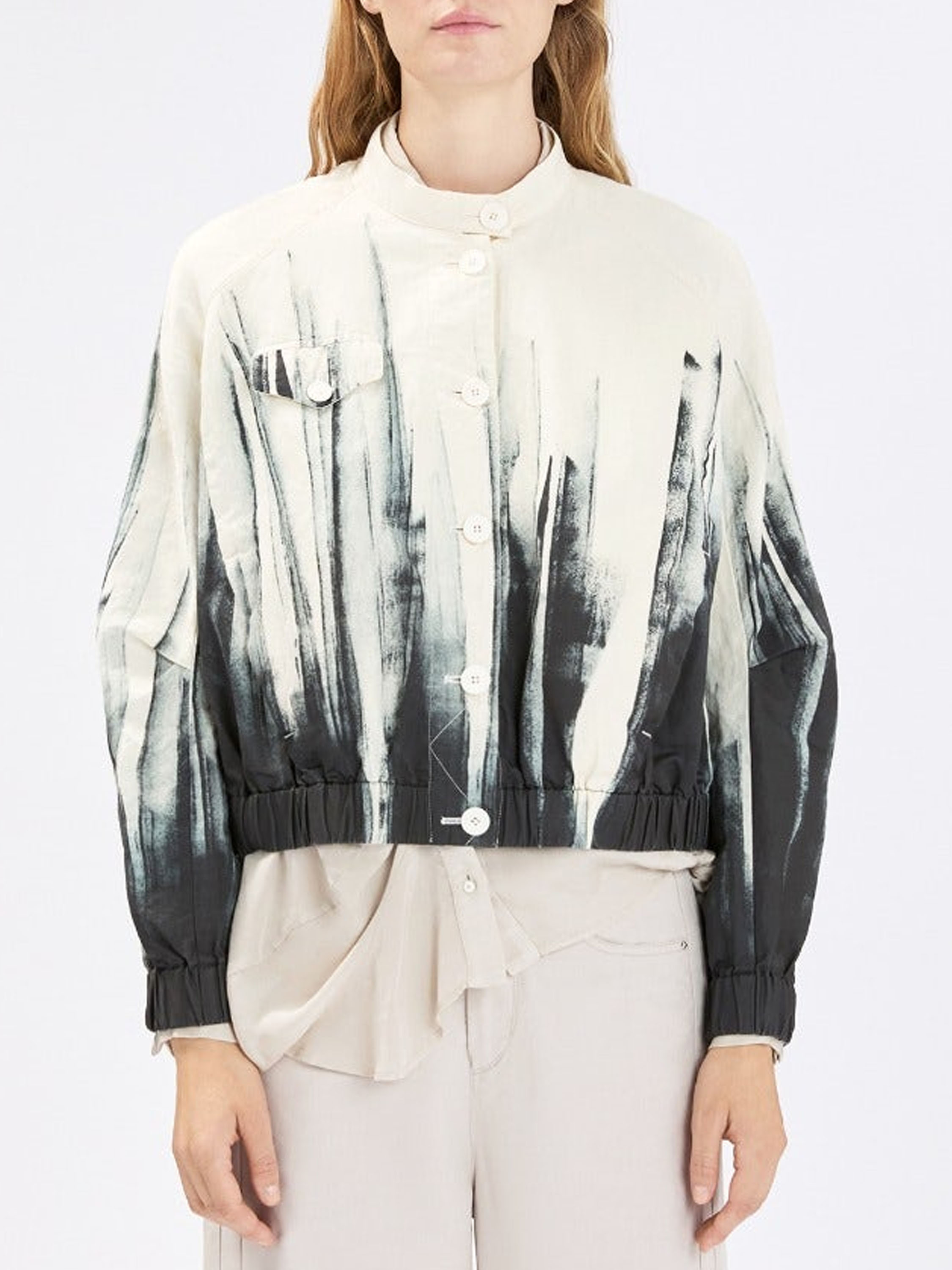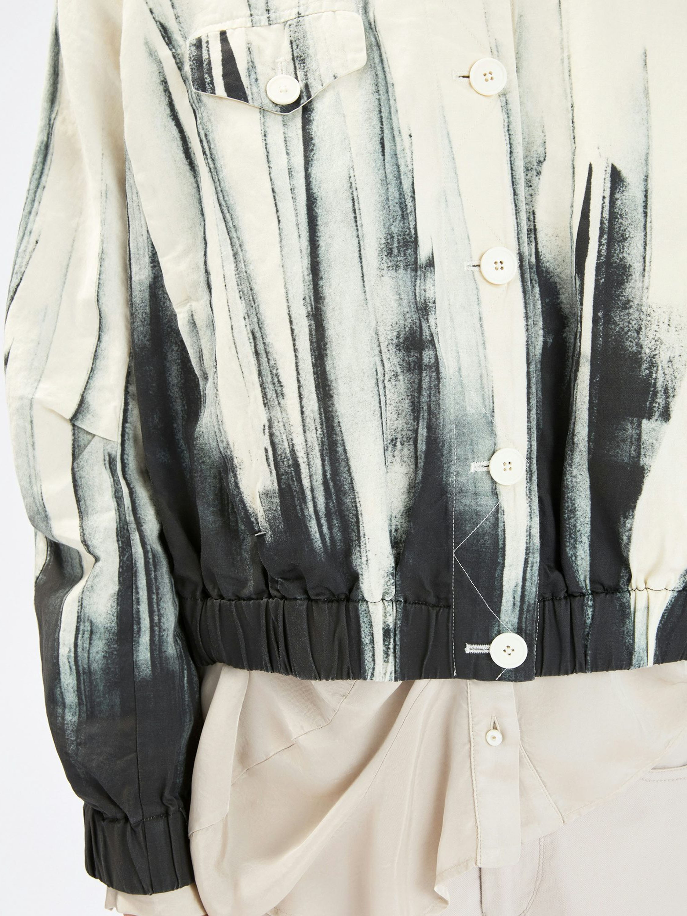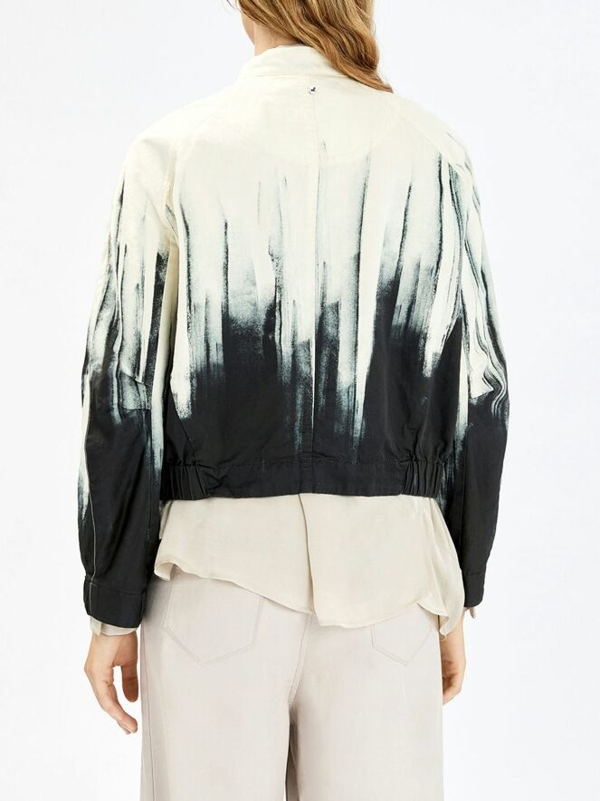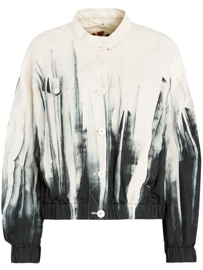 Short blazer by High featuring an artistic paint print in off-white and black. The black paint effect rises from the hem upwards, giving the design a bold and contemporary character. Fastened with six buttons and designed with side pockets at waist level, it is finished with a finely pleated elastic hem for a modern touch. This exclusive designer blazer should not be washed.