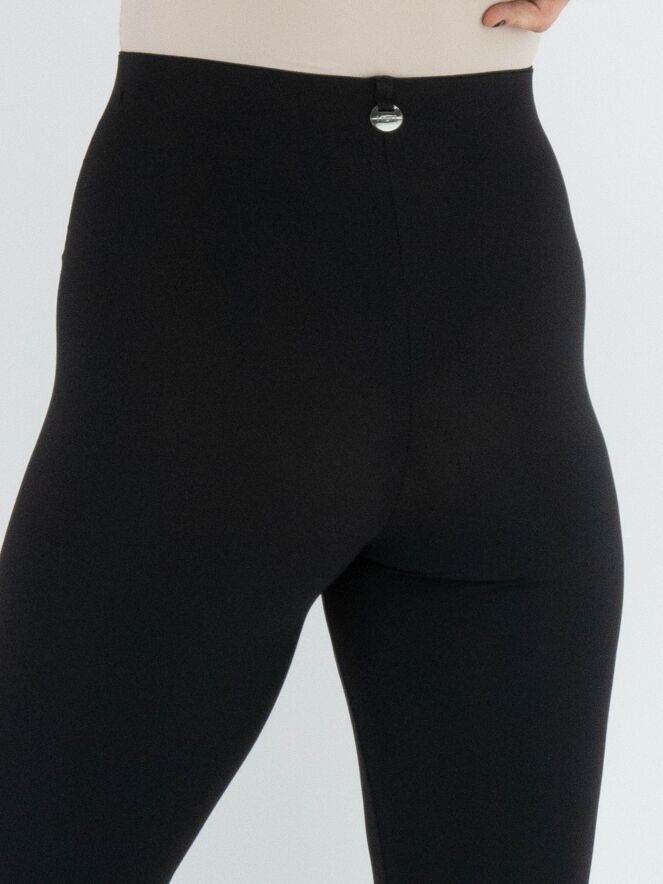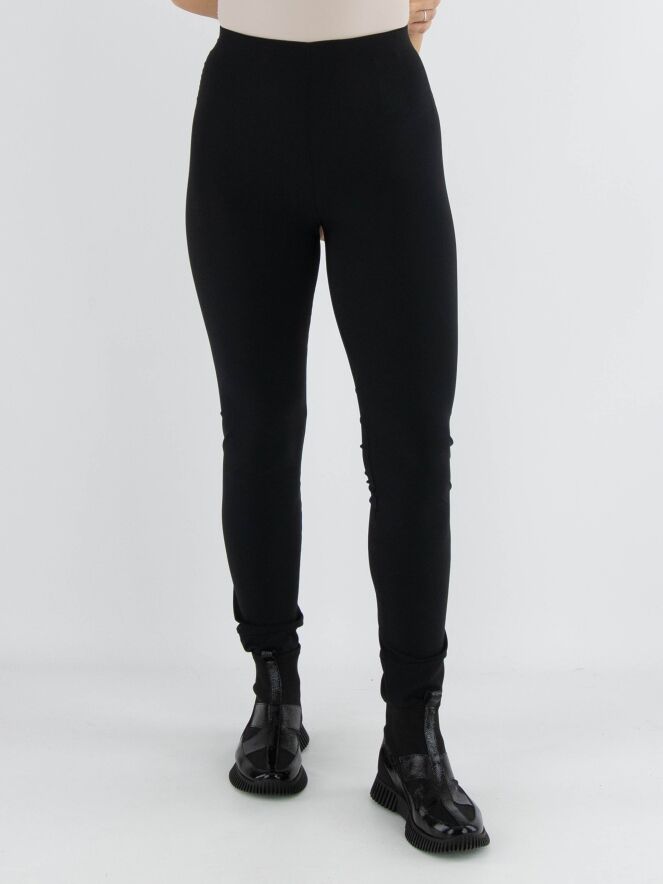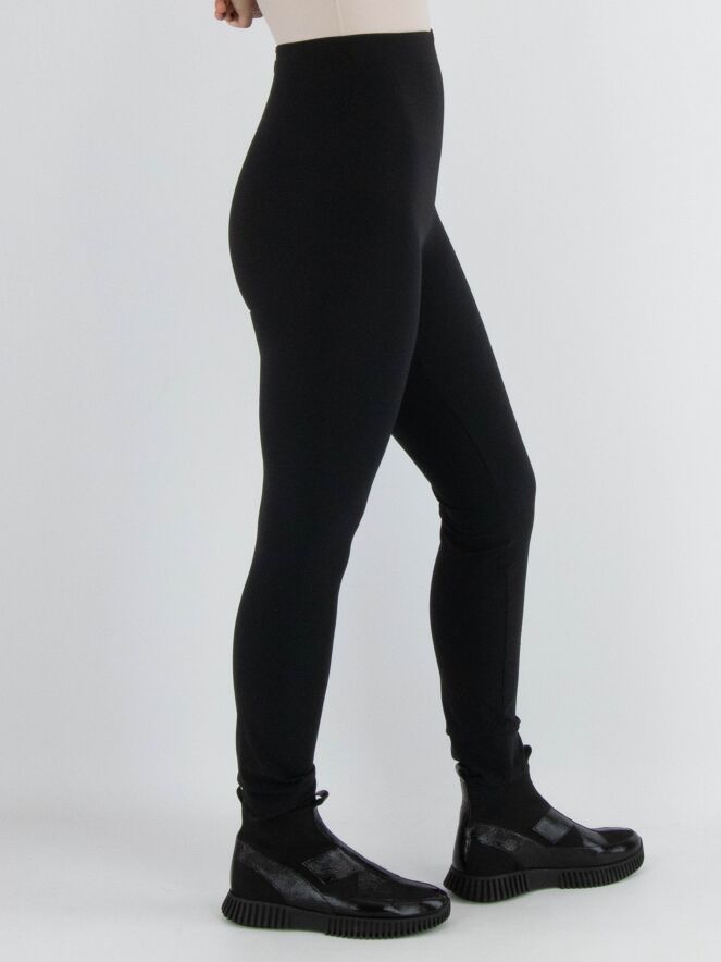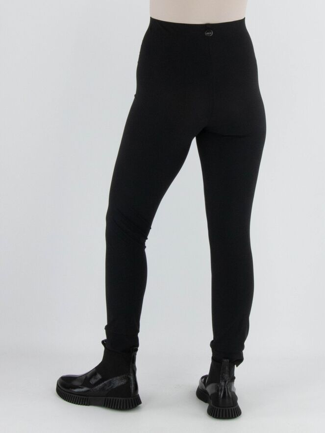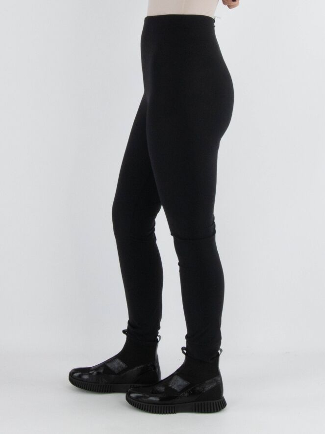 A pair of leggings by High in black. The waistband is elasticated. At the bottom, there is a wide trim with a stitched seam. These leggings can be washed at 30 degrees.