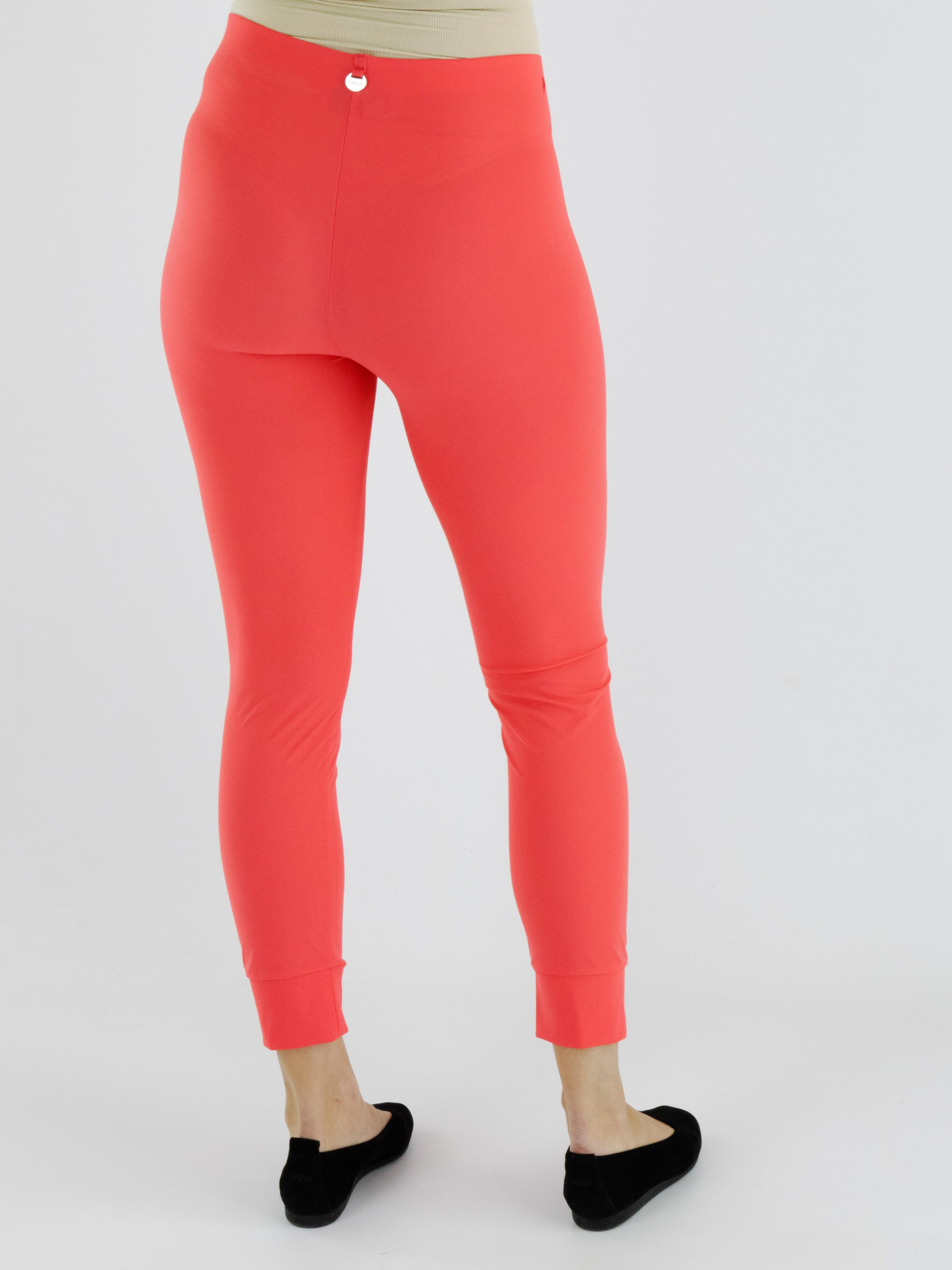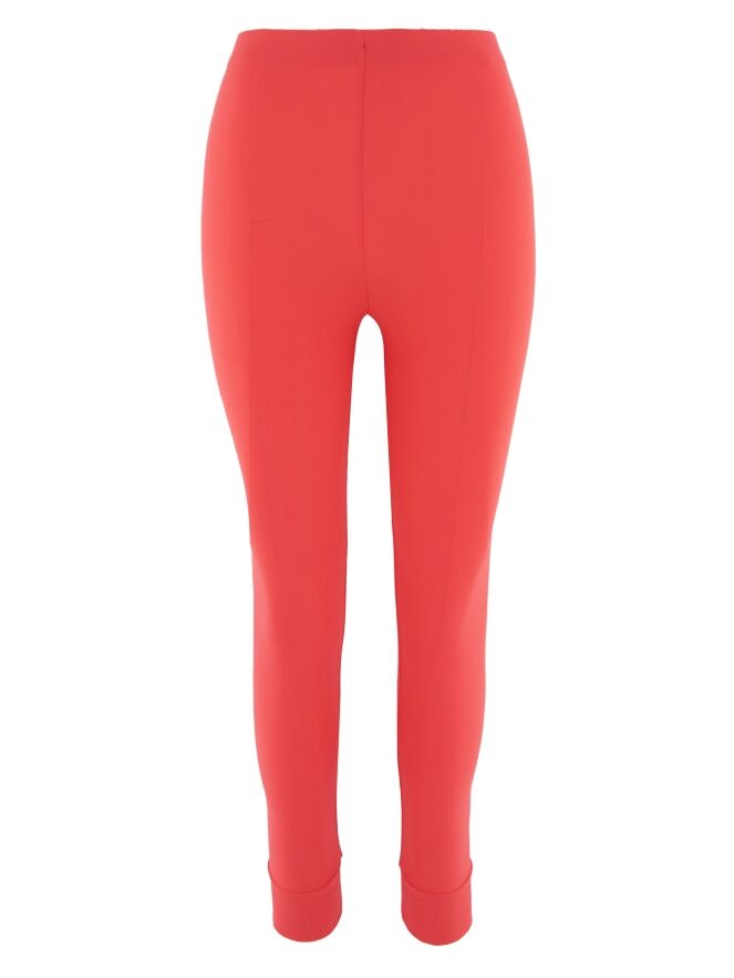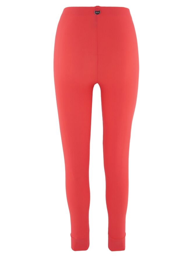 A leggings by High in coral red. There is an elastic band at the waist. At the bottom, there is a wide trim with a seam. These leggings can be washed at 30 degrees.