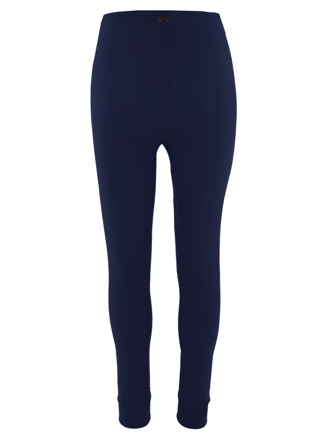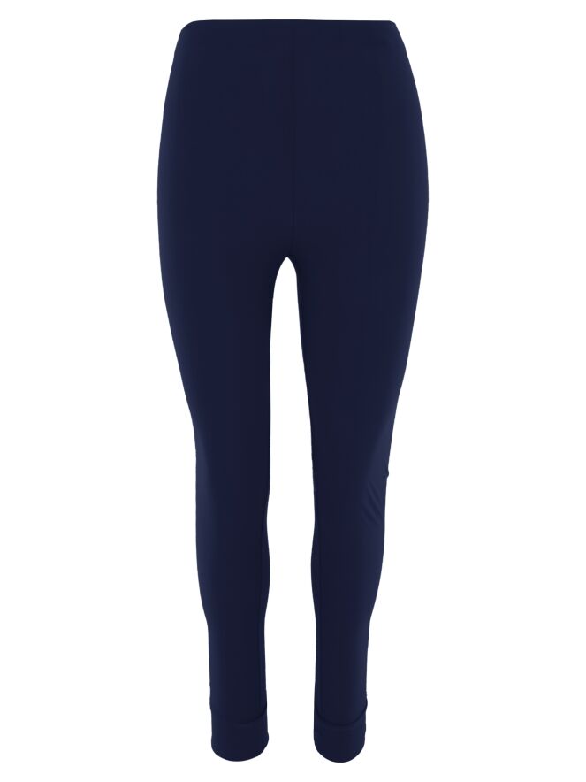 A legging from High in indigo blue. The waist features an elastic band. At the bottom, there is a wide trim with a seam. These leggings can be washed at 30 degrees.