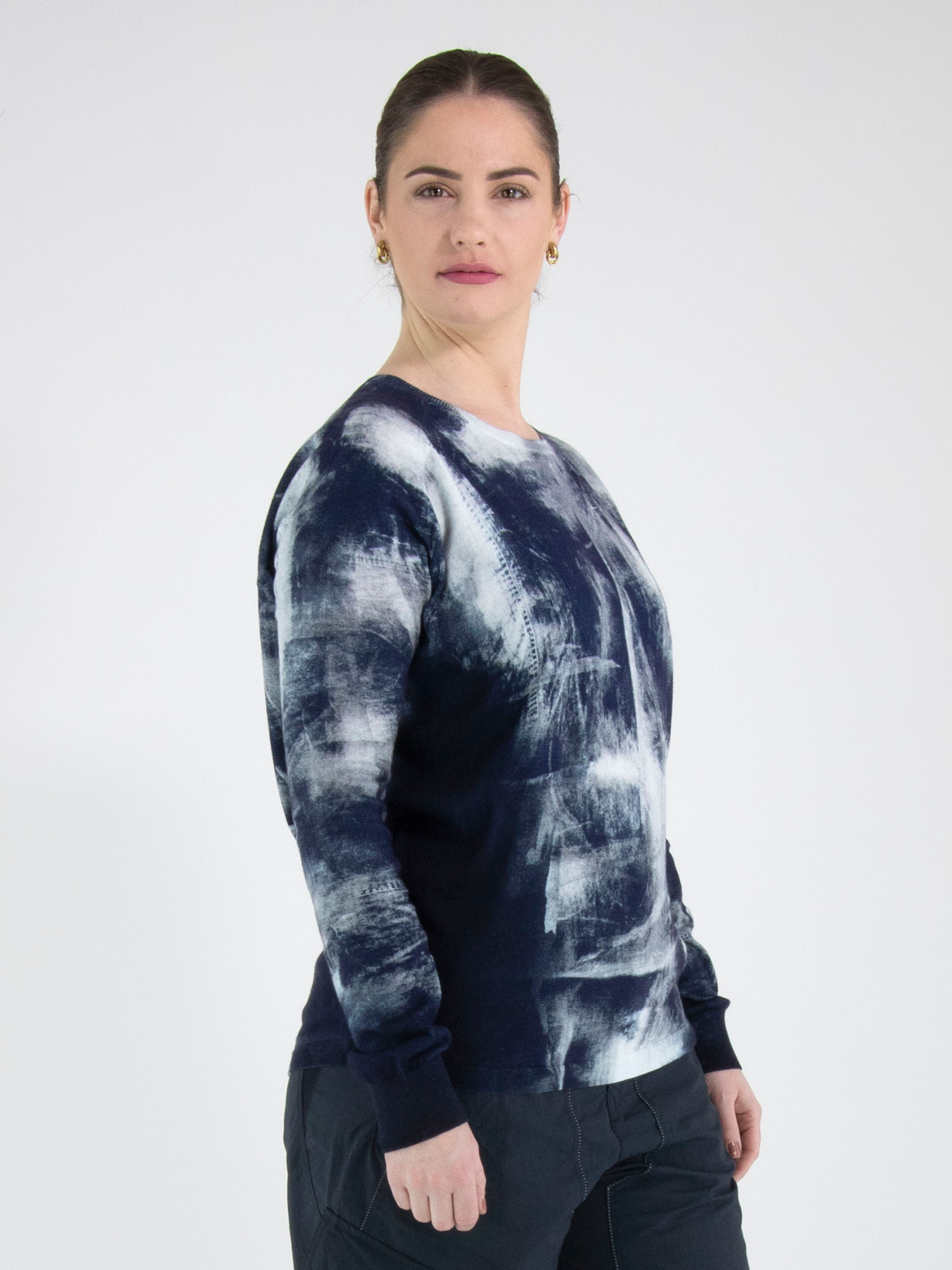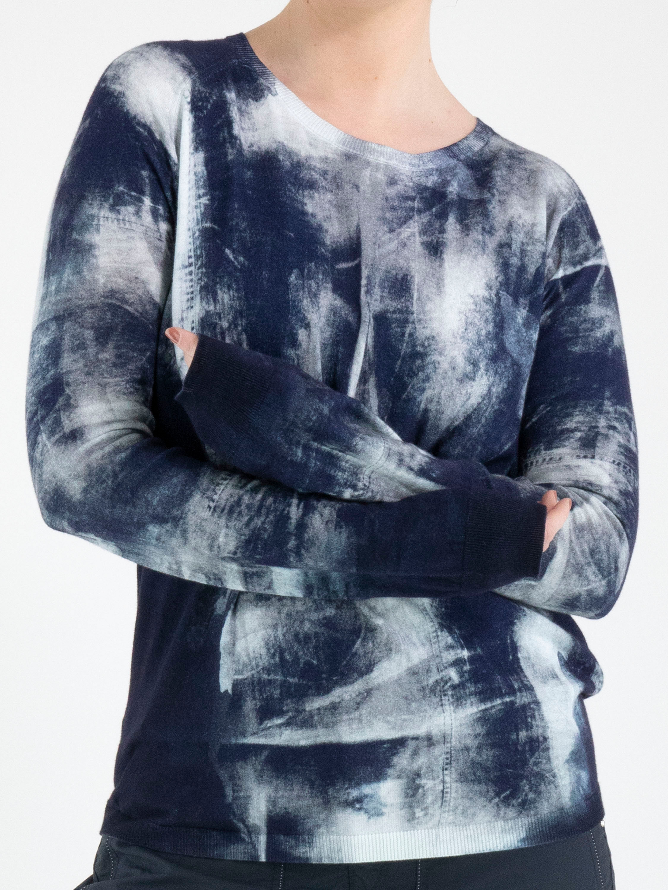 A pullover from High with a graphic print in various shades of blue. Along the edge of the round neckline, the ends of the long sleeves and the hem, there is a finely ribbed knit trim. This pullover must not be washed.