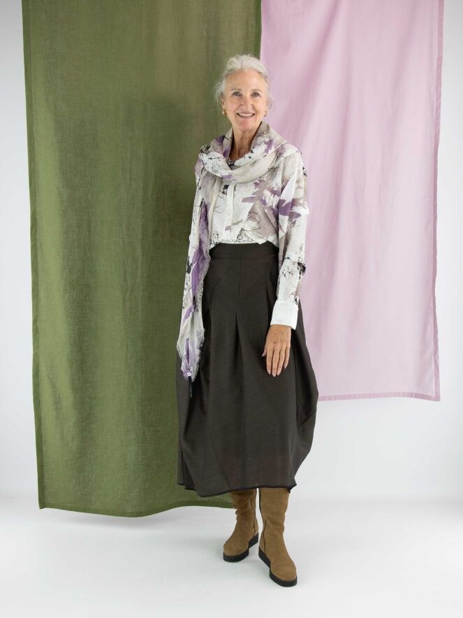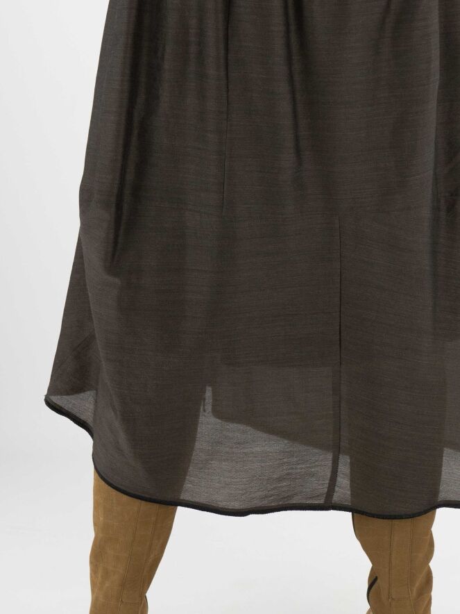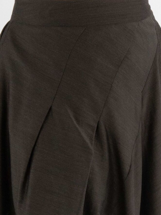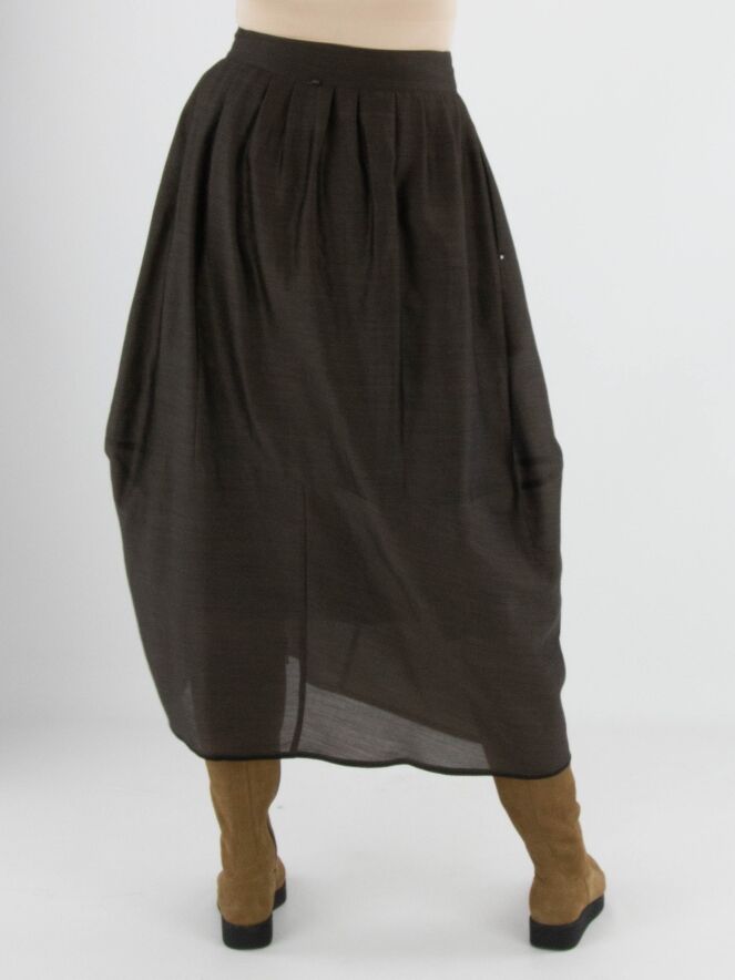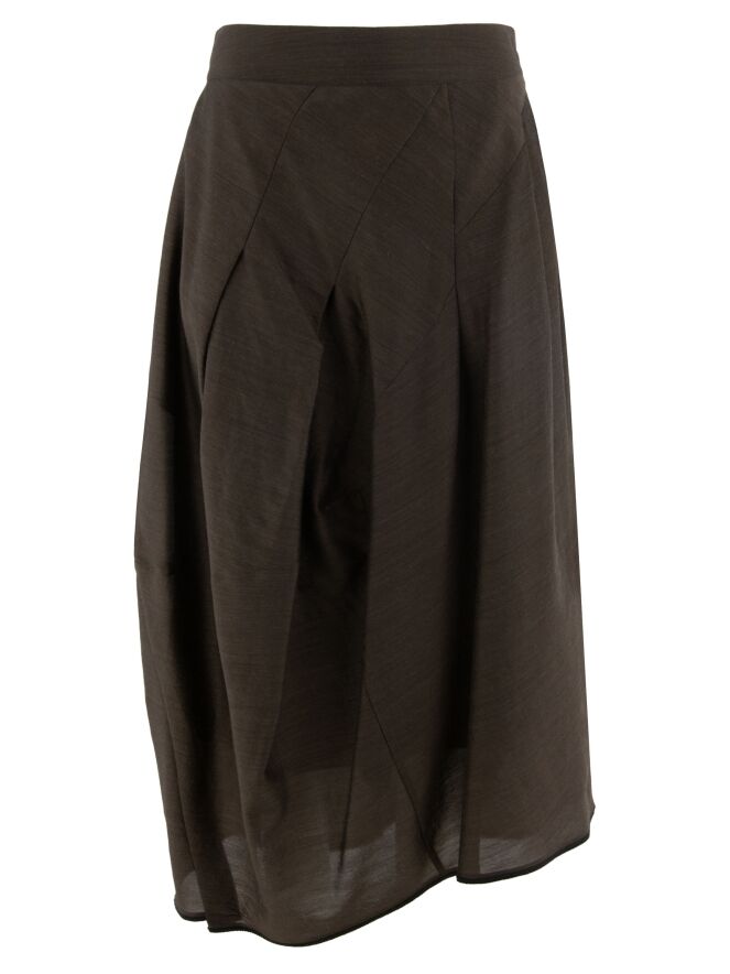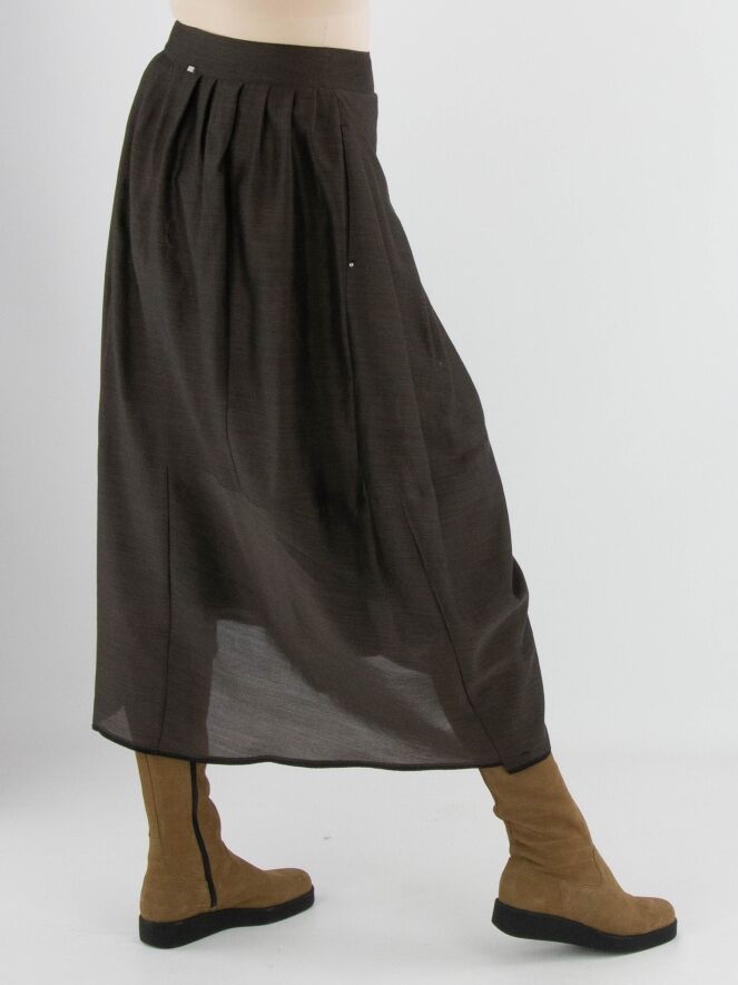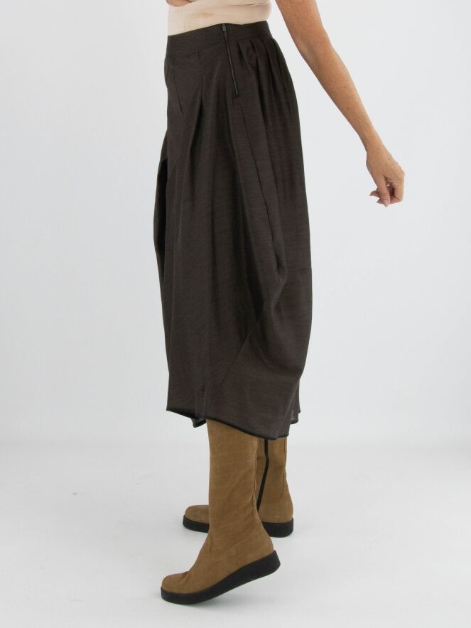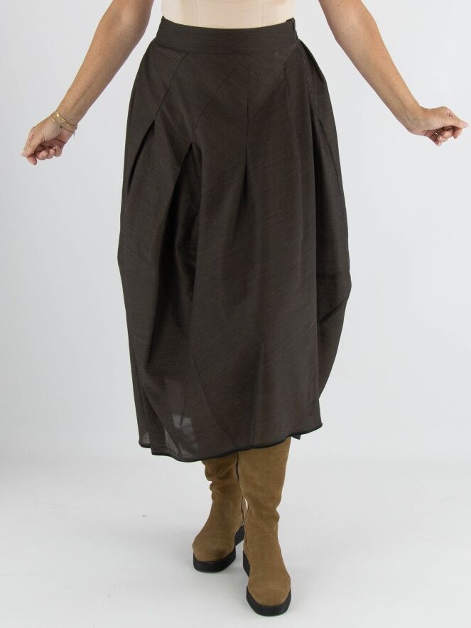 Matte satin skirt by High in two shades of mocha brown. Below the waistband are several diagonal seams with pleats in some areas. The skirt has an A-line shape and a slit pocket on the right side below the waist. This skirt must not be washed.