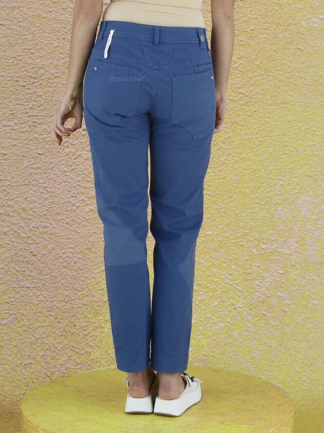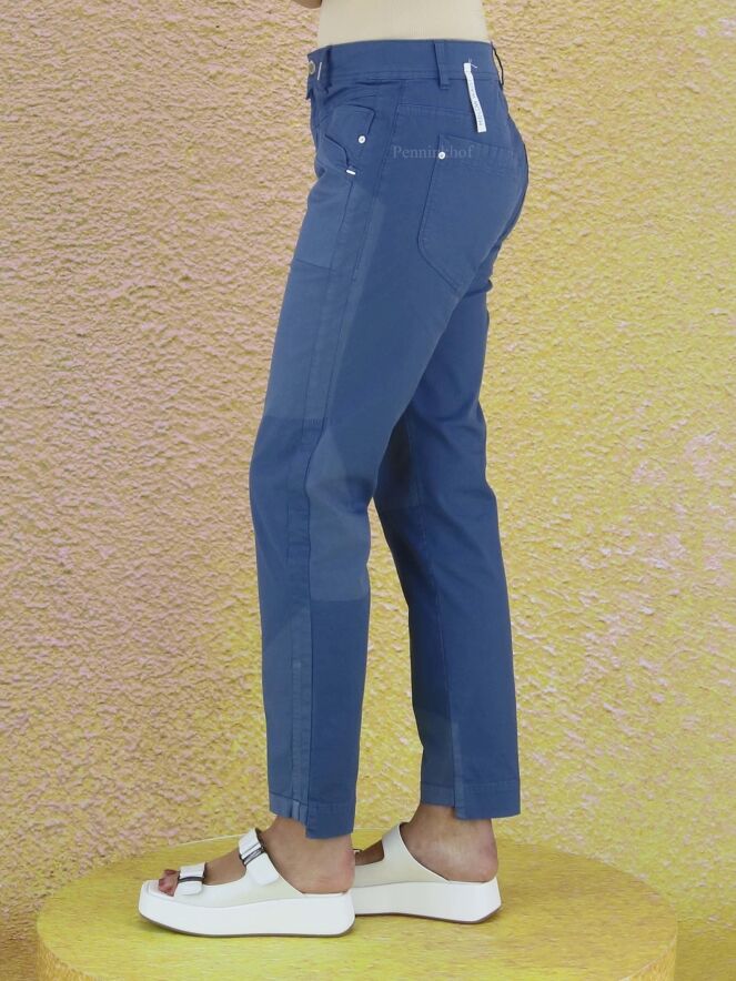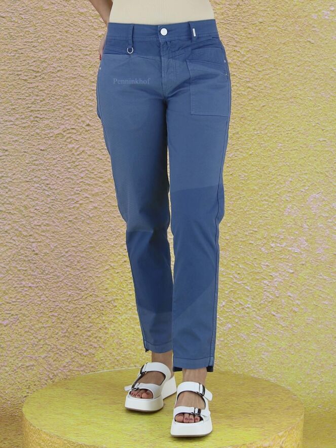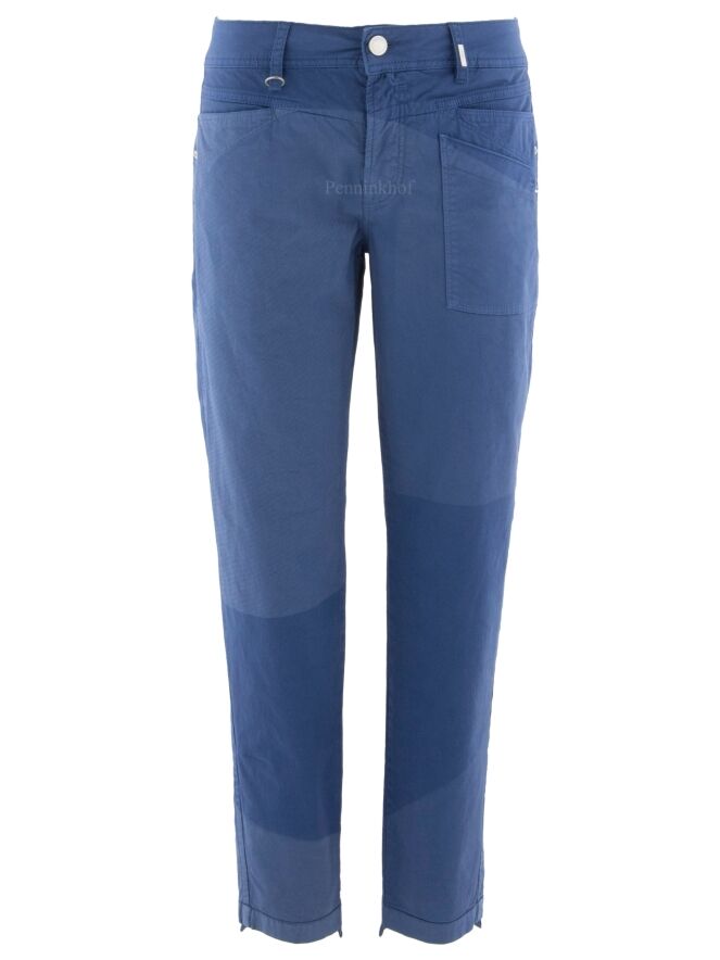 Pants from High in the color blue. The pants have several surfaces with different shades and on the left leg there is a light stripe pattern on the upper leg. These pants can be washed at 30 degrees.