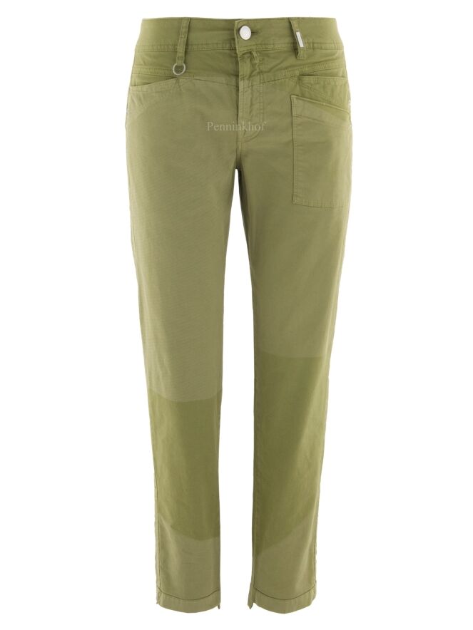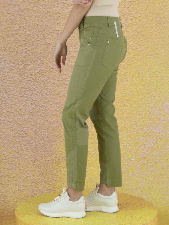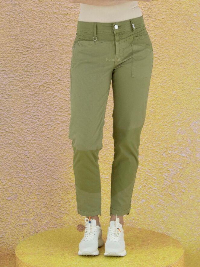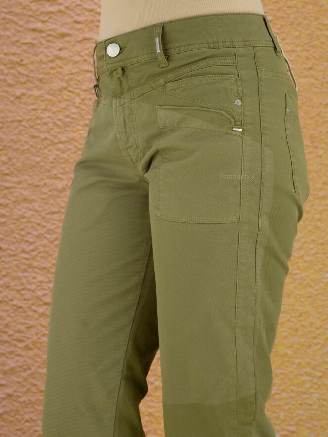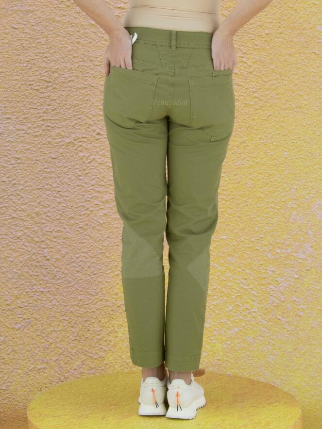 Pants from High in the color green. The pants have several surfaces with different shades and on the left leg there is a light stripe pattern on the upper leg. These pants can be washed at 30 degrees.