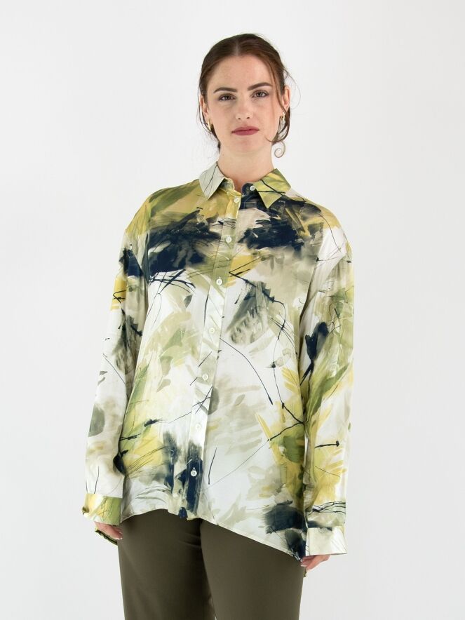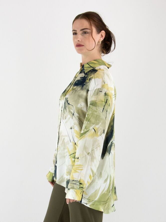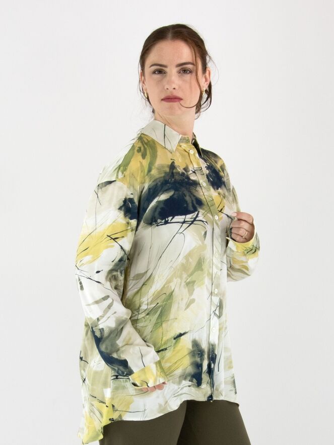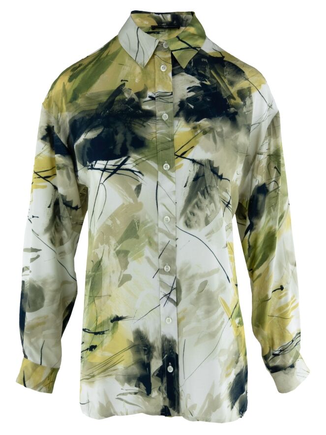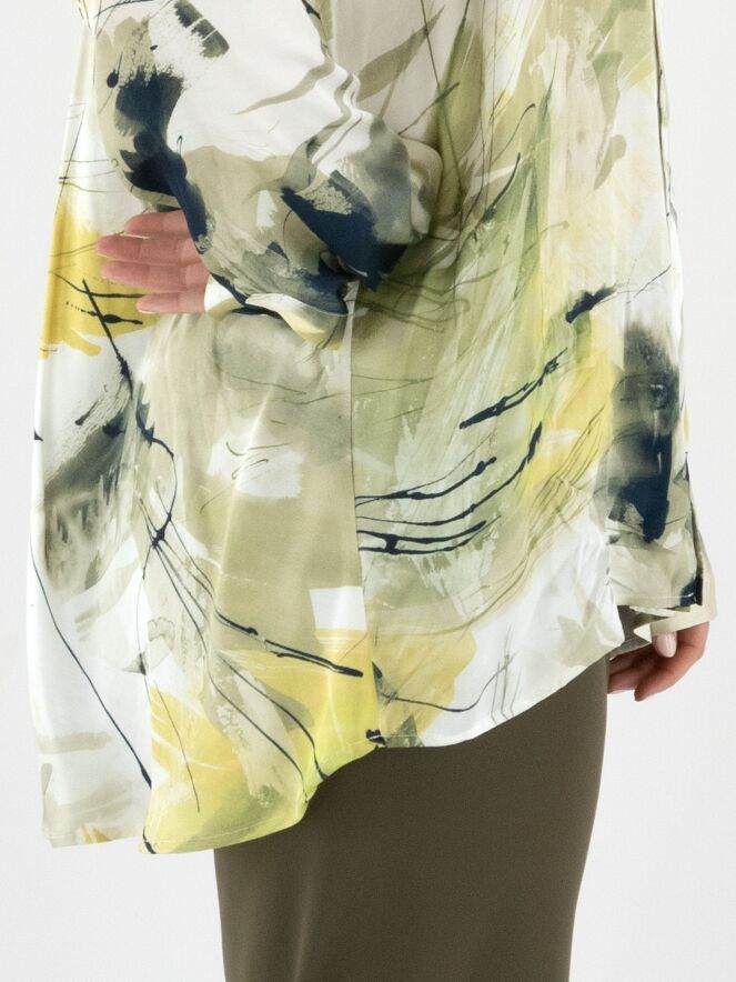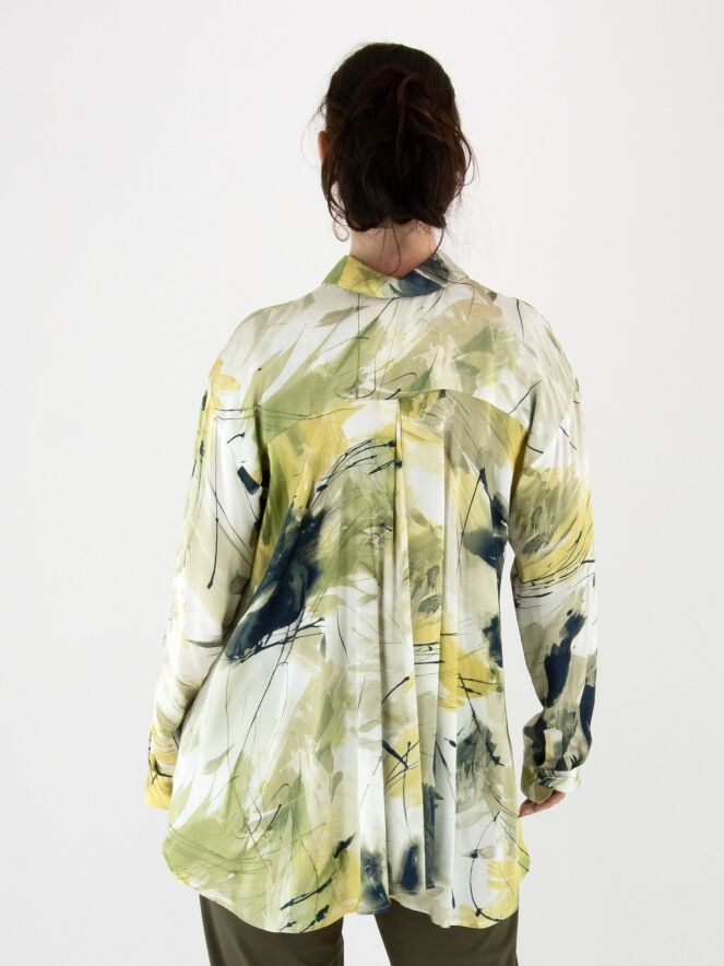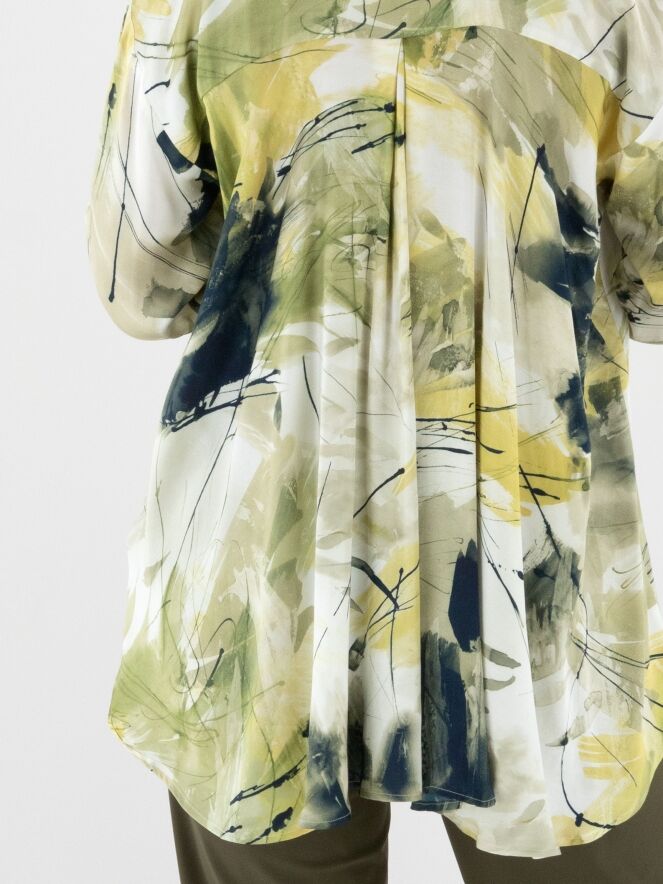 A blouse by High in a graphic print featuring shades of lime green, beige, anthracite, and off-white. At the back, a double pleat flows from the seam beneath the shoulder blades. This blouse should be hand-washed.