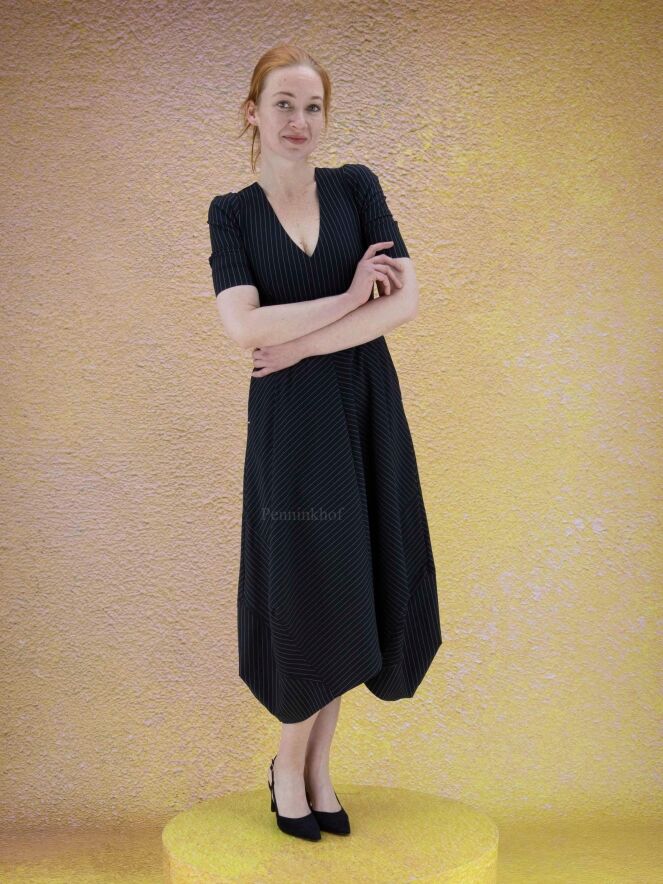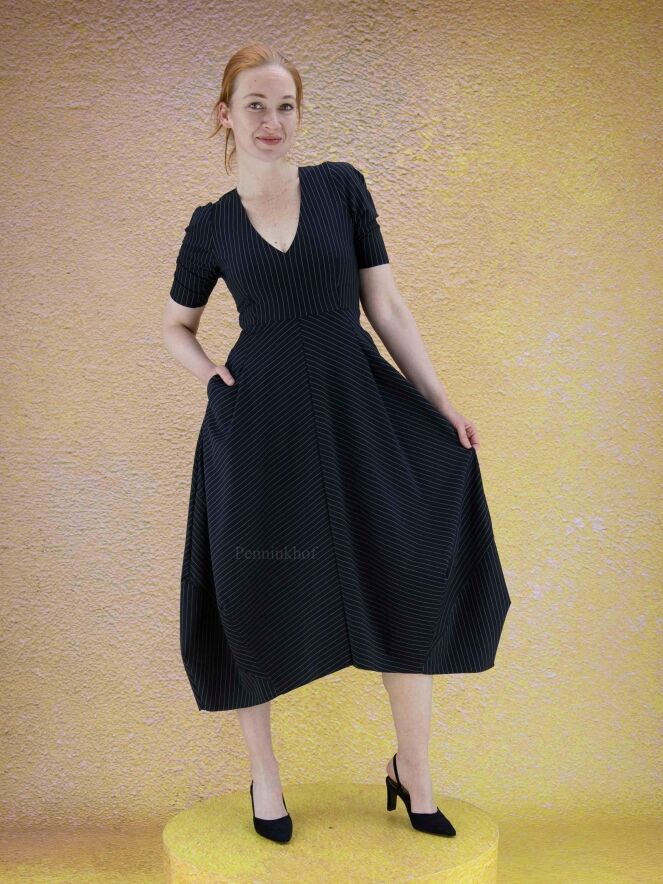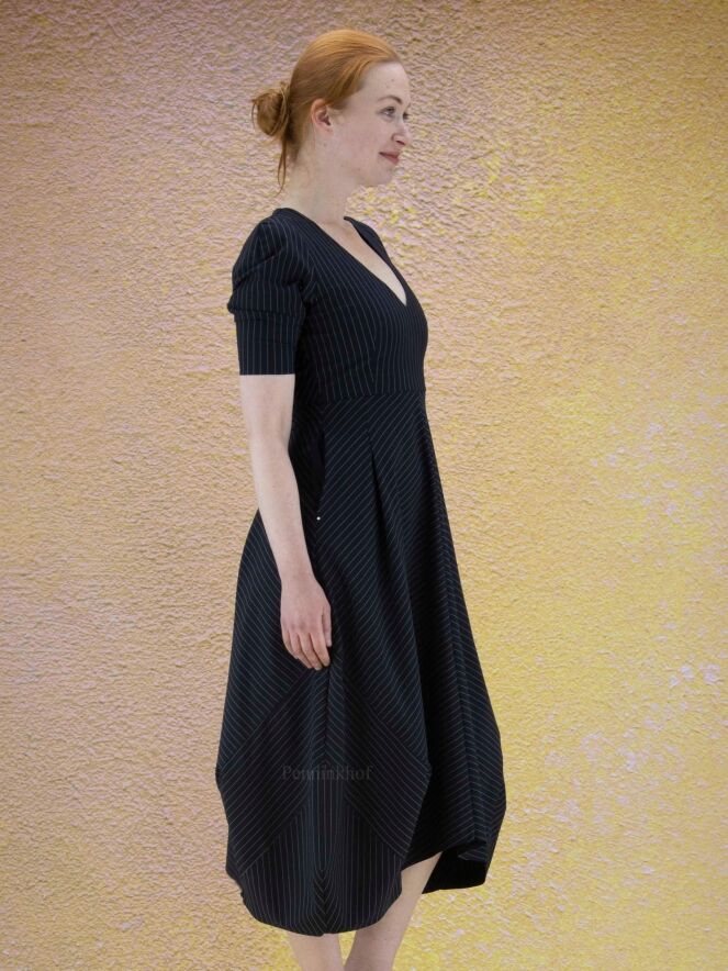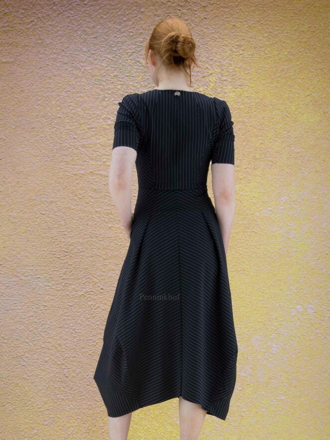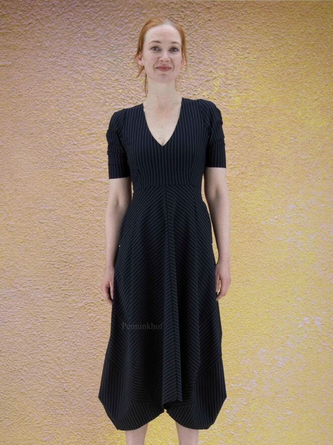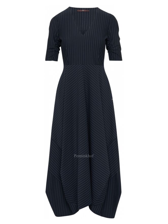 A dress from High in a pinstripe with the colors navy blue and cream white. The dress has a V - Neck and an A - Line from the waist. The stitching at the bottom of the short sleeves is finely pleated. The dress has side pockets and can be washed by hand.