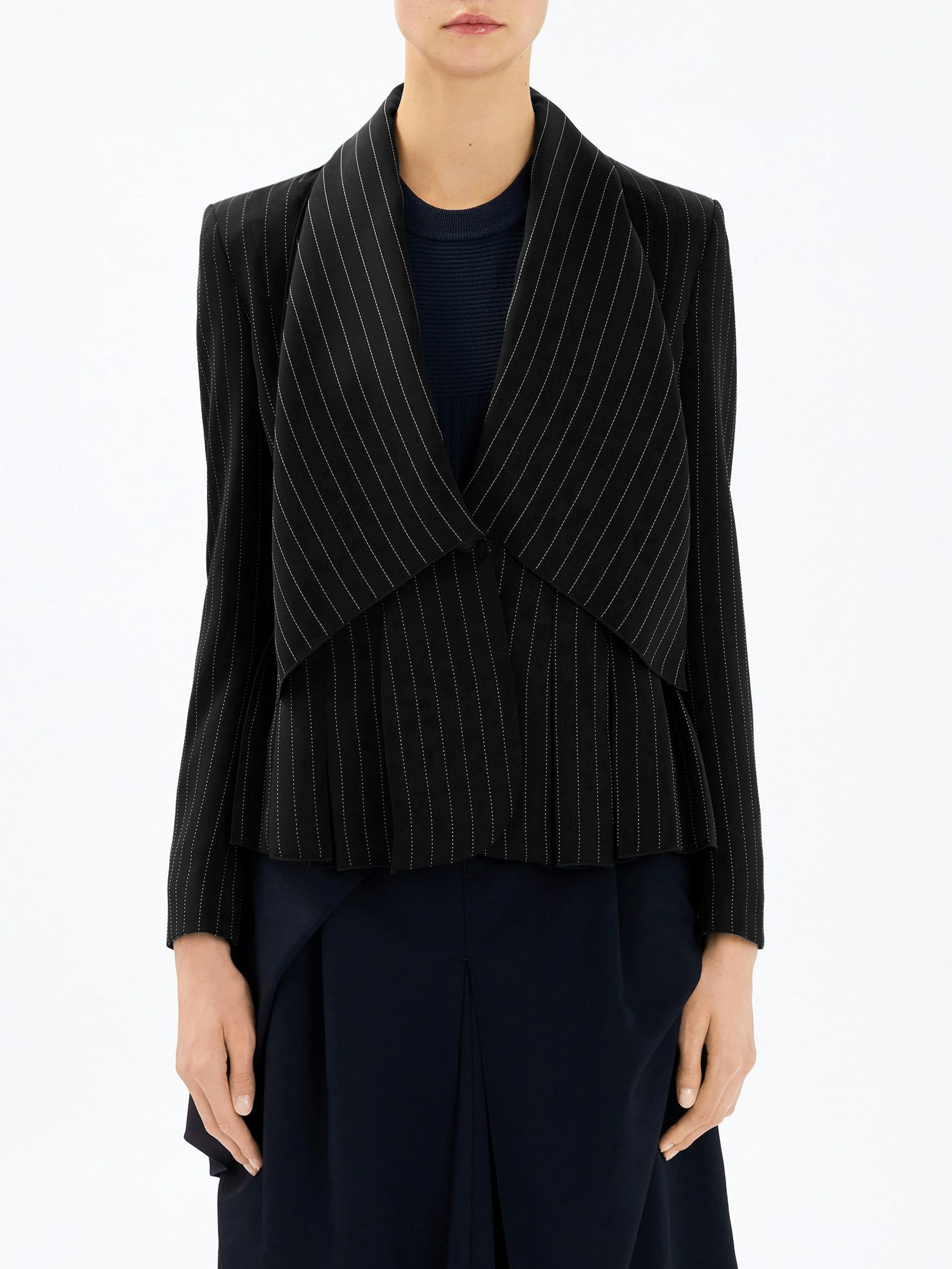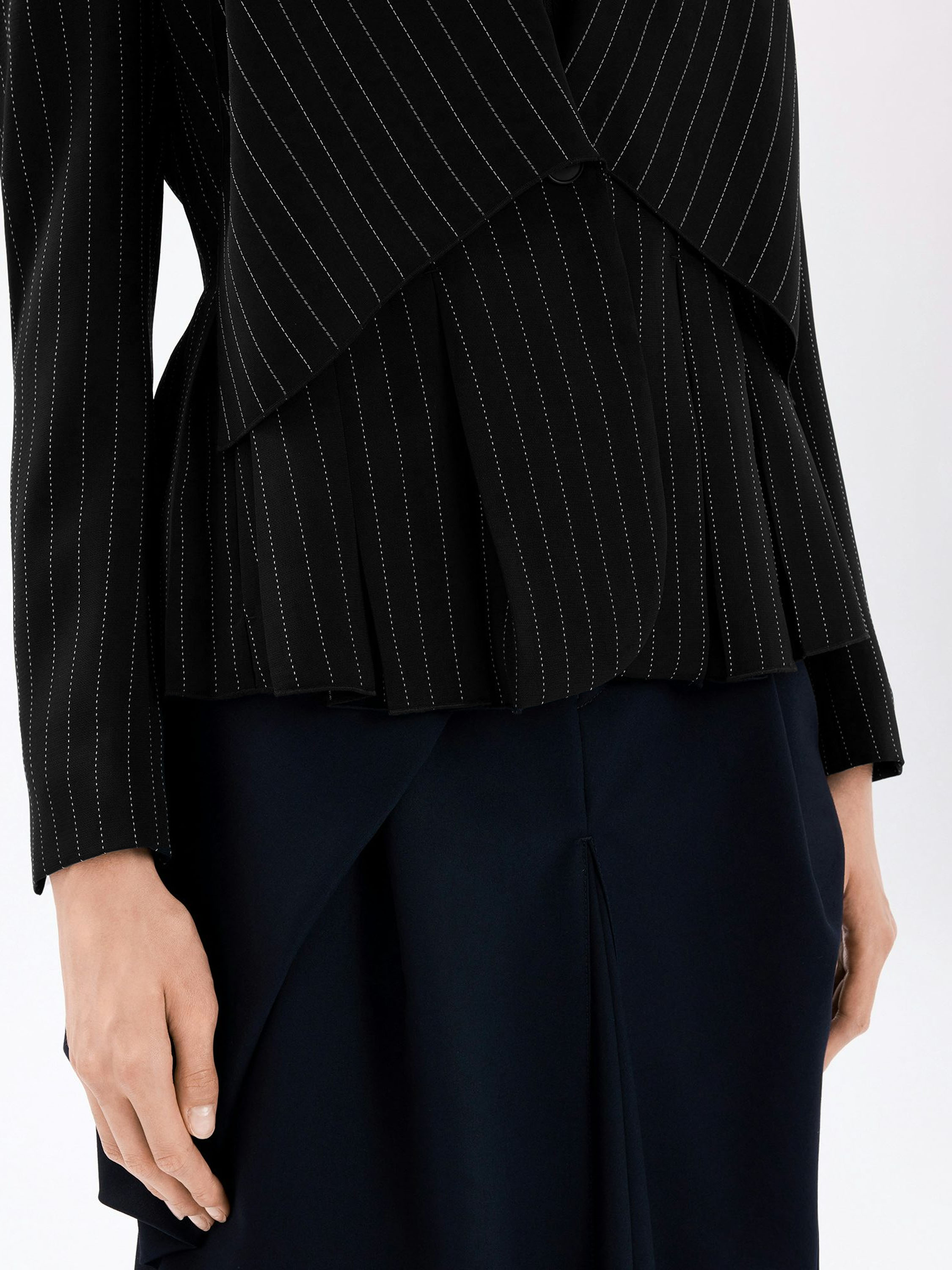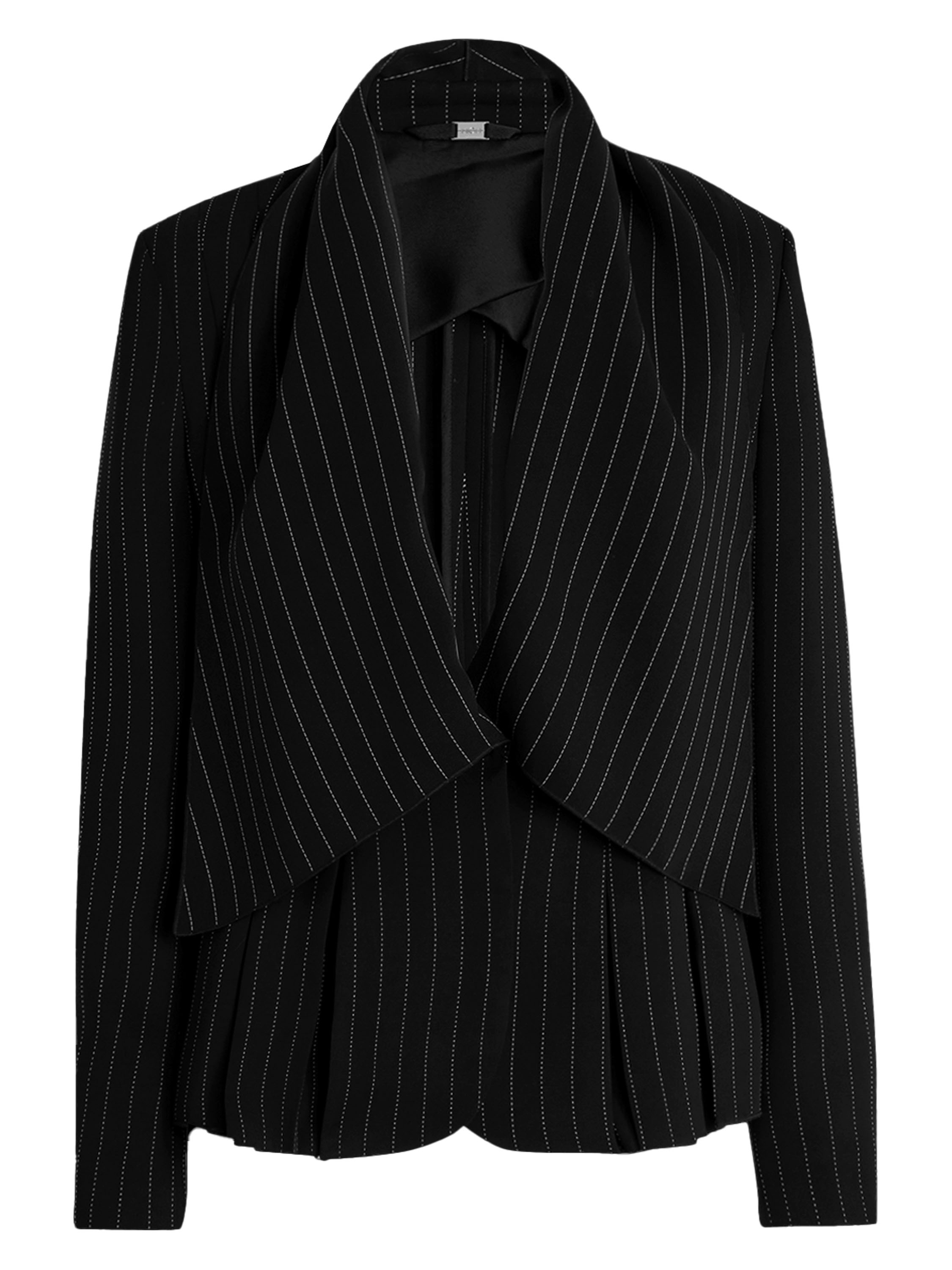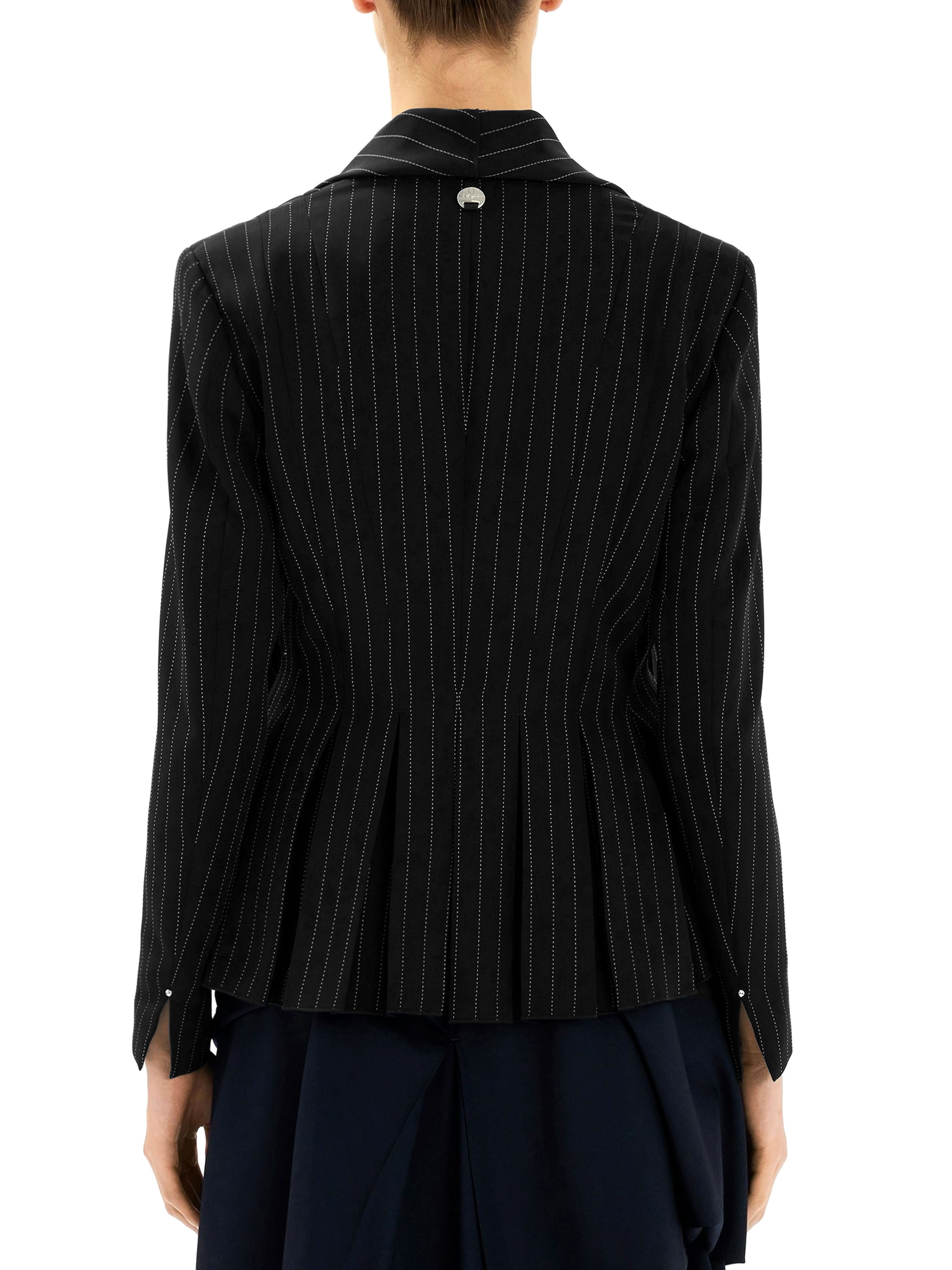 A blazer from High in a chalk-stripe pattern in black with white stitching. The blazer features a wide shawl collar and a single-button fastening. At the ends of the long sleeves, there is a short slit with a silver-coloured stud. Slit pockets are placed at waist level. At the back, multiple pleats originate from the waist. This blazer must not be washed.