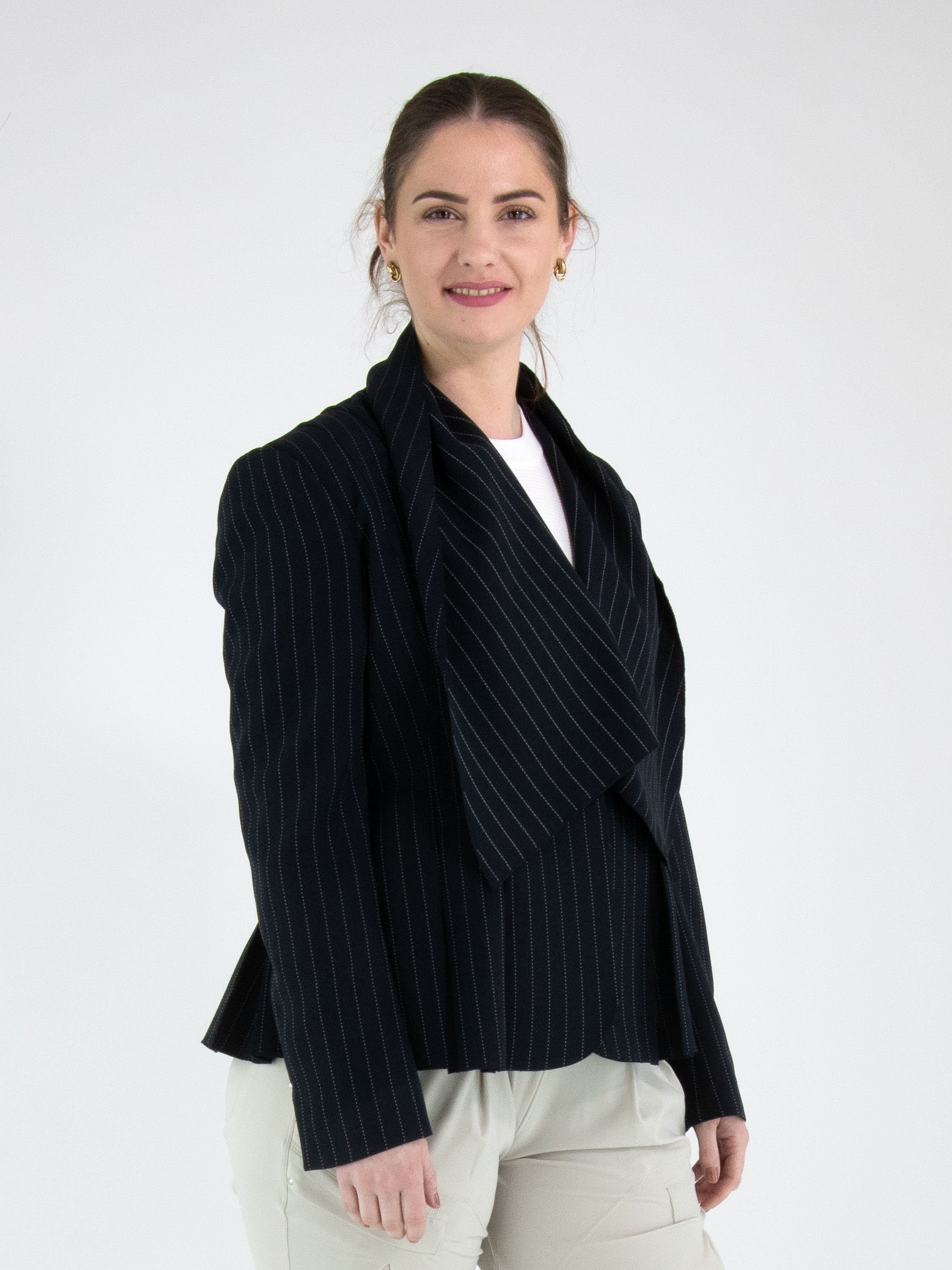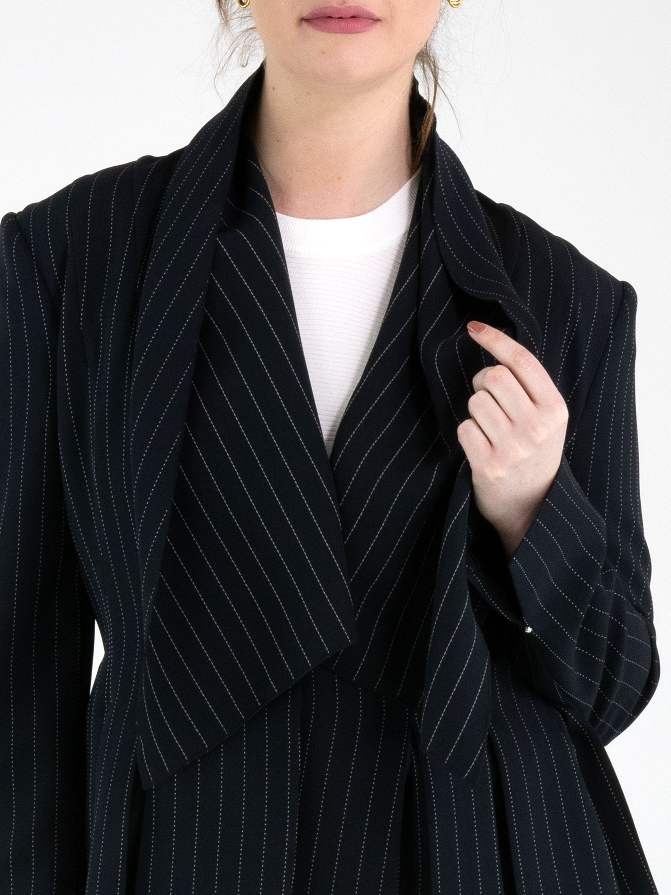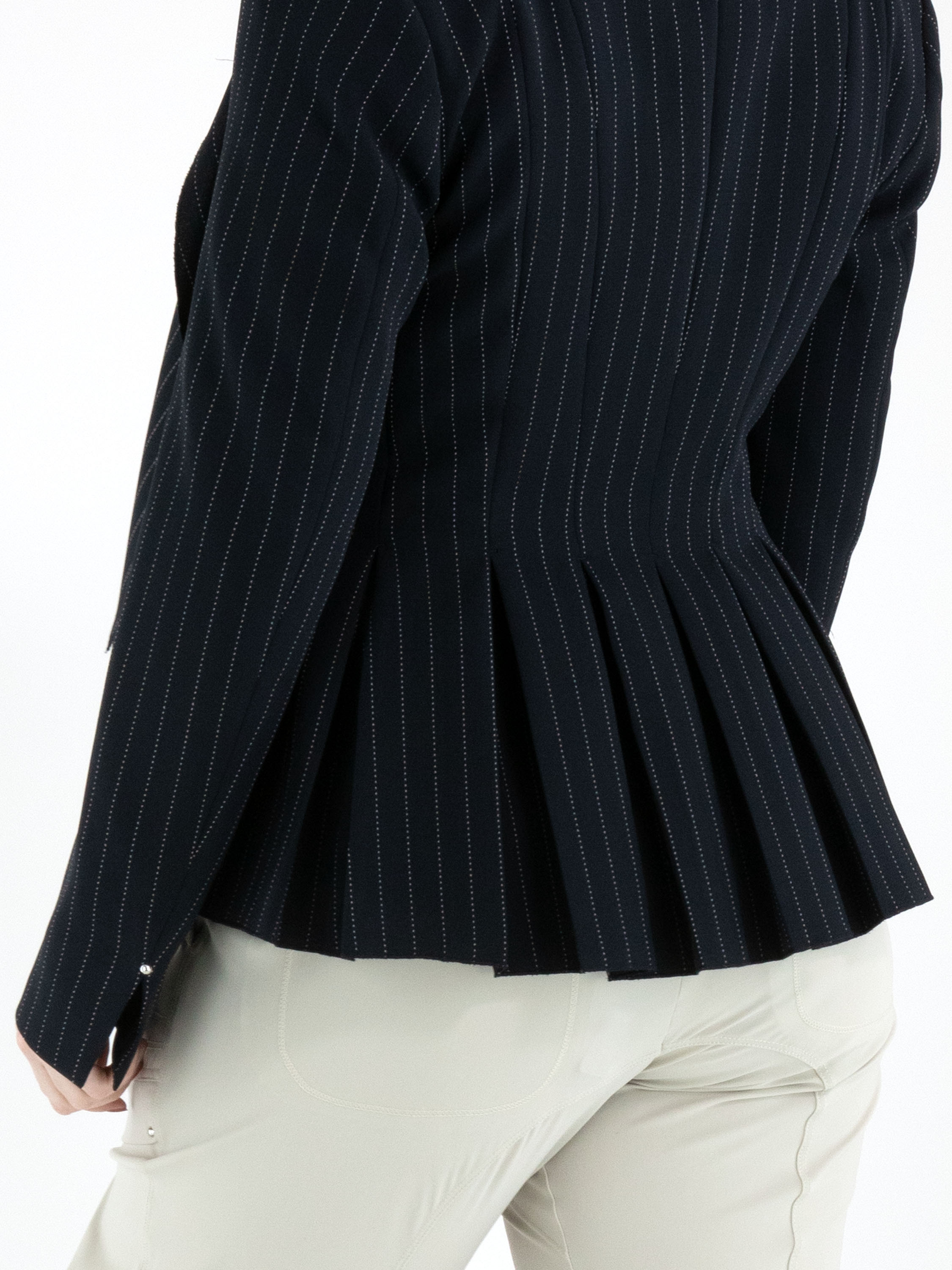 A blazer from High in a navy blue chalk-stripe pattern with white stitching. The blazer features a wide shawl collar and a single-button fastening. At the ends of the long sleeves, there is a short slit with a silver-coloured stud. Slit pockets are positioned at waist level. At the back, multiple pleats originate from the waist. This blazer must not be washed.