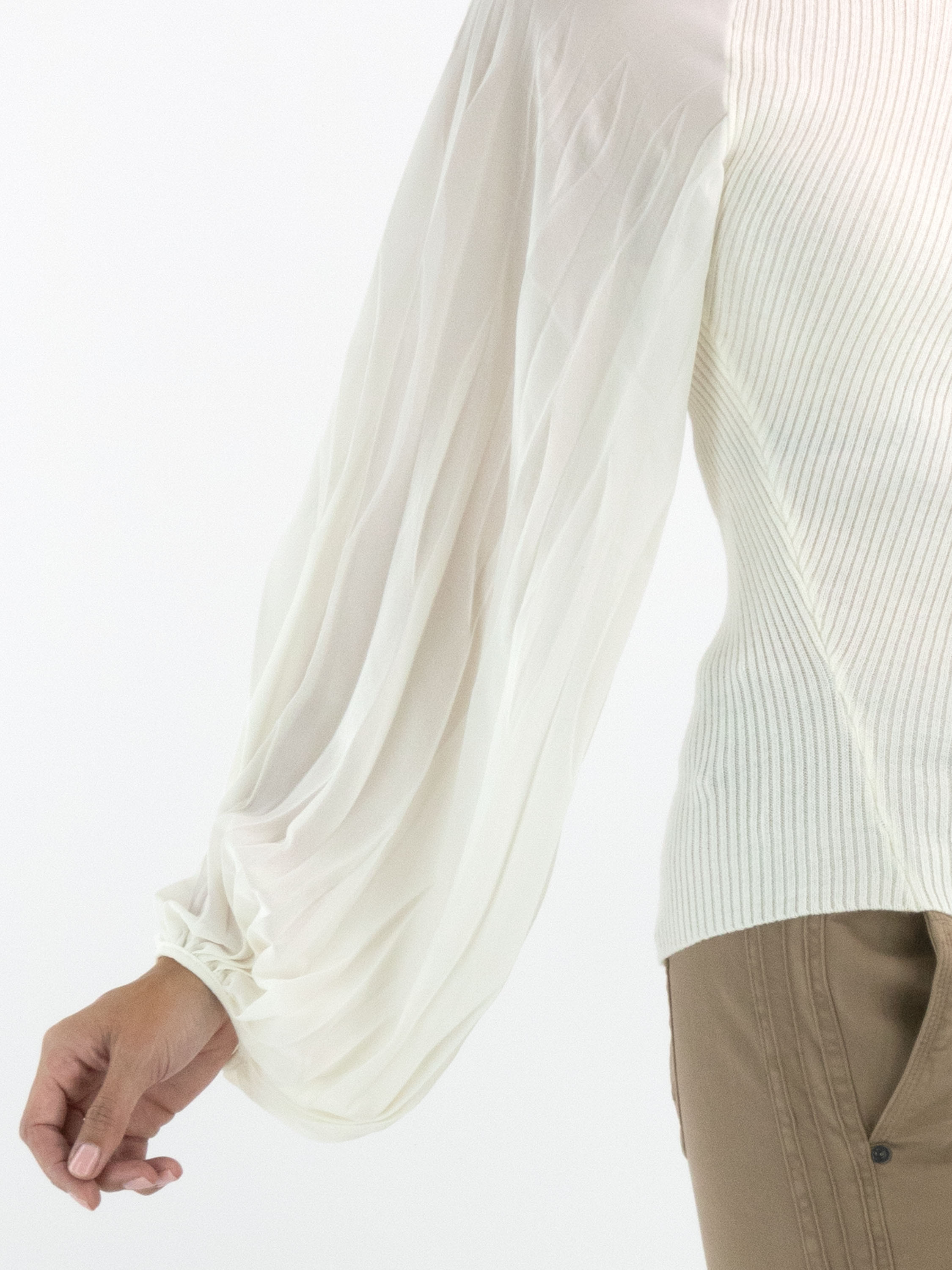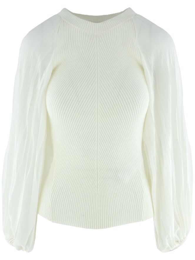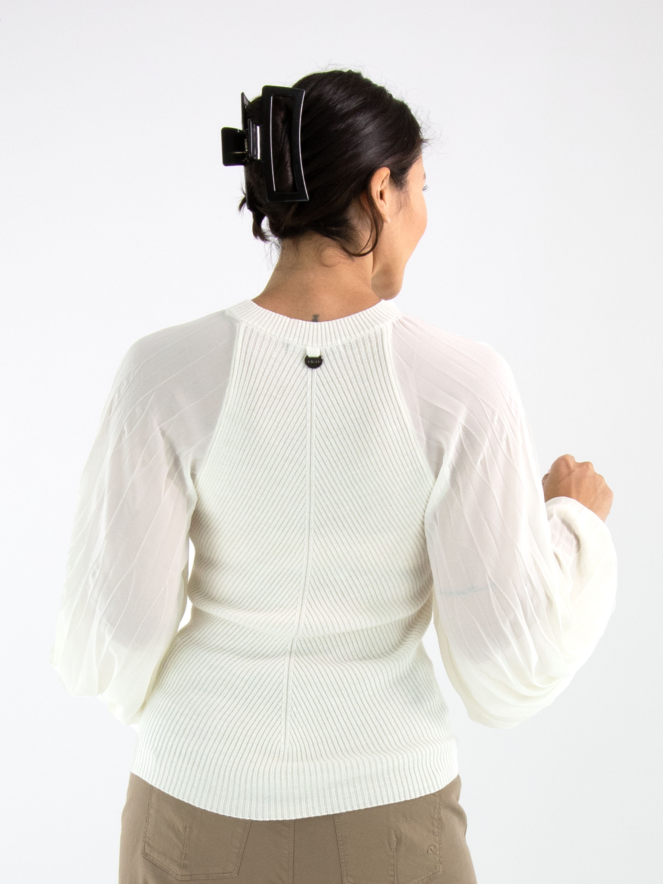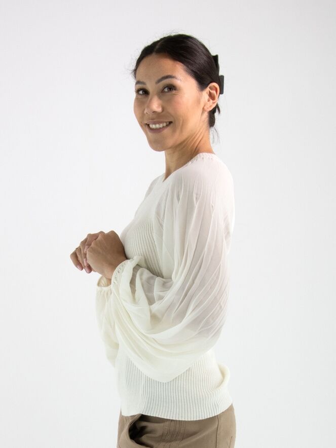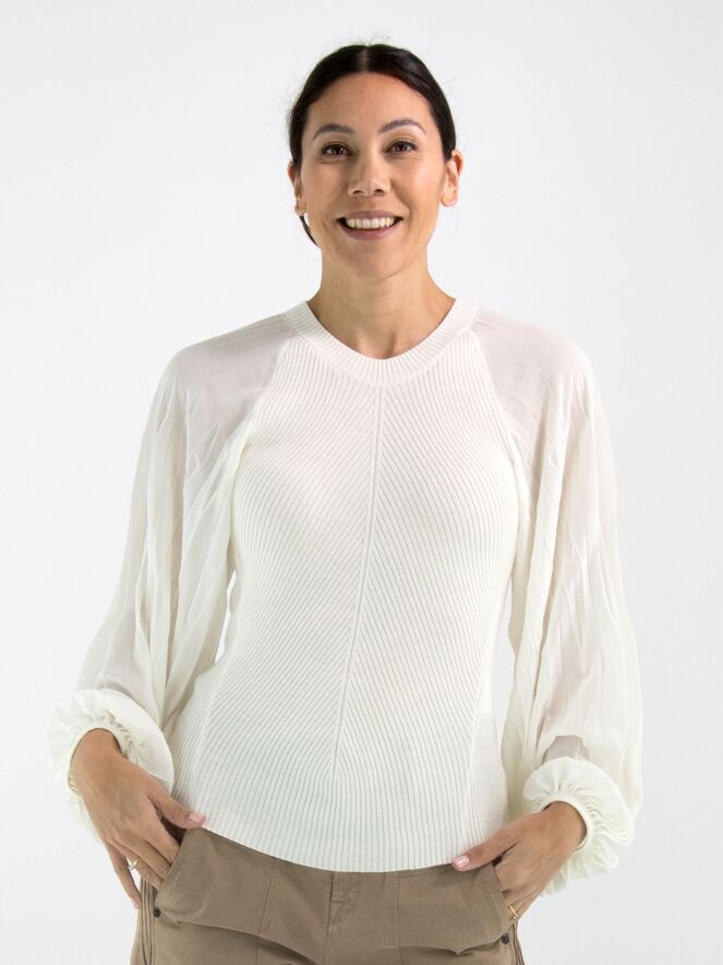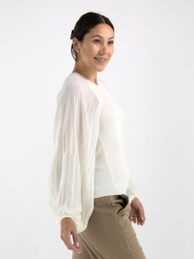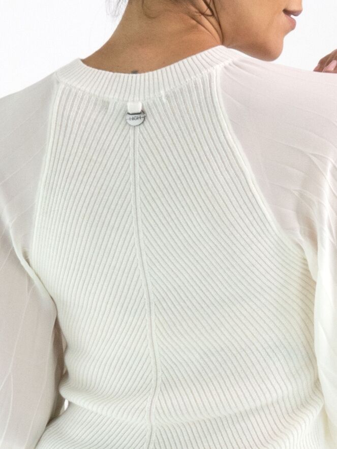 A finely ribbed pullover from High in off-white. The rib structure flows from the center into an elegant herringbone design. The wide voile sleeves are finished with a trim, delicately gathered along the edge, creating an airy and feminine effect. The pullover features a round neckline and can be hand-washed.