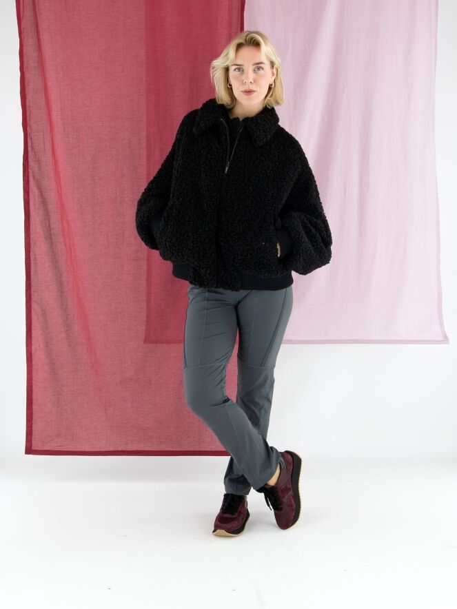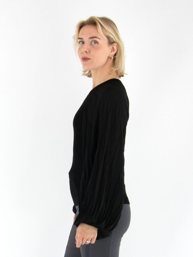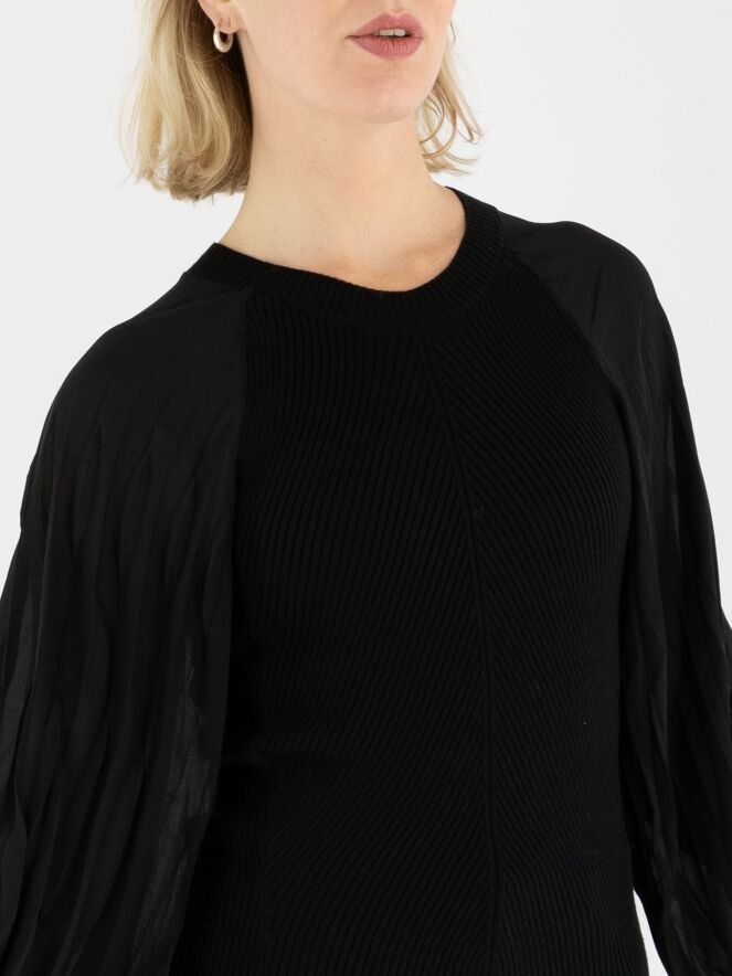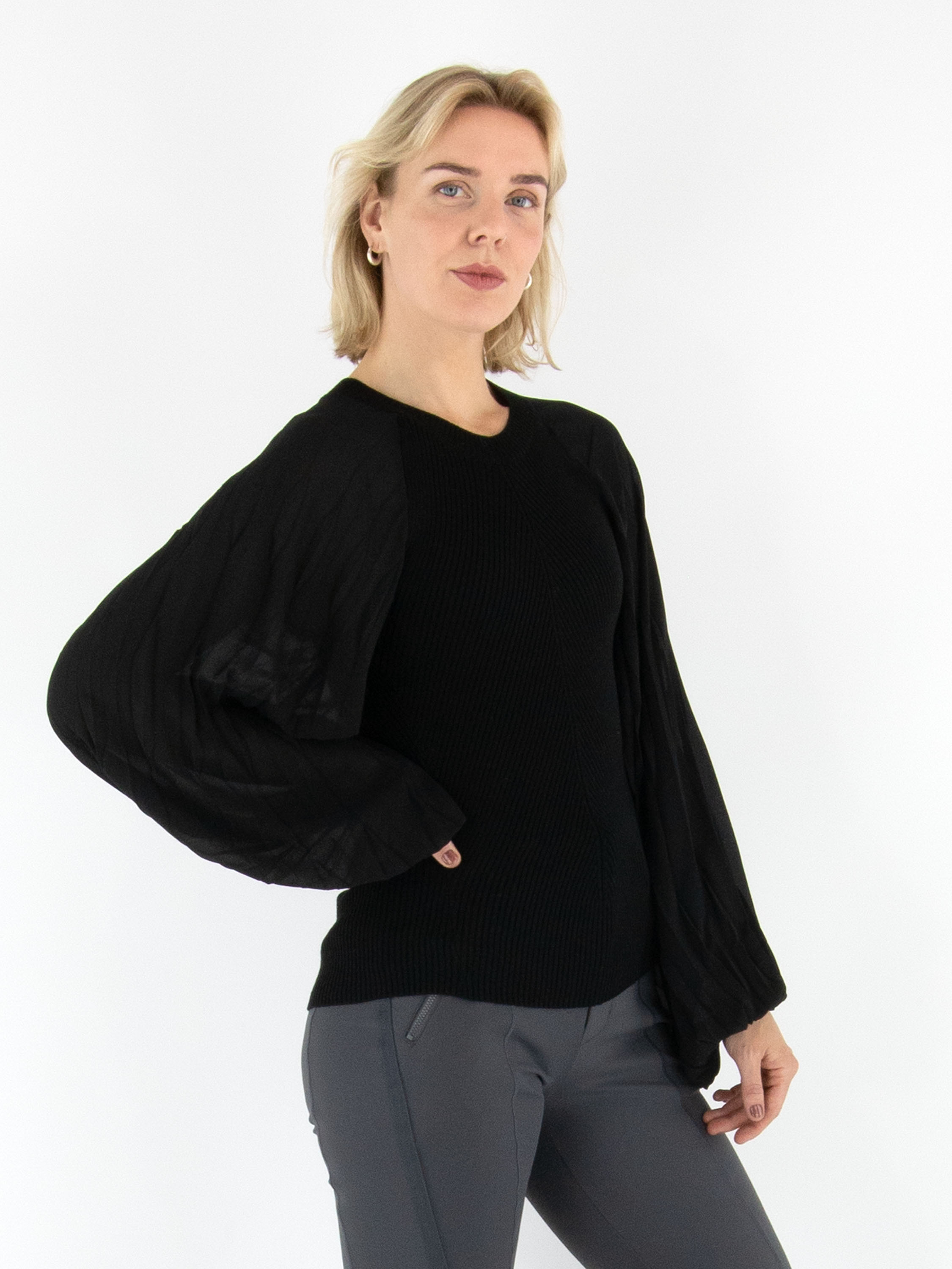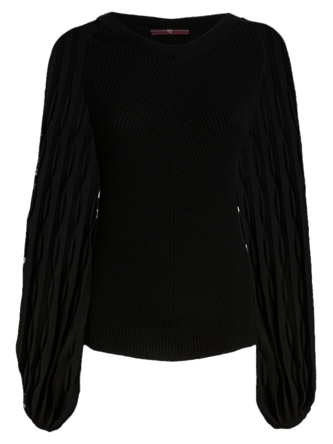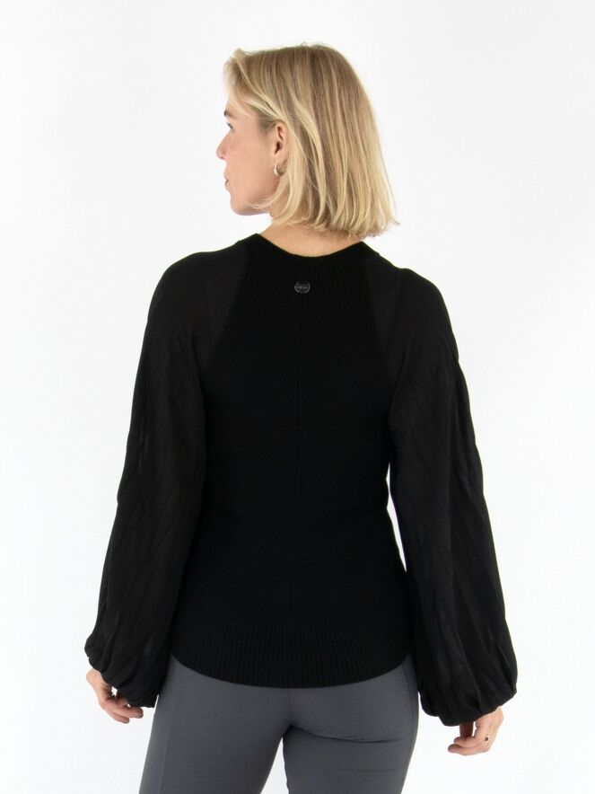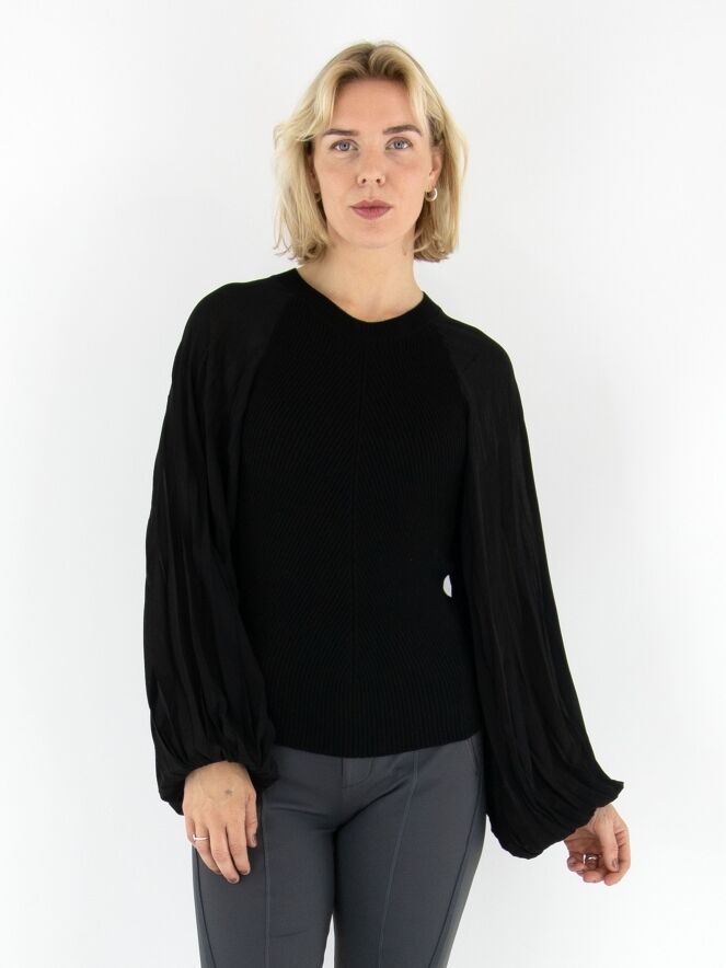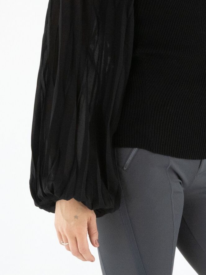 A finely ribbed pullover from High in black. The ribbed lines flow from the center in an elegant herringbone structure. The wide voile sleeves finish in a trim with delicate pleating along the fabric, adding a light and feminine touch. The pullover features a round neckline and can be hand-washed.