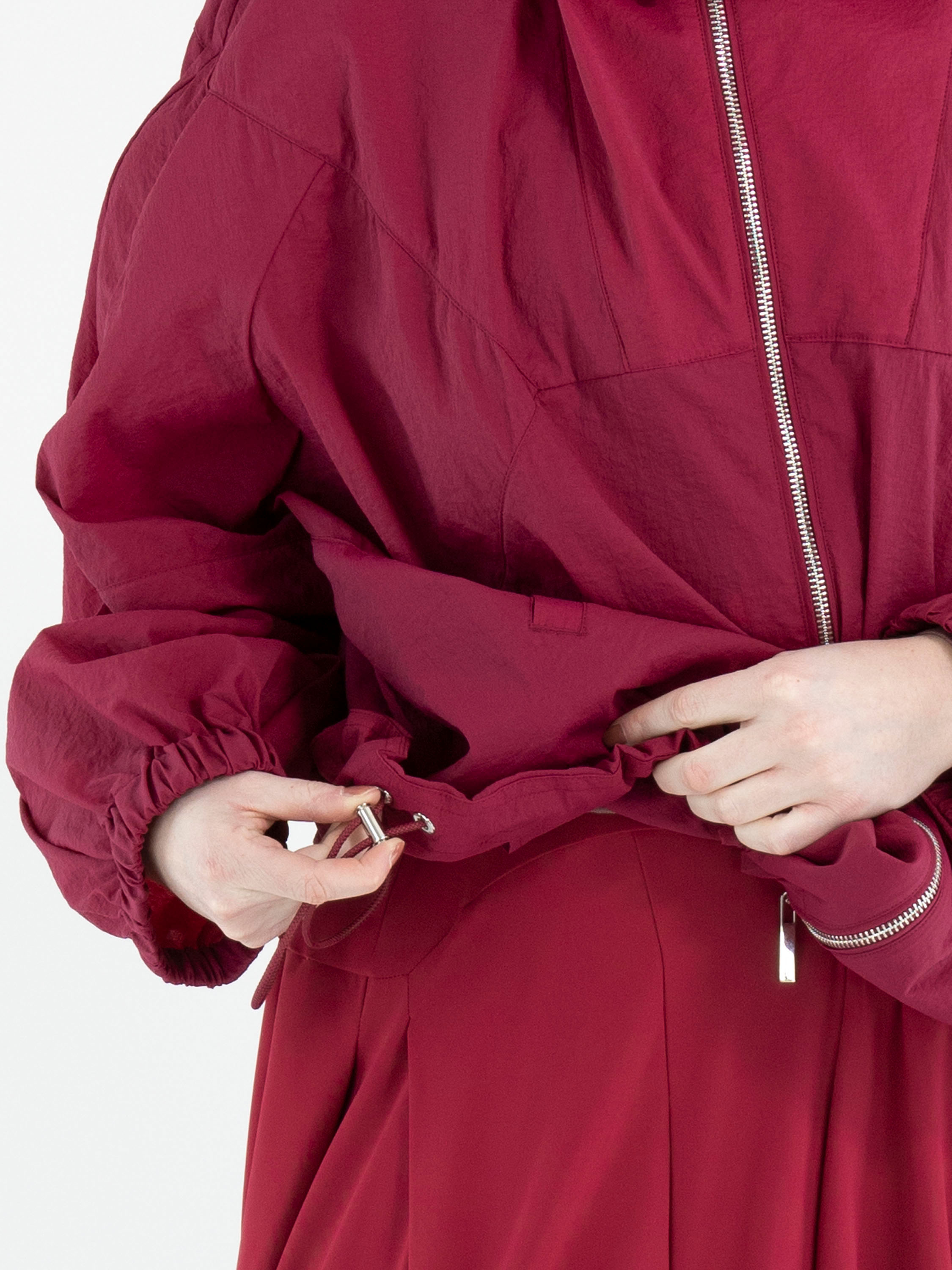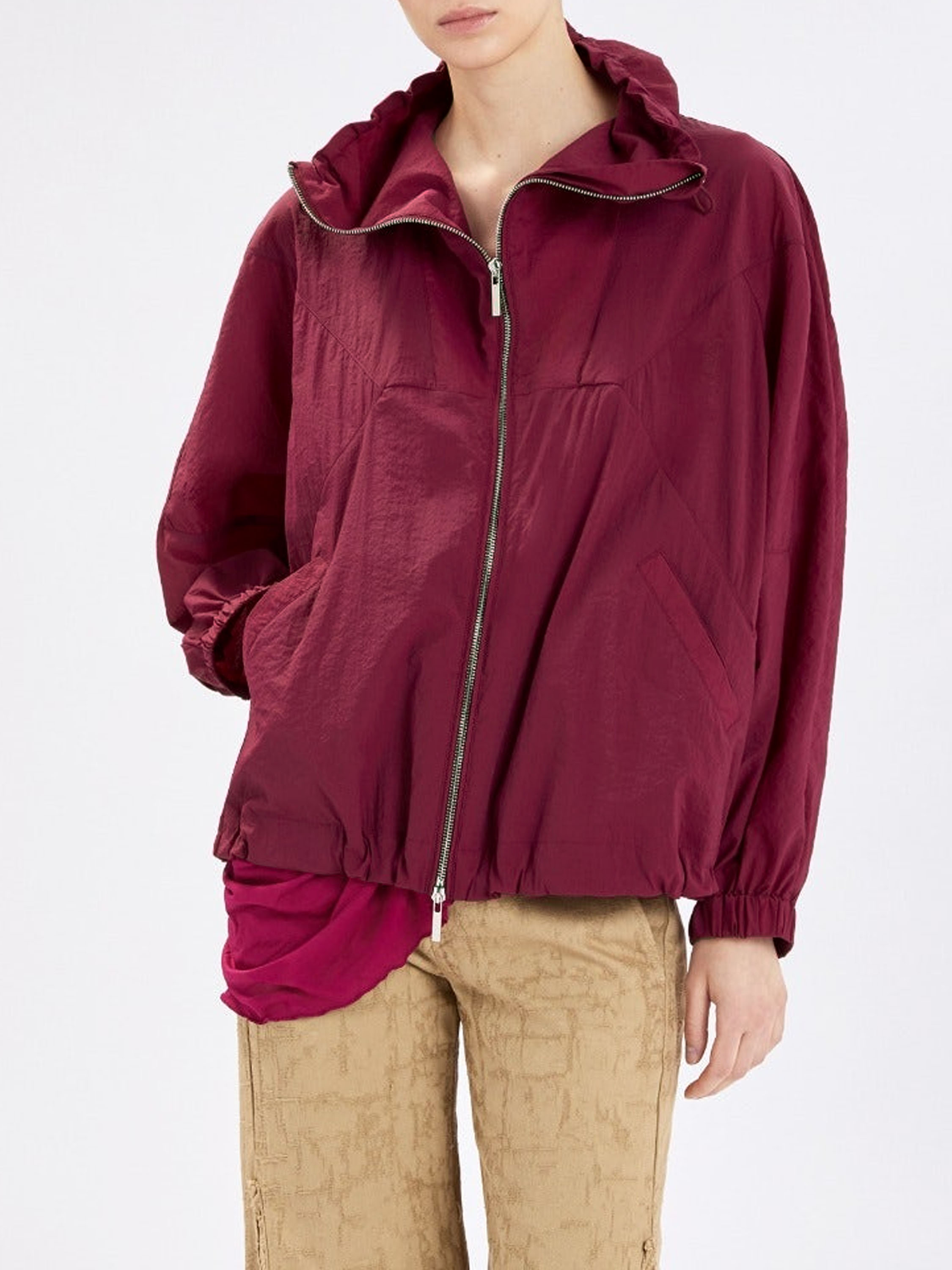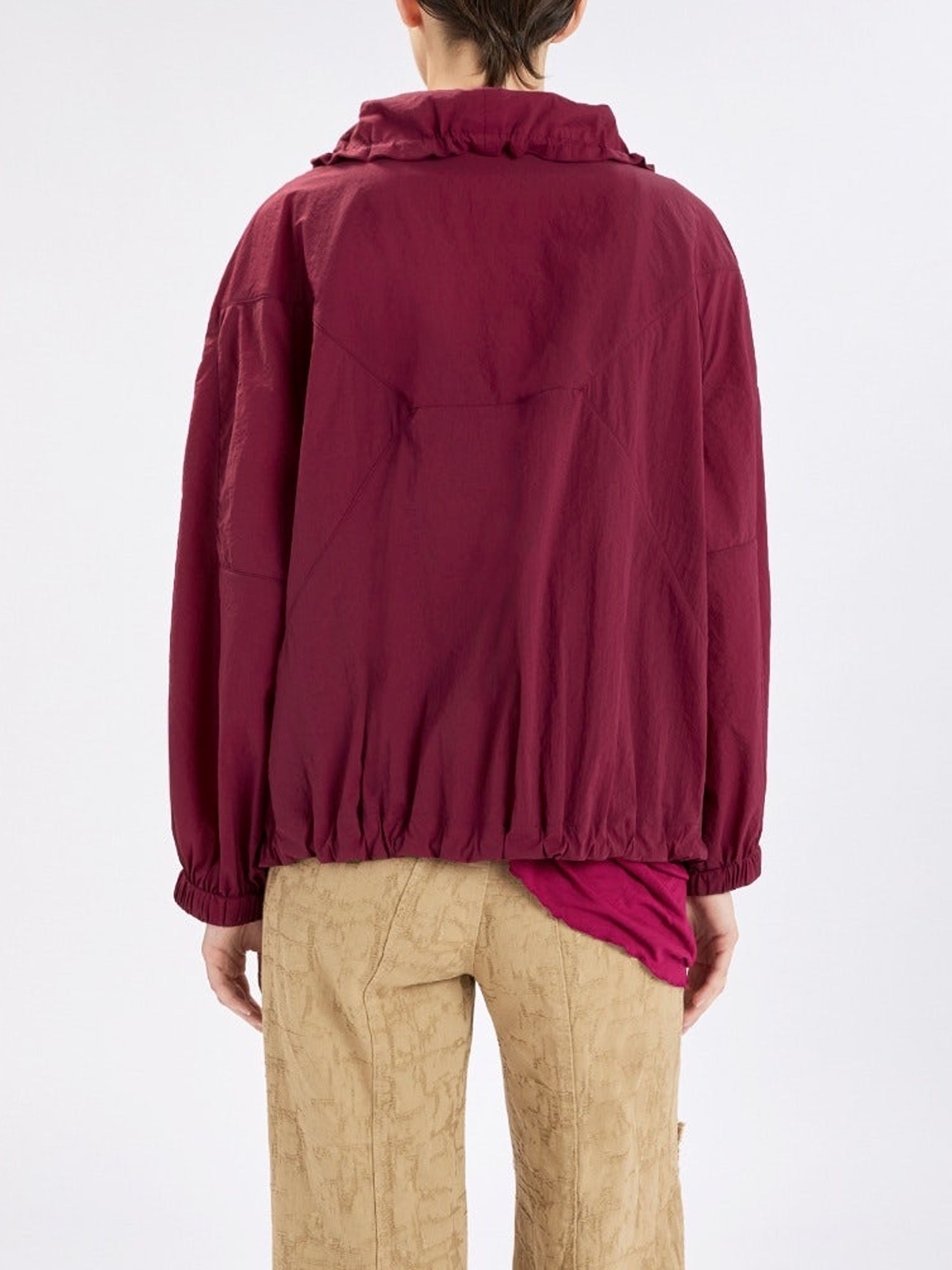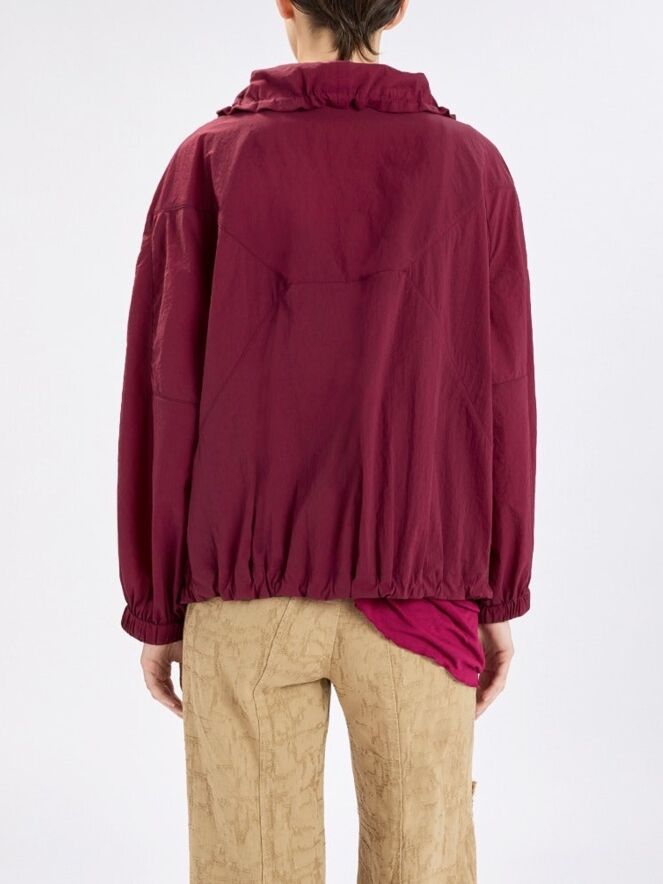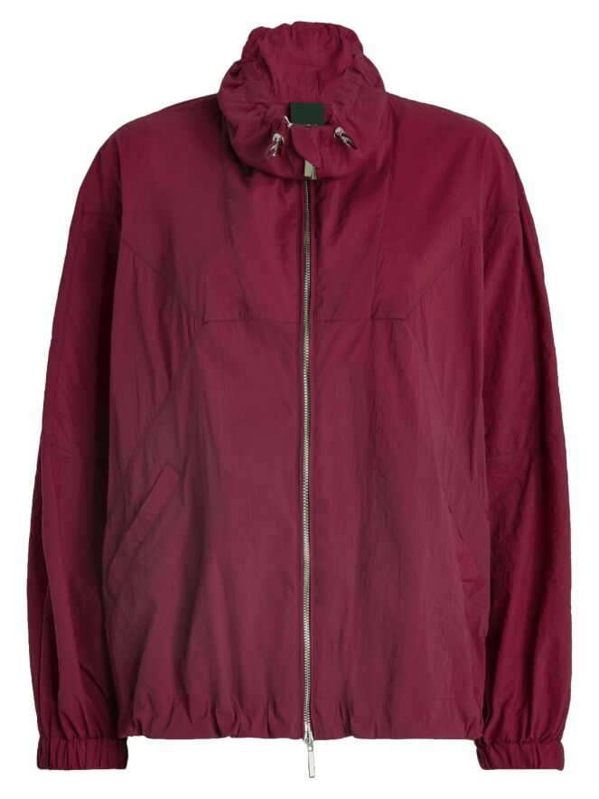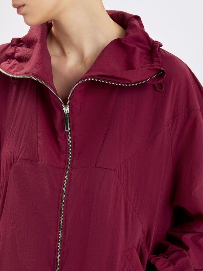 A coat from High in a raspberry red colour. Along the edge of the collar and at the hem, a drawstring runs through a tunnel construction, allowing a pleated effect to be created. The edges of the long sleeves are finished with a finely pleated elastic band. The coat features slit pockets with silver-coloured zip fastenings. This coat can be hand-washed.