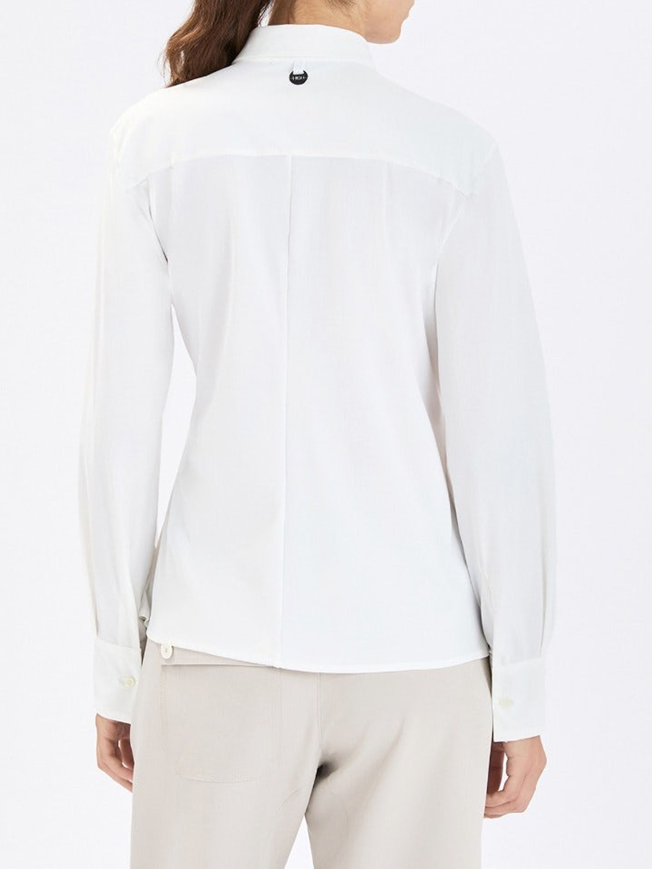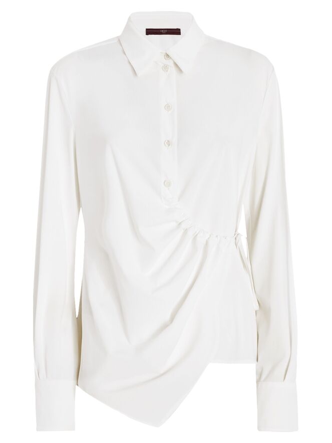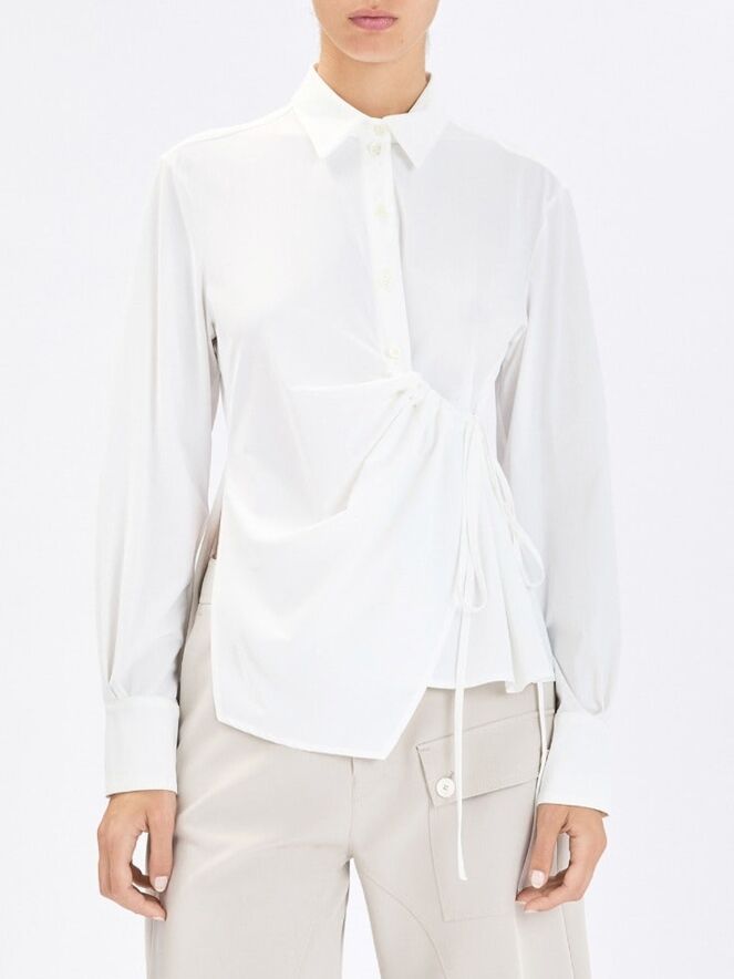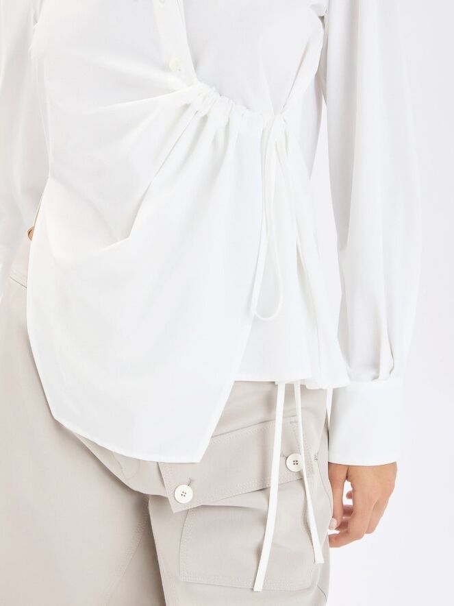 Blouse by High in an elegant off-white shade. The button closure runs from the neckline to just below the bust. From that point, a drawstring integrated into a tunnel allows for a subtle pleated effect. A second ribbon at the waist can be tied into a bow, creating a distinctive asymmetrical silhouette. This exclusive designer blouse can be washed at 30 degrees.