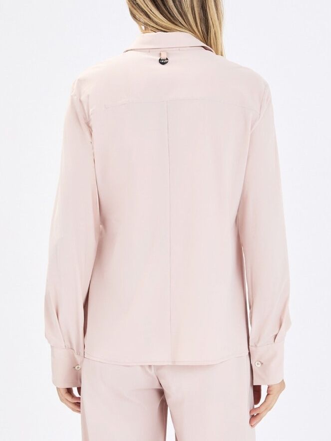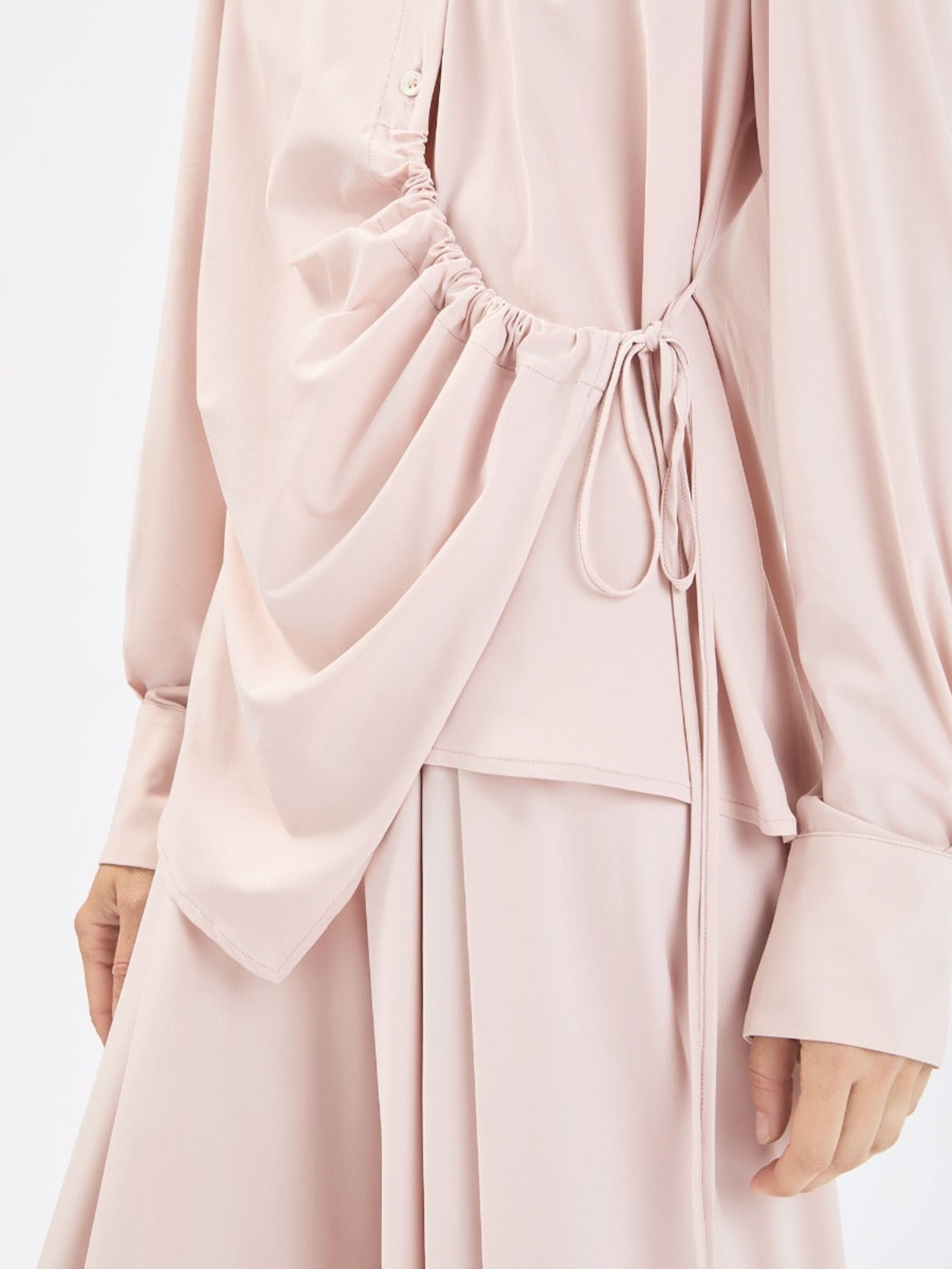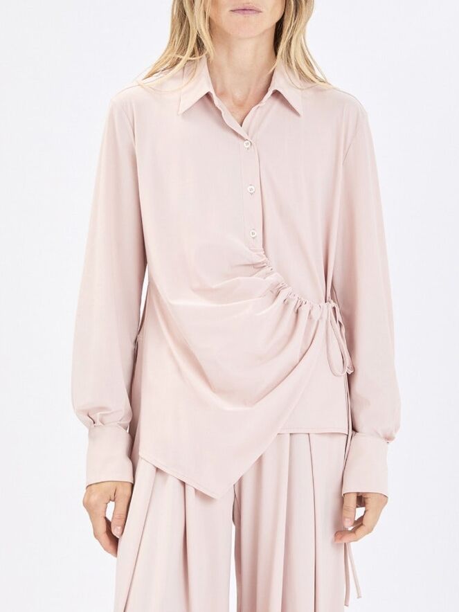 Blouse by High in a soft powder pink shade. The button closure runs from the neckline to just below the bust. From that point, a drawstring tunnel detail allows for a subtle pleated effect, while a second ribbon at the waist can be tied into a bow, creating a playful asymmetrical silhouette. This exclusive designer blouse can be washed at 30 degrees.