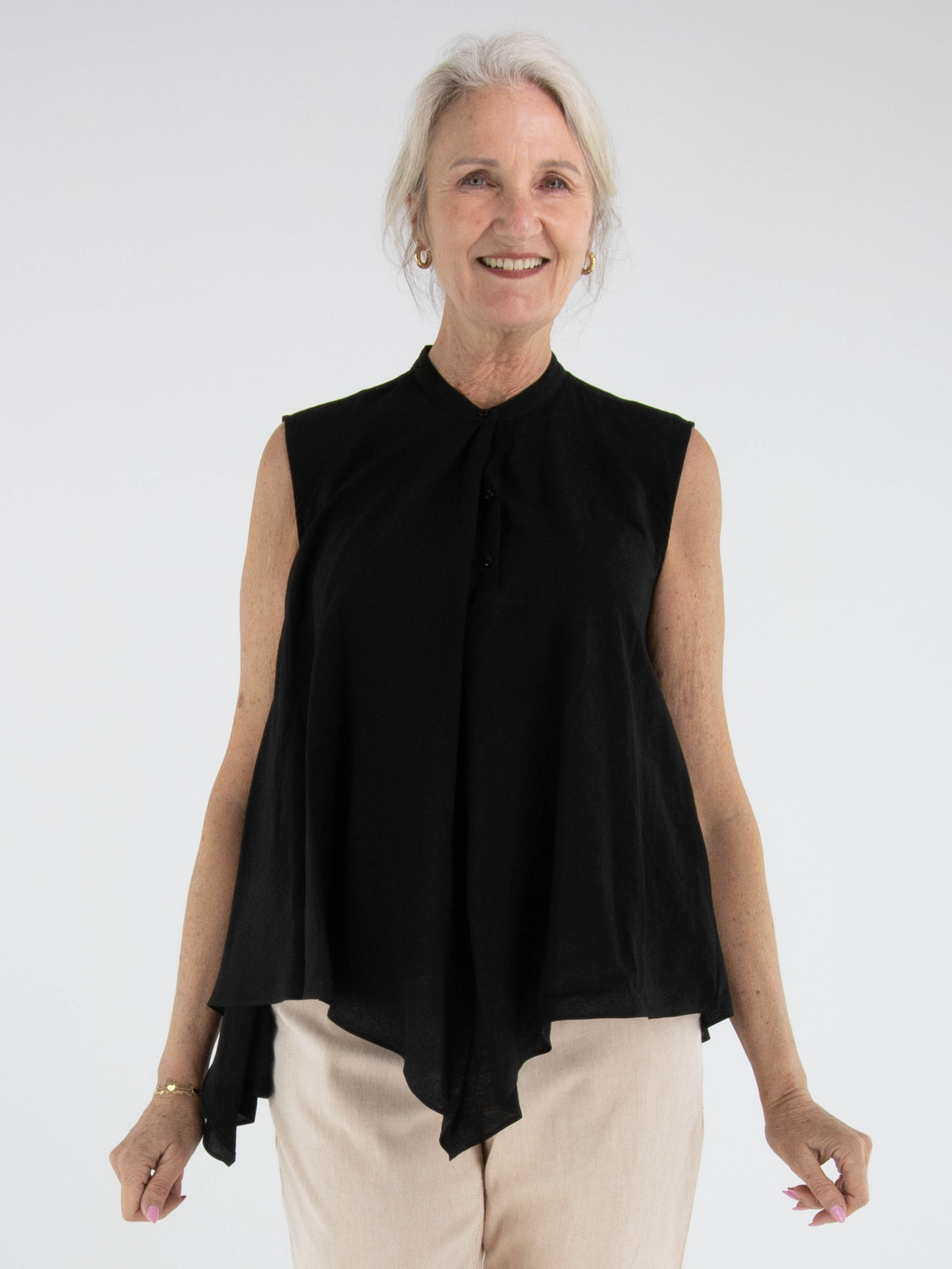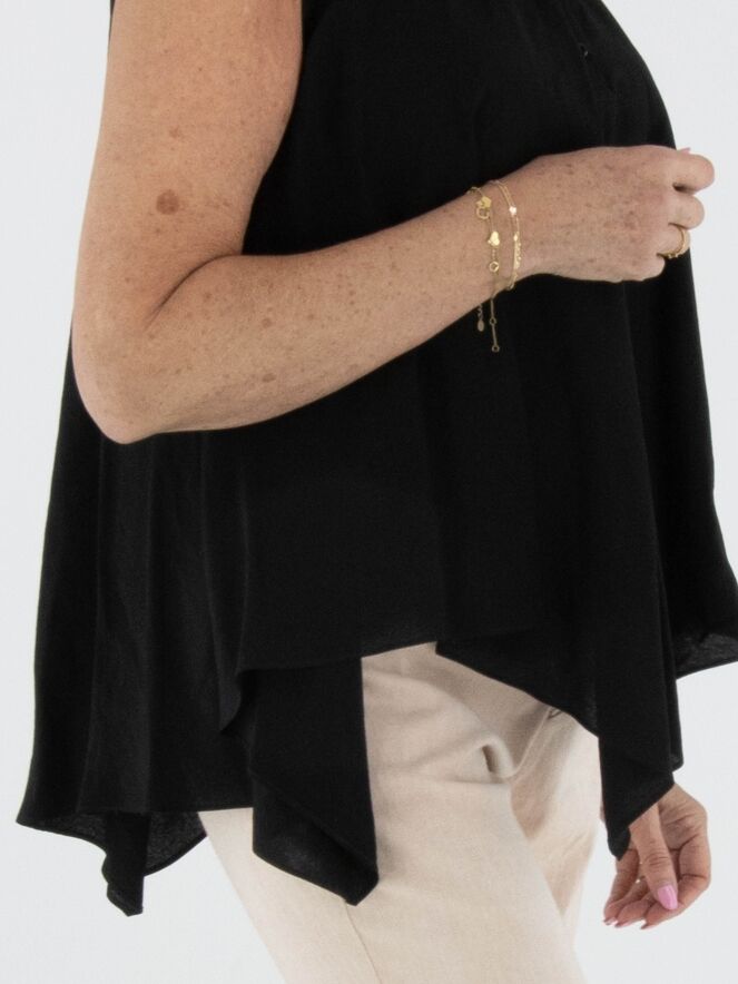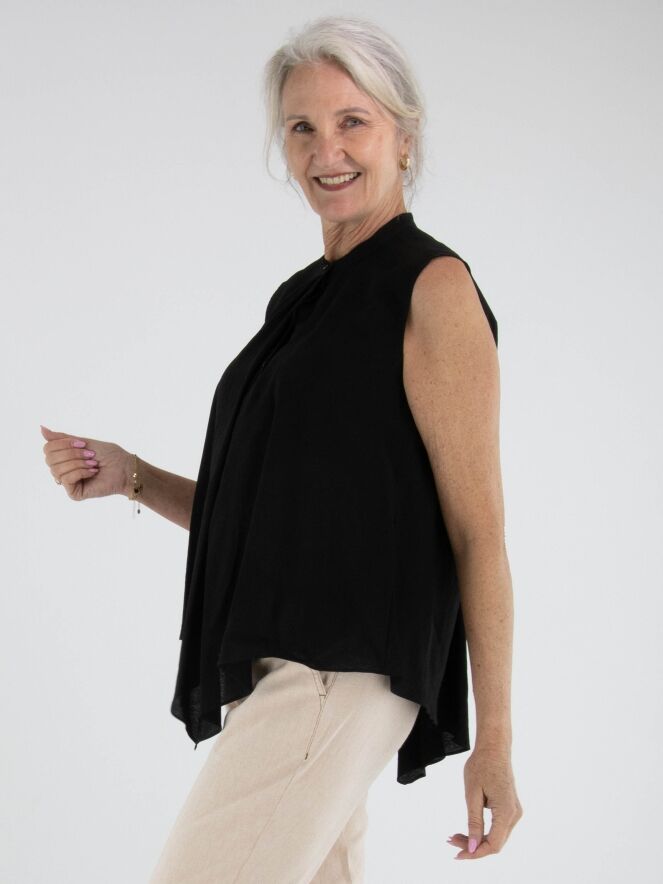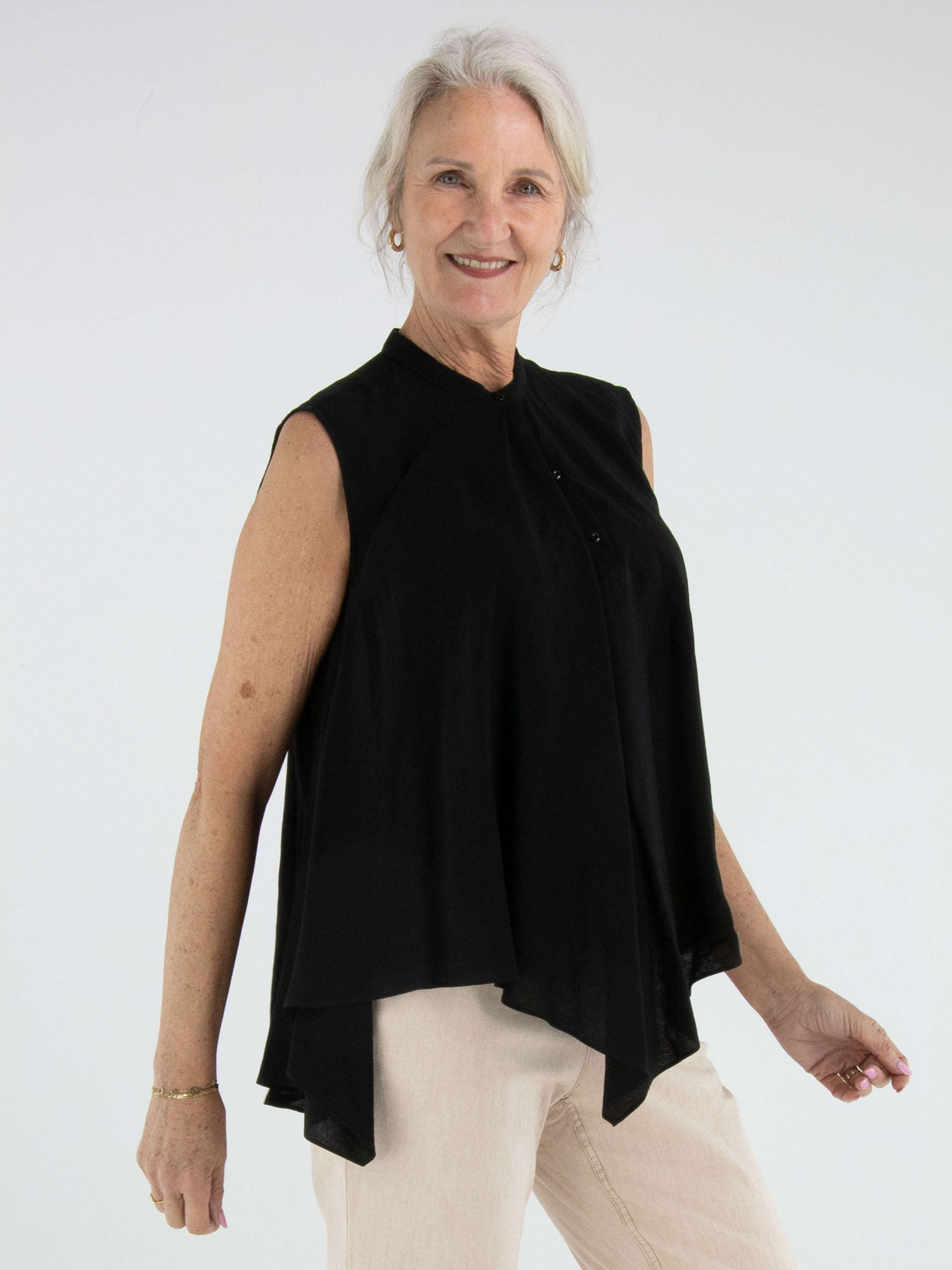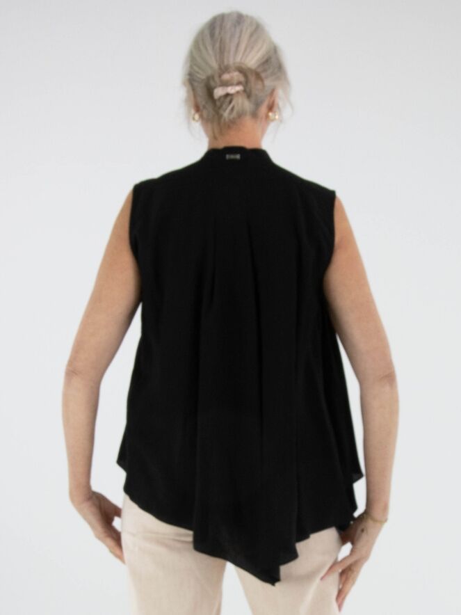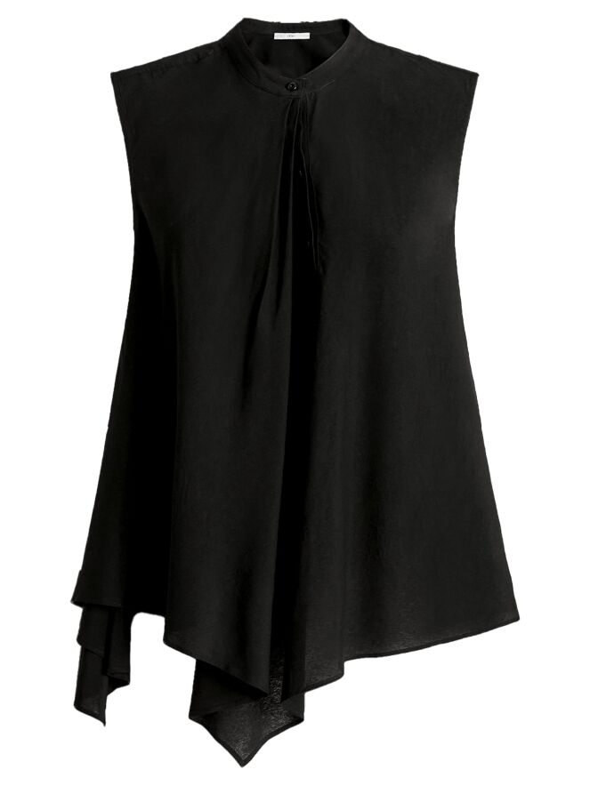 A High top in black. At the center front of the round neckline, a button closure extends to just above the bust. An overlapping panel with a pleated effect drapes towards the right side of the top, creating a refined and architectural silhouette. The back is slightly longer than the front. This piece should be hand washed.